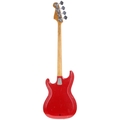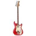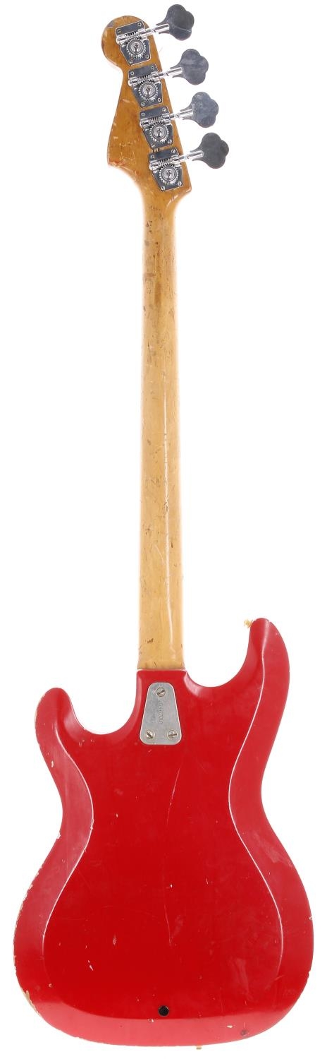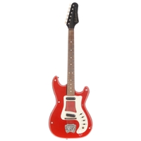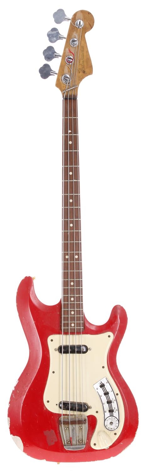 1960s Hagstrom Futurama Deluxe bass guitar, made in Sweden; Body: red finish, heavy finish loss to edges, dings and other scratches throughout; Neck: heavy wear to back, head face adapted to fit replacement Precision type tuners; Fretboard: rosewood; Frets: worn; Electrics: working although low output; Hardware: missing volume knob, missing one bridge pickup adjustment screw, replacement Precision style tuners, damage to strap buttons; Weight: 3.17kg; Overall condition: poor