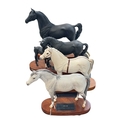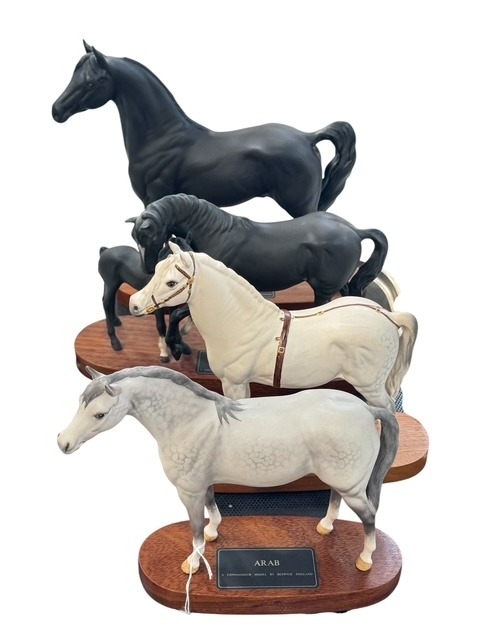 Four Beswick horses on wooden plinth; Morgan Horse, 'Tarryall Maestro', Black Beauty & Foal, Gredington Simwnt and Arab.