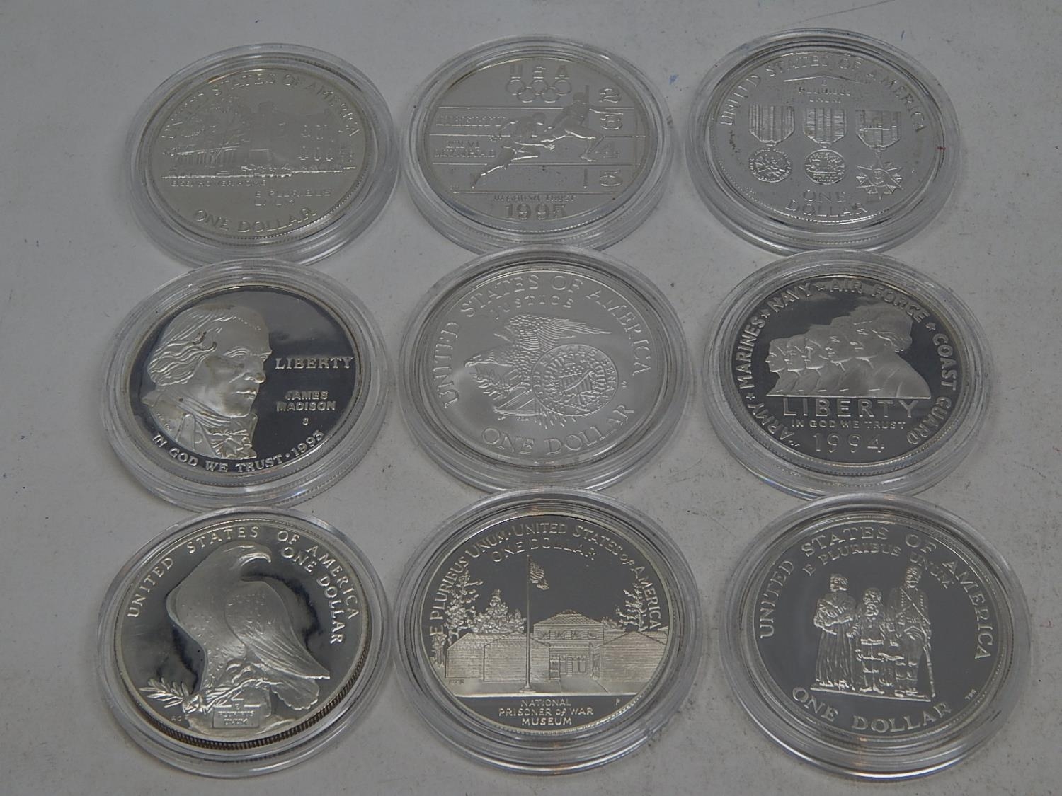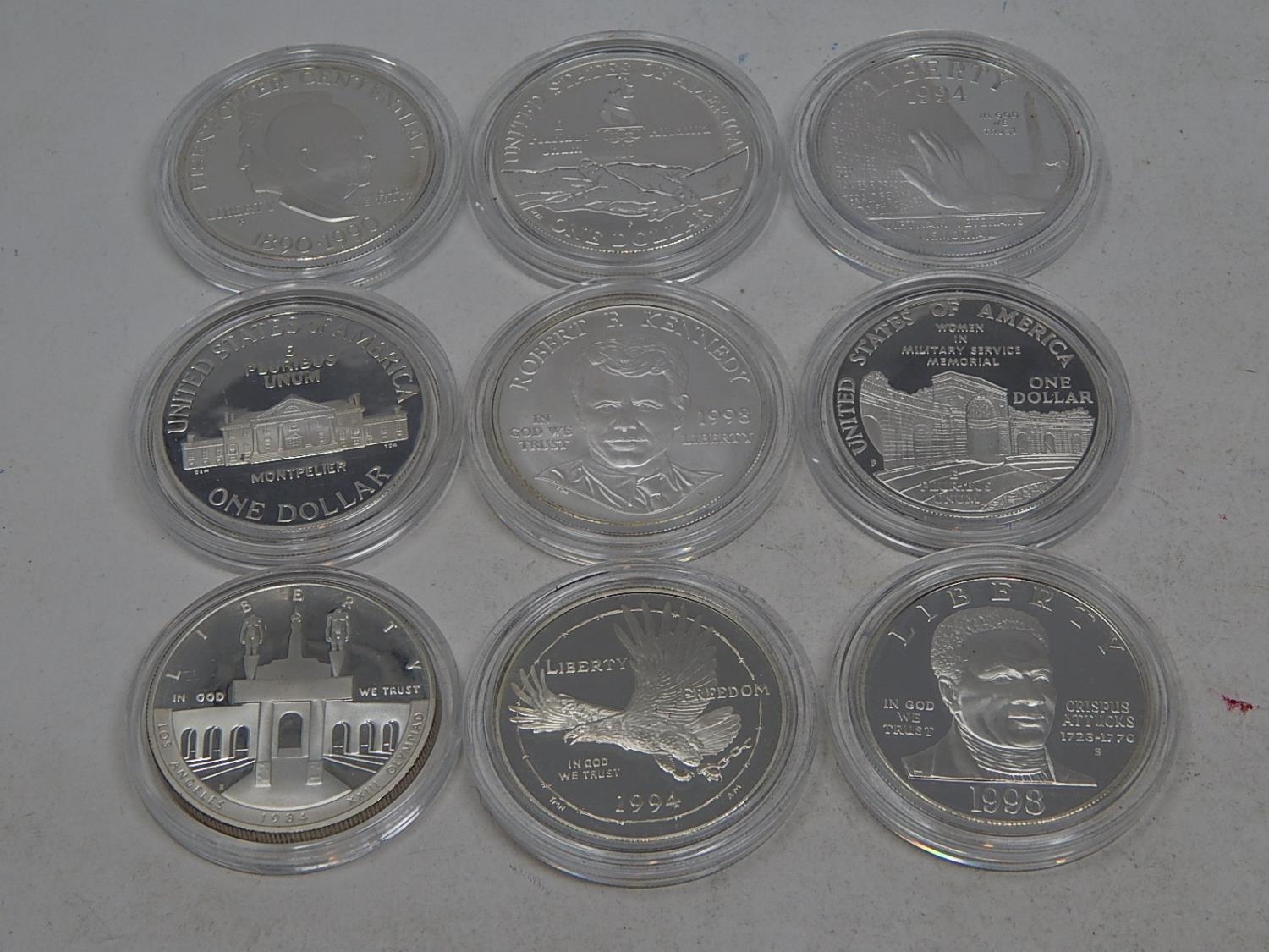 Group of 9 x USA Silver Proof Dollars all about as struck and encapsulated