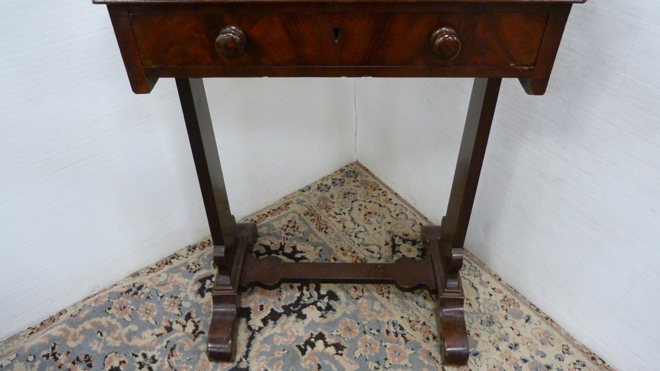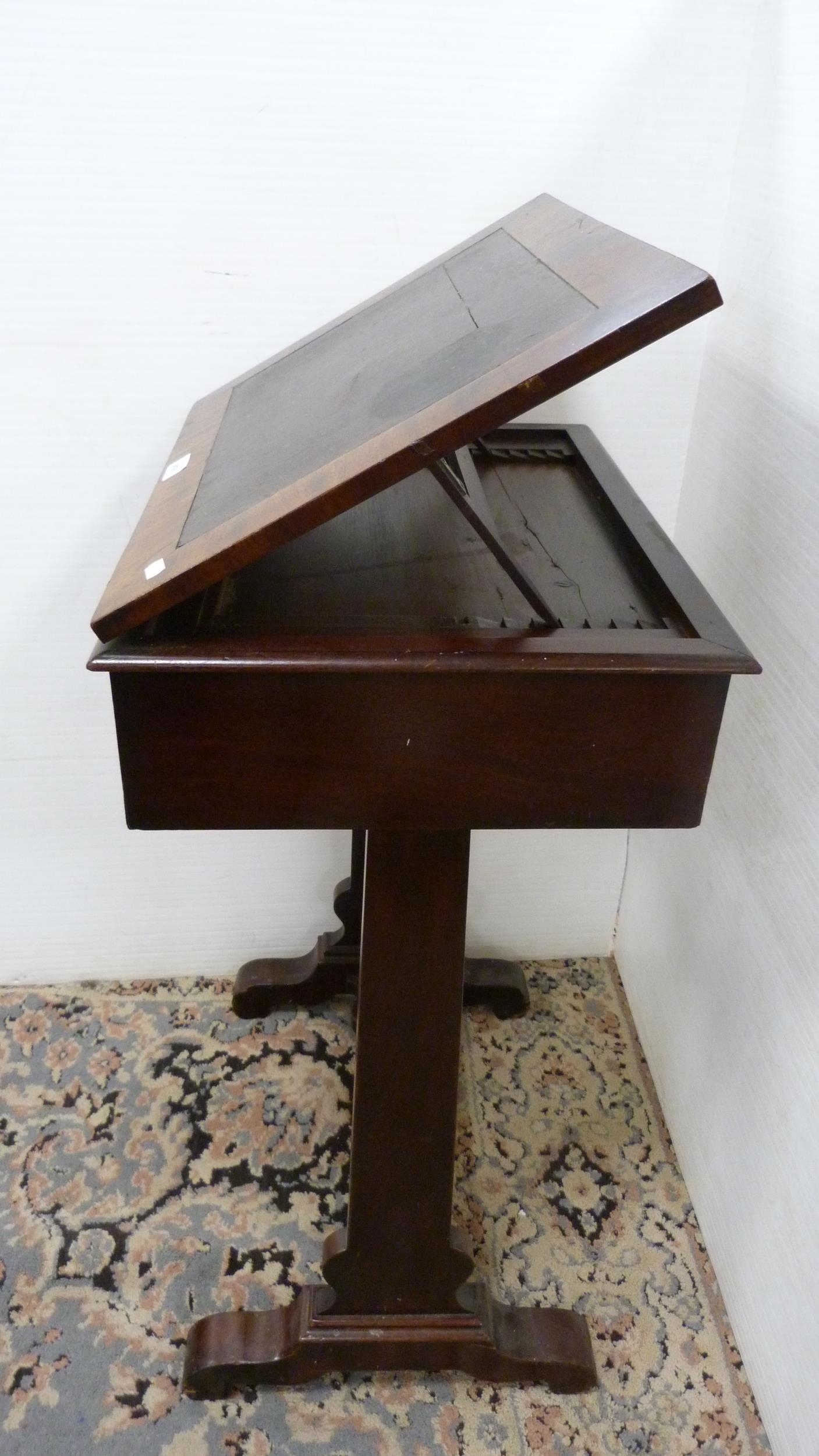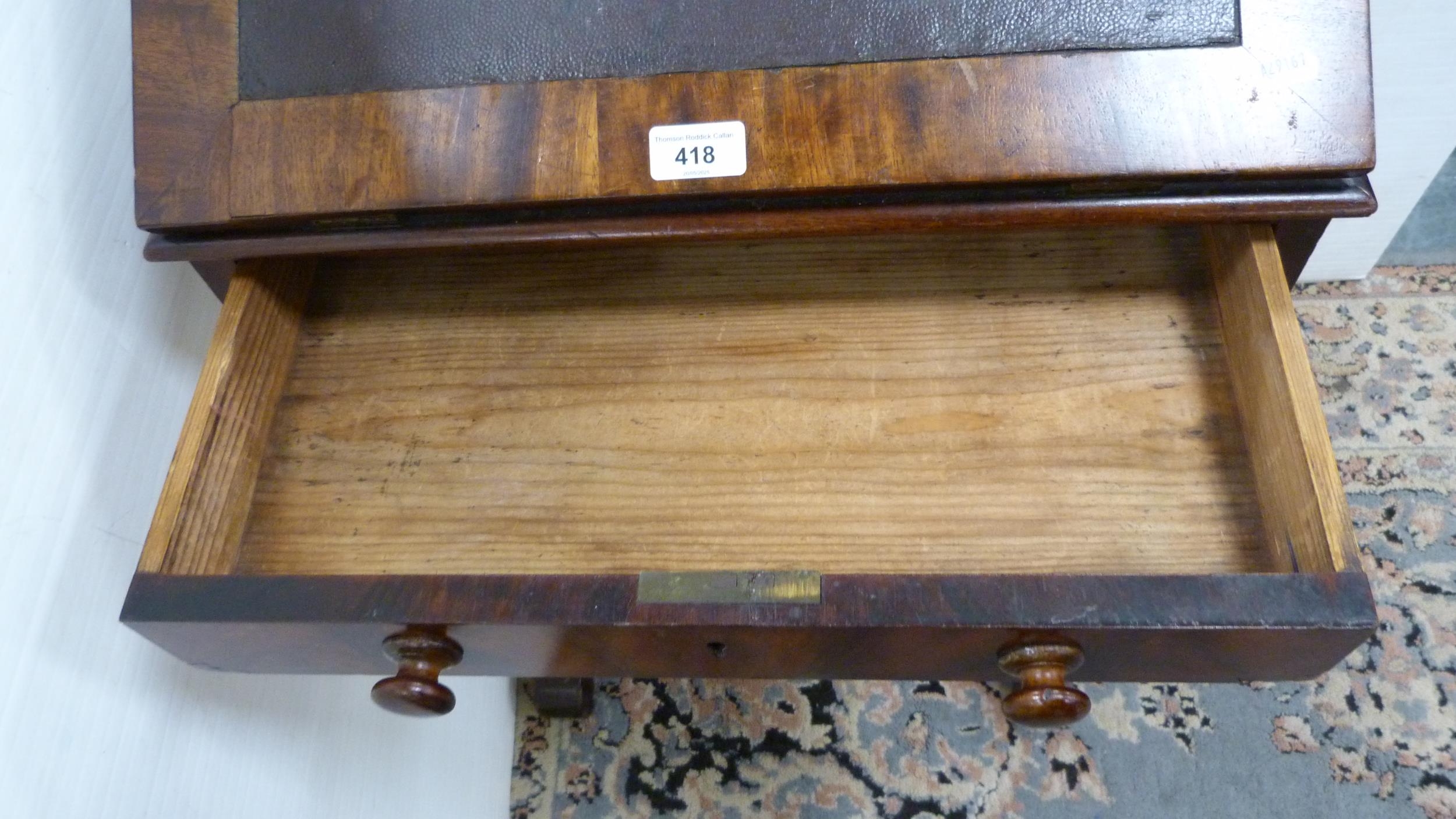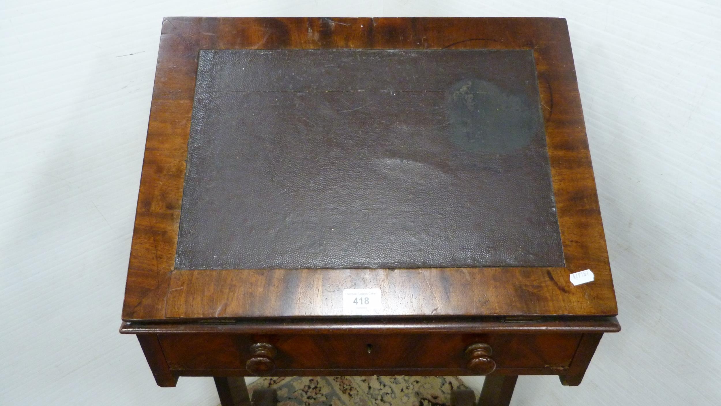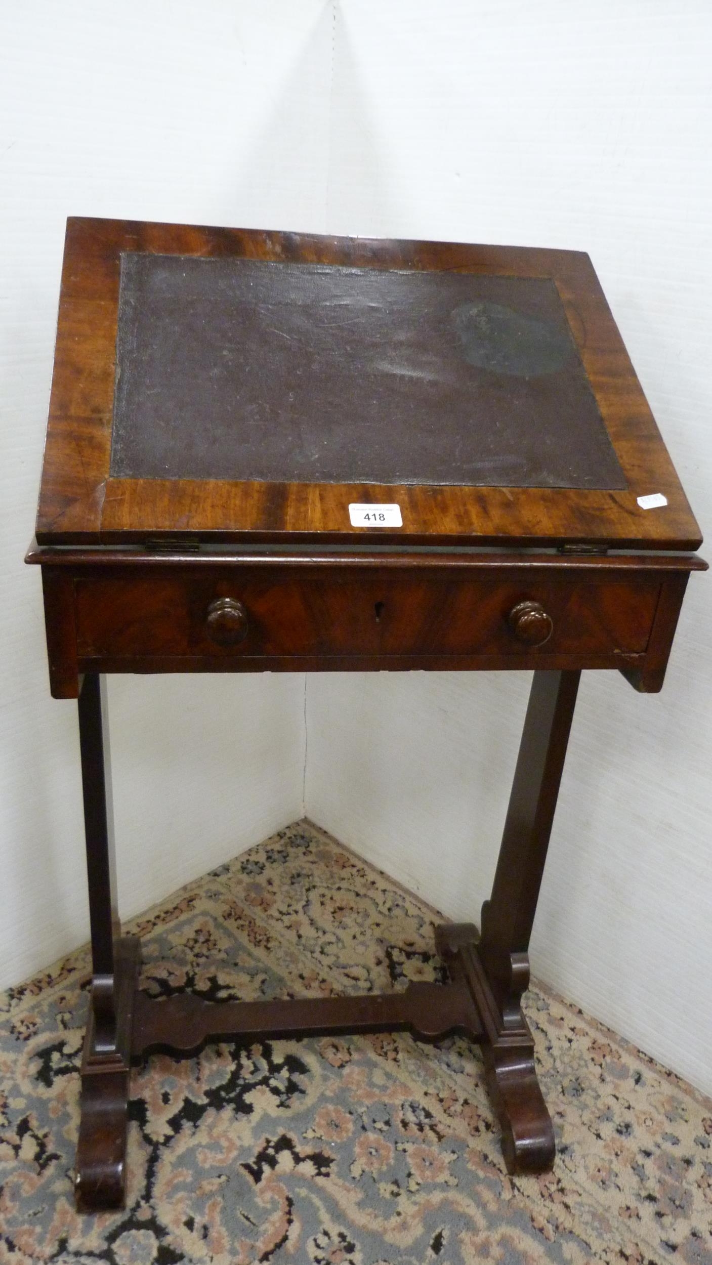 Victorian mahogany writing desk with ratchet pull-up top and single drawer.