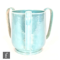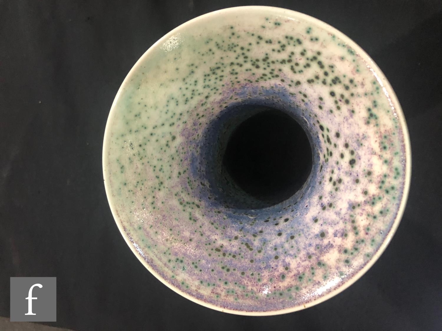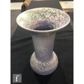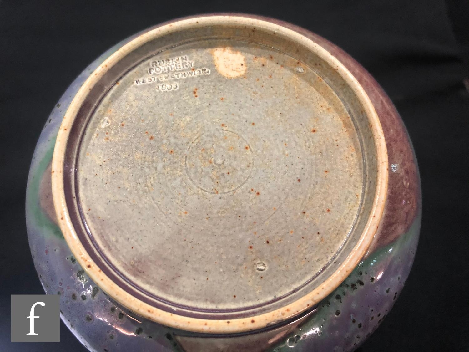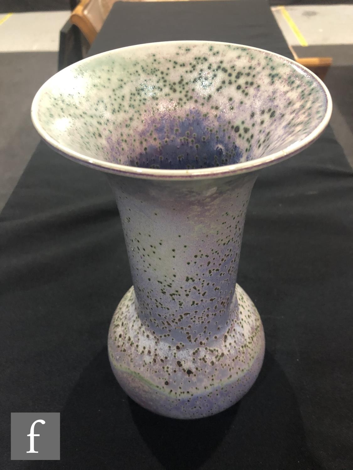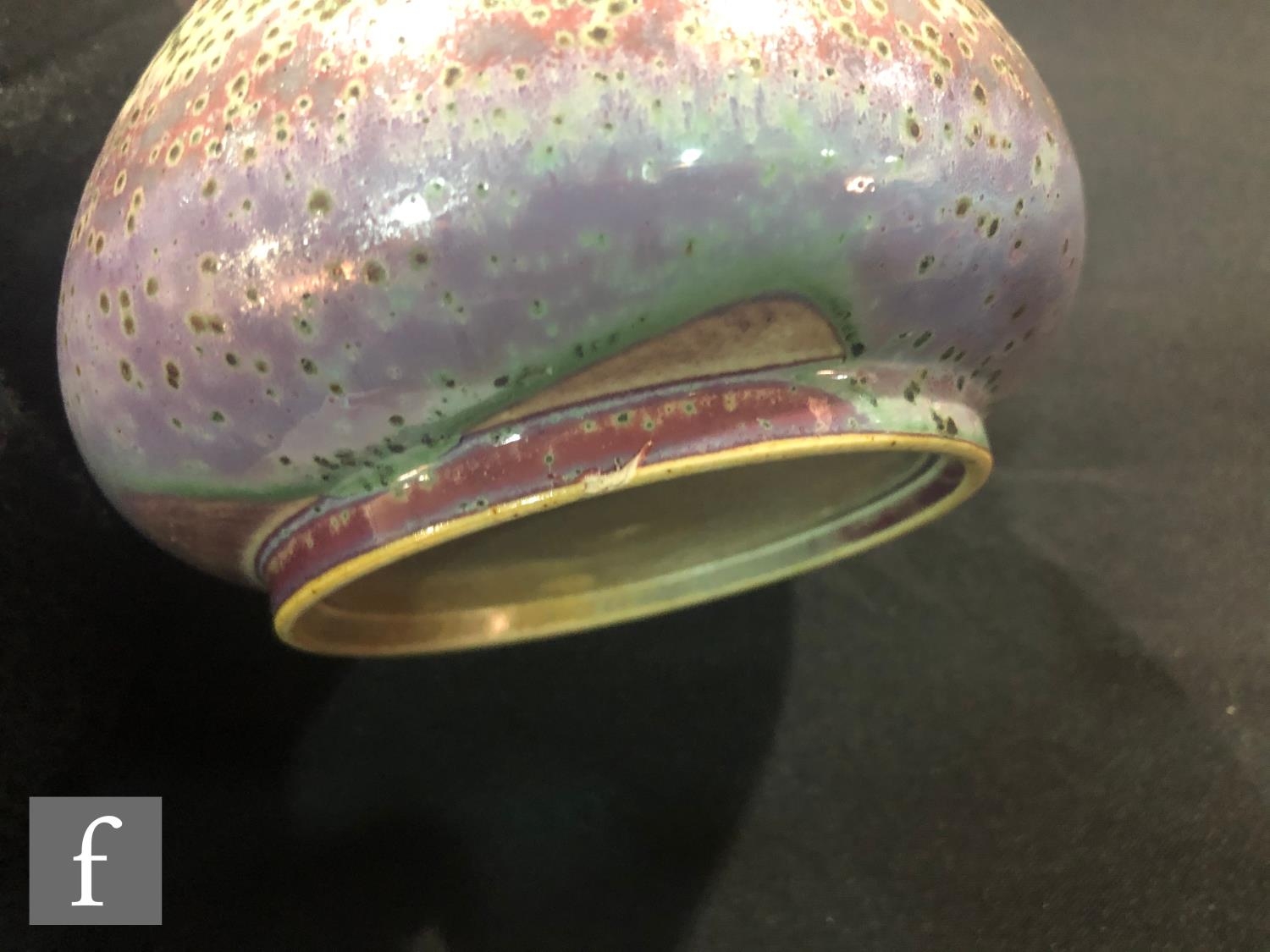 Ruskin Pottery - A high fired vase of globe and flared shaft form decorated in a tonal lavender and blue glaze with copper green spotting and various sweeps of colour to the compressed globe, impressed West Smethwick mark and dated 1908, height 23.5cm, S/D.