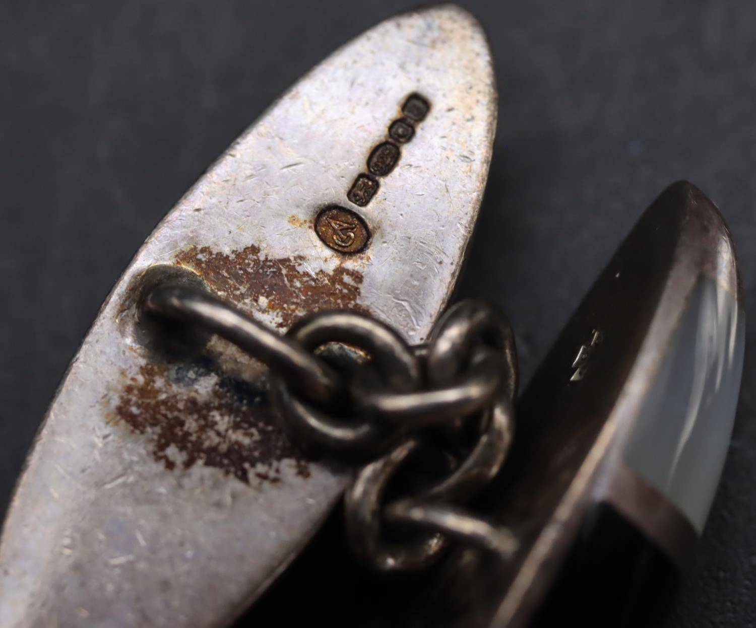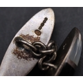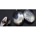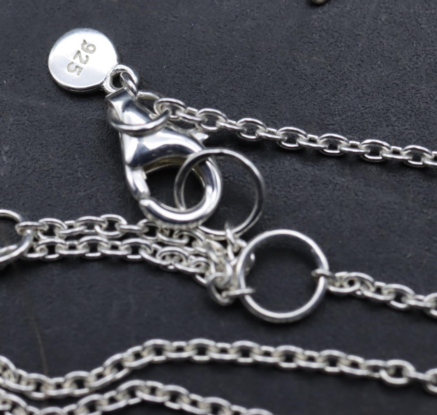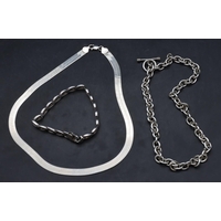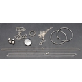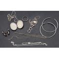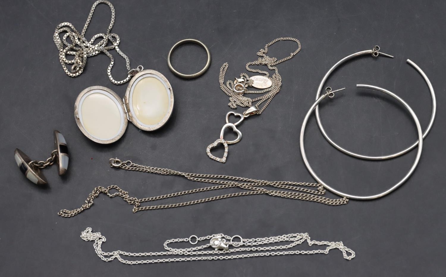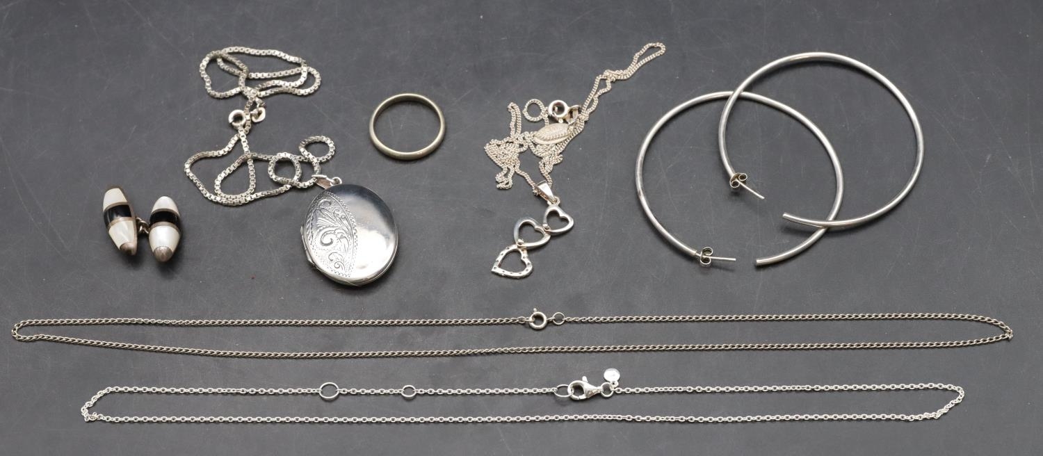 An oval silver locket with square silver chain, a 925 silver pendant in the form of 3 hearts with chain, 2 silver chains, a silver wedding ring, an odd silver cufflink and a pair of silver hoop earrings (8), 39 grams gross