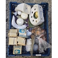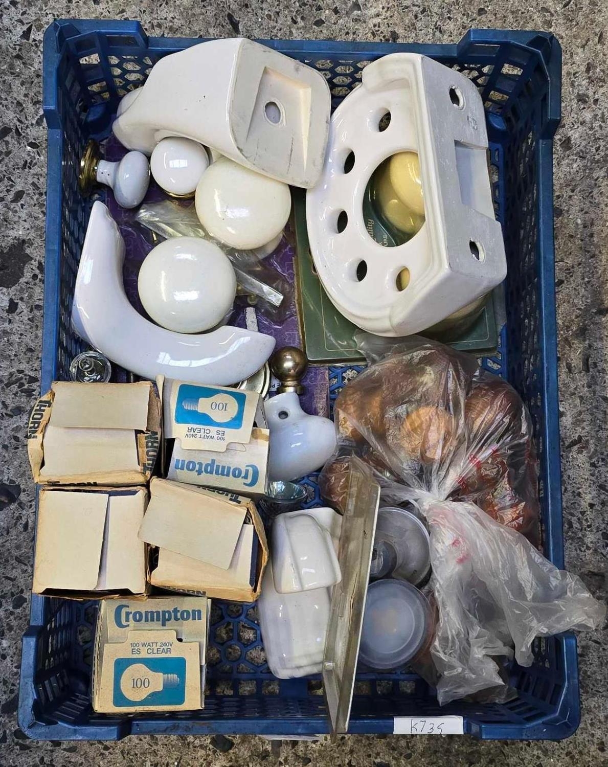 CARTON WITH MISC ELECTRICAL BULBS, WOODEN DRAWER KNOBS, CHINA SOAP DISH, TOWEL RAIL FITTINGS & BATHROOM DOOR KNOBS