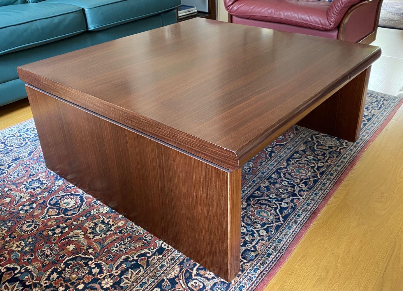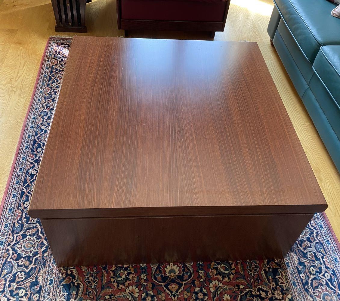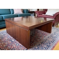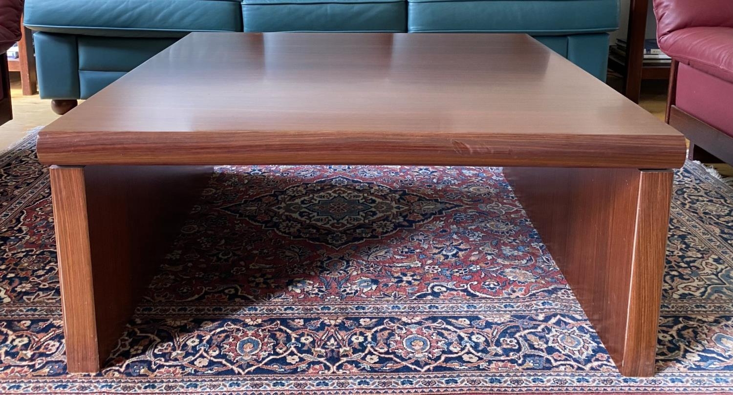 AN ELEGANT SOLID ROSEWOOD COFFEE TABLE, square form, very heavy with top and sides measuring 5-6cm depth. Bought in the Middle Easy c.1980. In excellent condition. Dimensions: 90cm square x 43cm high approx.