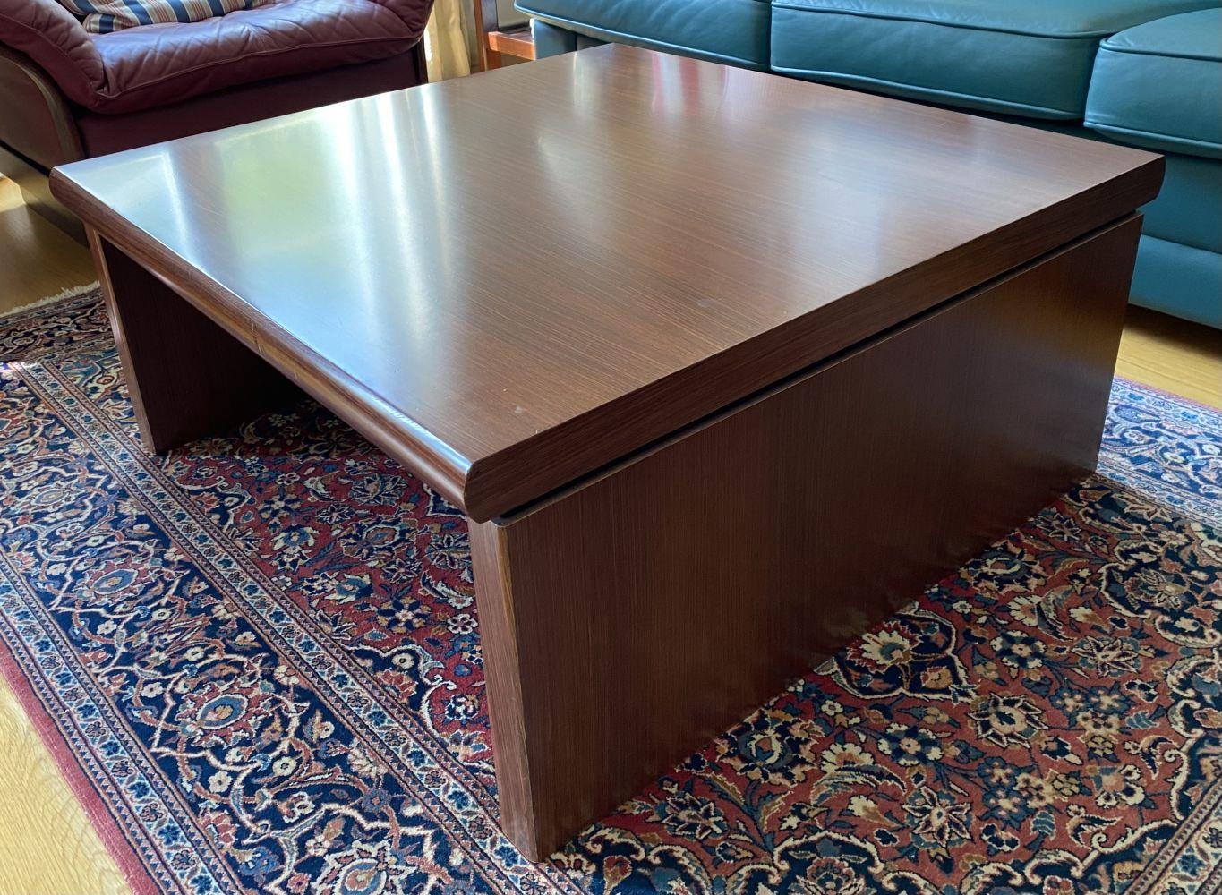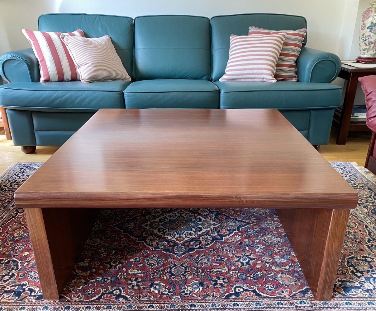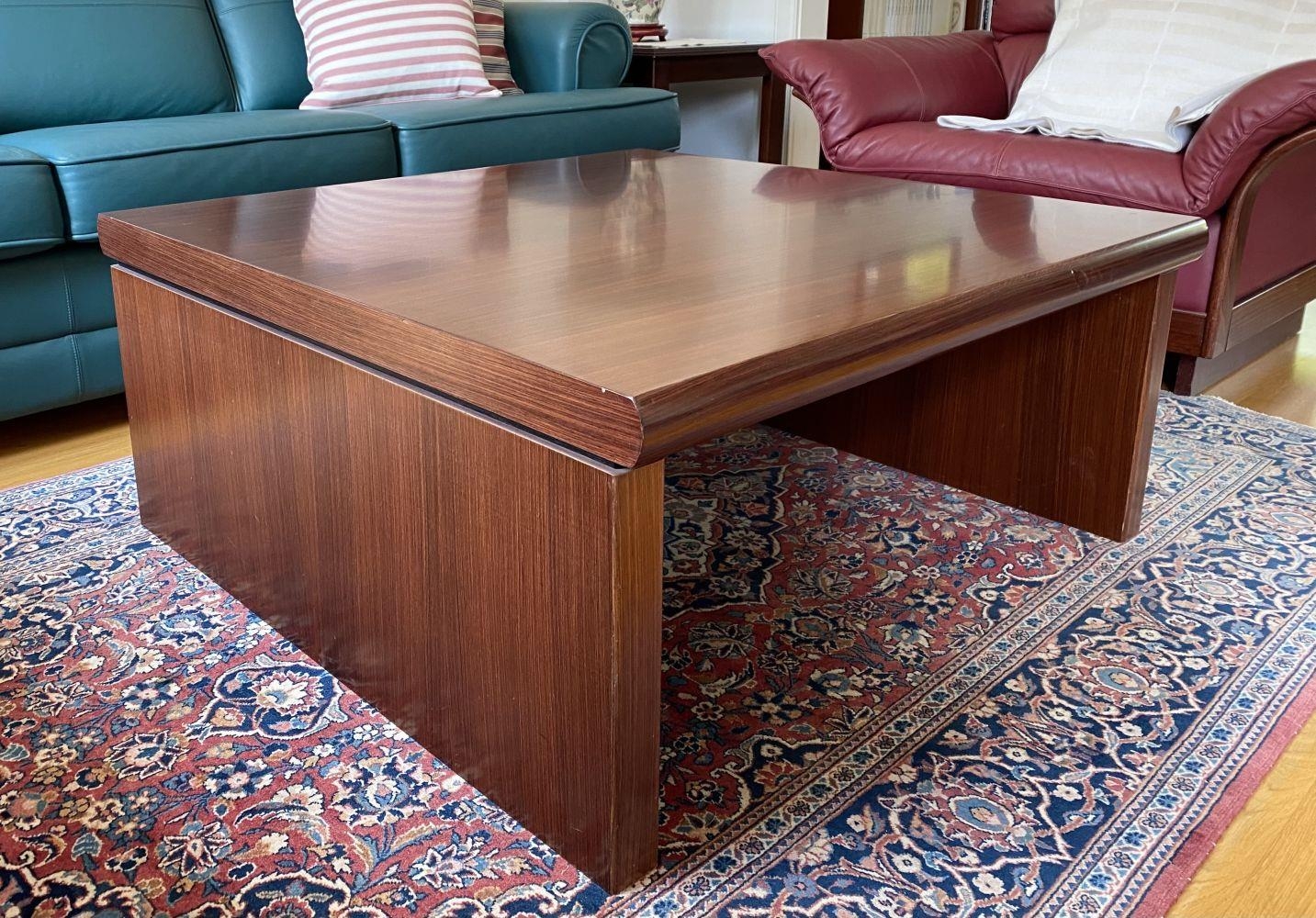 AN ELEGANT SOLID ROSEWOOD COFFEE TABLE, square form, very heavy with top and sides measuring 5-6cm depth. Bought in the Middle Easy c.1980. In excellent condition. Dimensions: 90cm square x 43cm high approx.