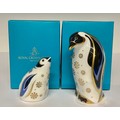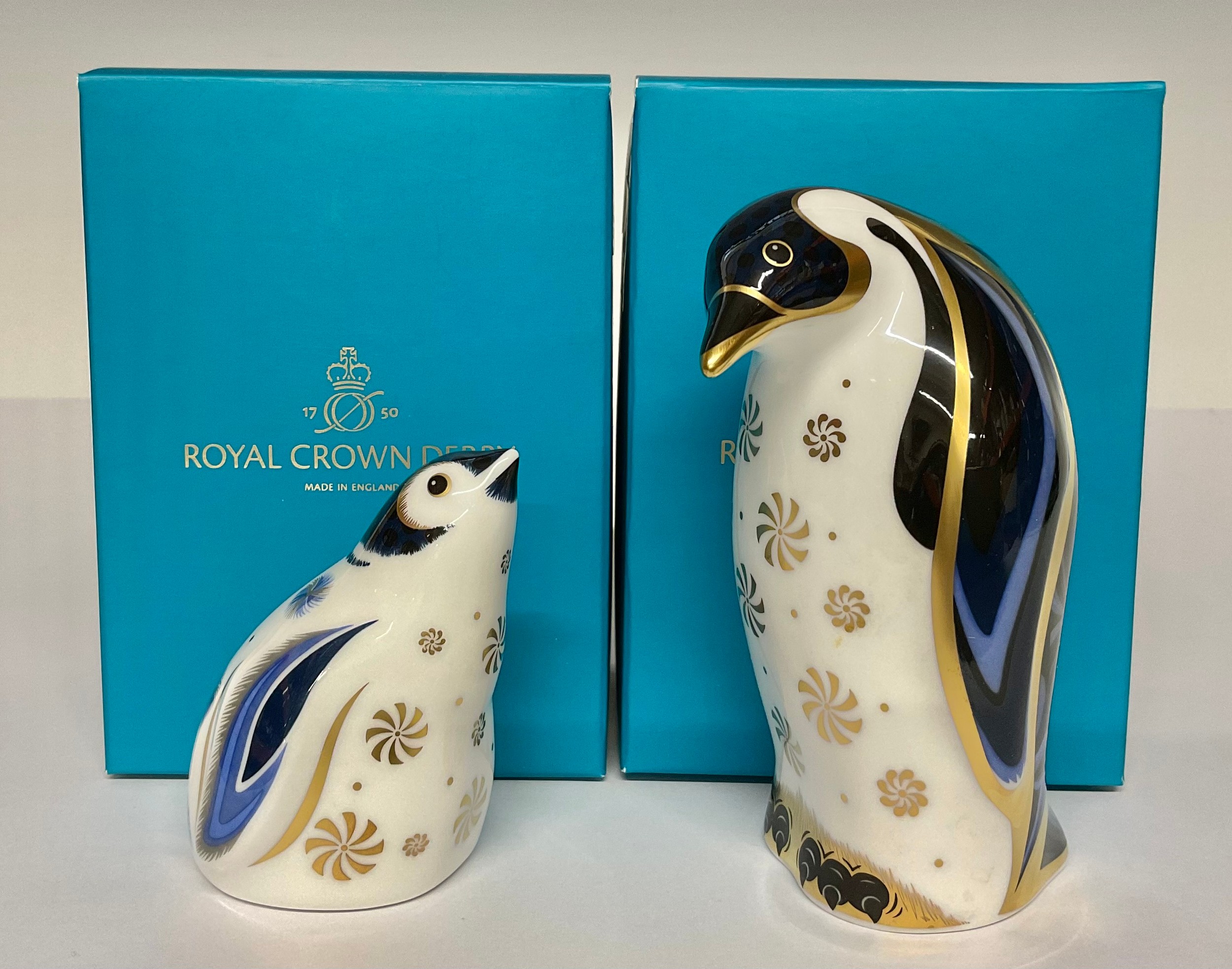 A pair of Royal Crown Derby paperweights, comprising, Aurora Penguin, gold stopper, 11.5cm, printed mark in grey, boxed; Snowflake Baby Penguin, gold stopper, 7cm, printed mark in grey, boxed, Collector's Guild exclusives 2018 (2)