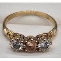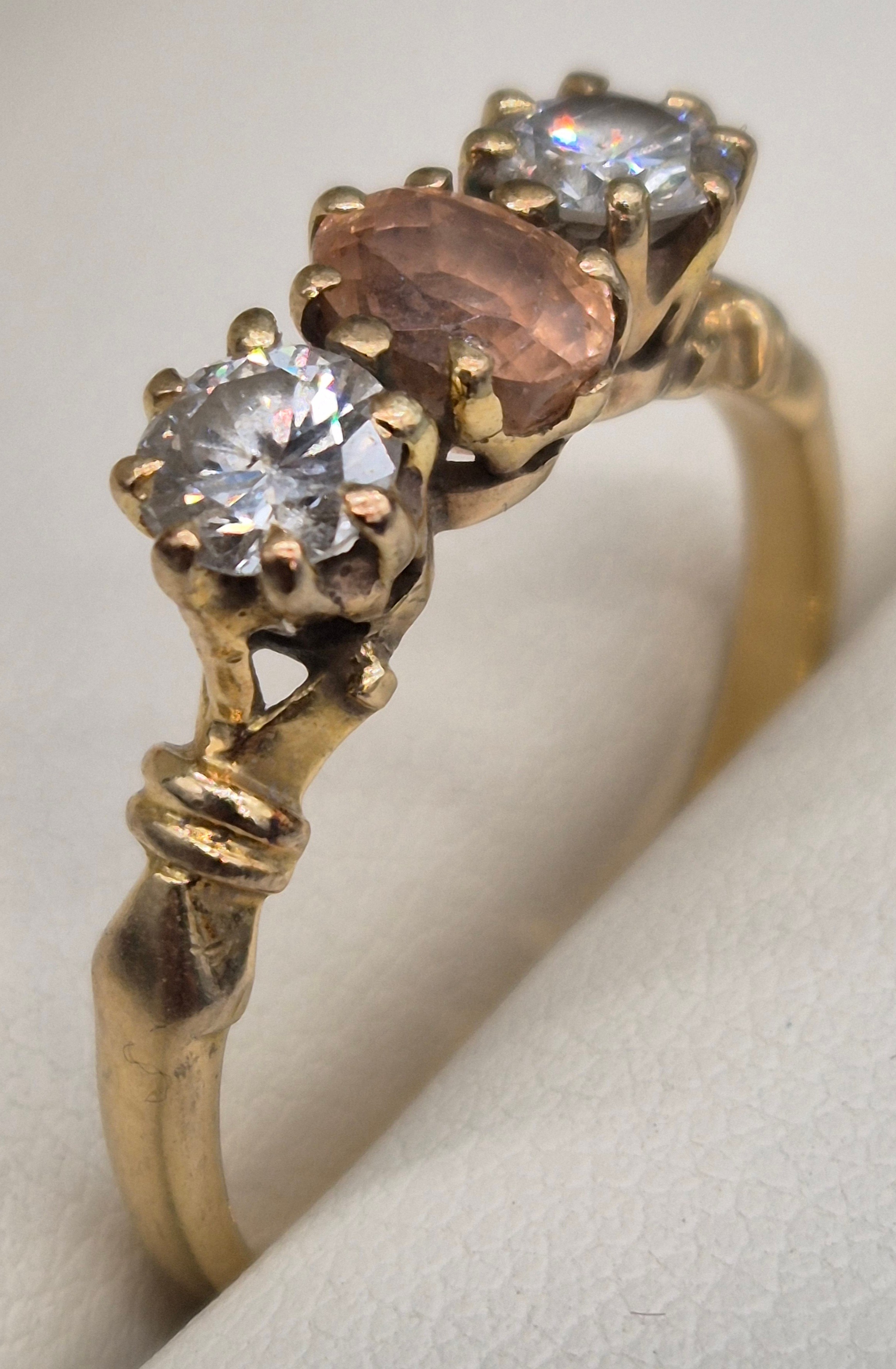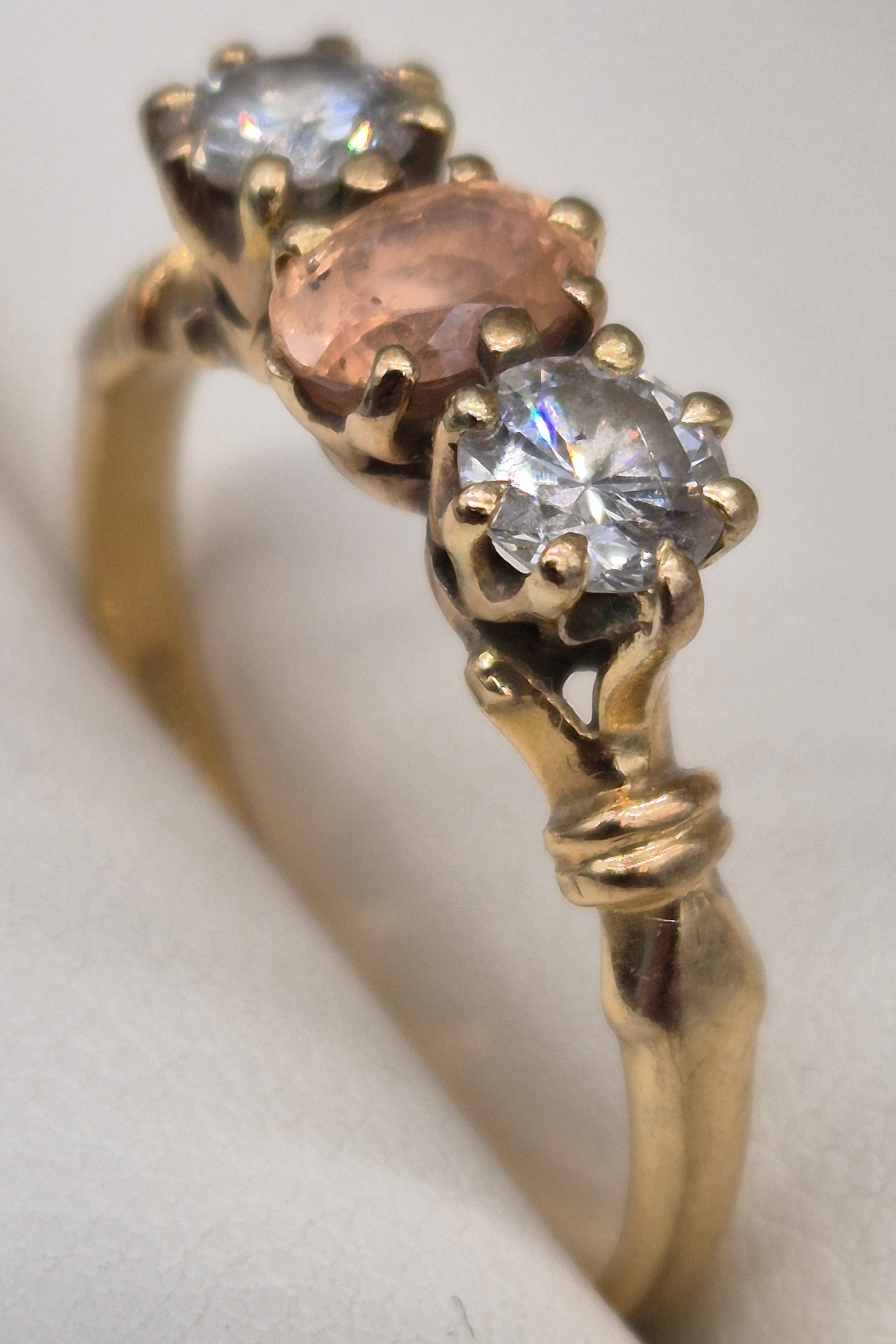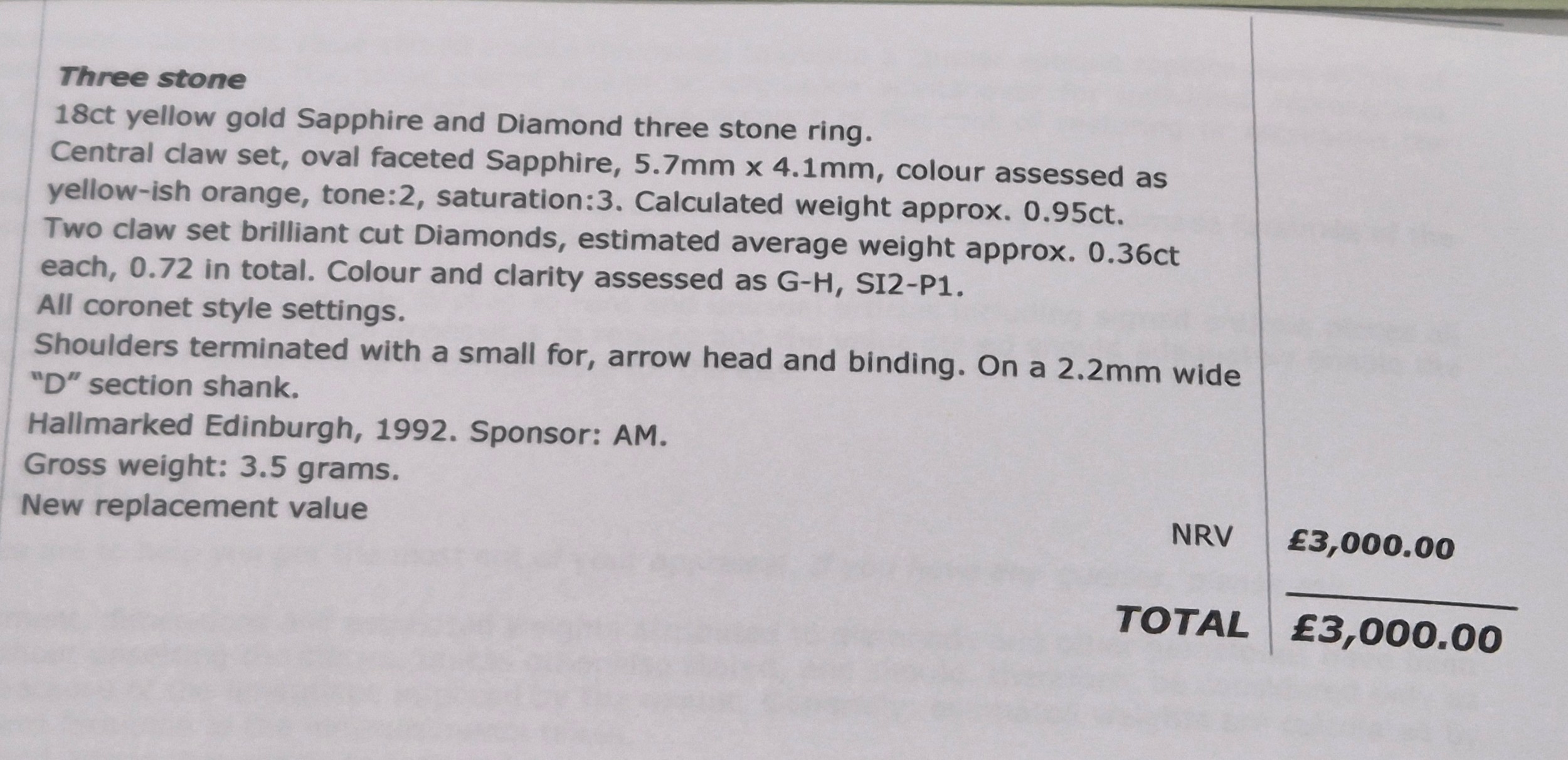 18ct yellow gold Padparadscha Sapphire and Diamond three stone ring. Central claw set, oval faceted sapphire. Diamonds- 0.72cts in total. Ring size R. 3.18Grams. Comes with original purchase receipt and valuation paperwork.