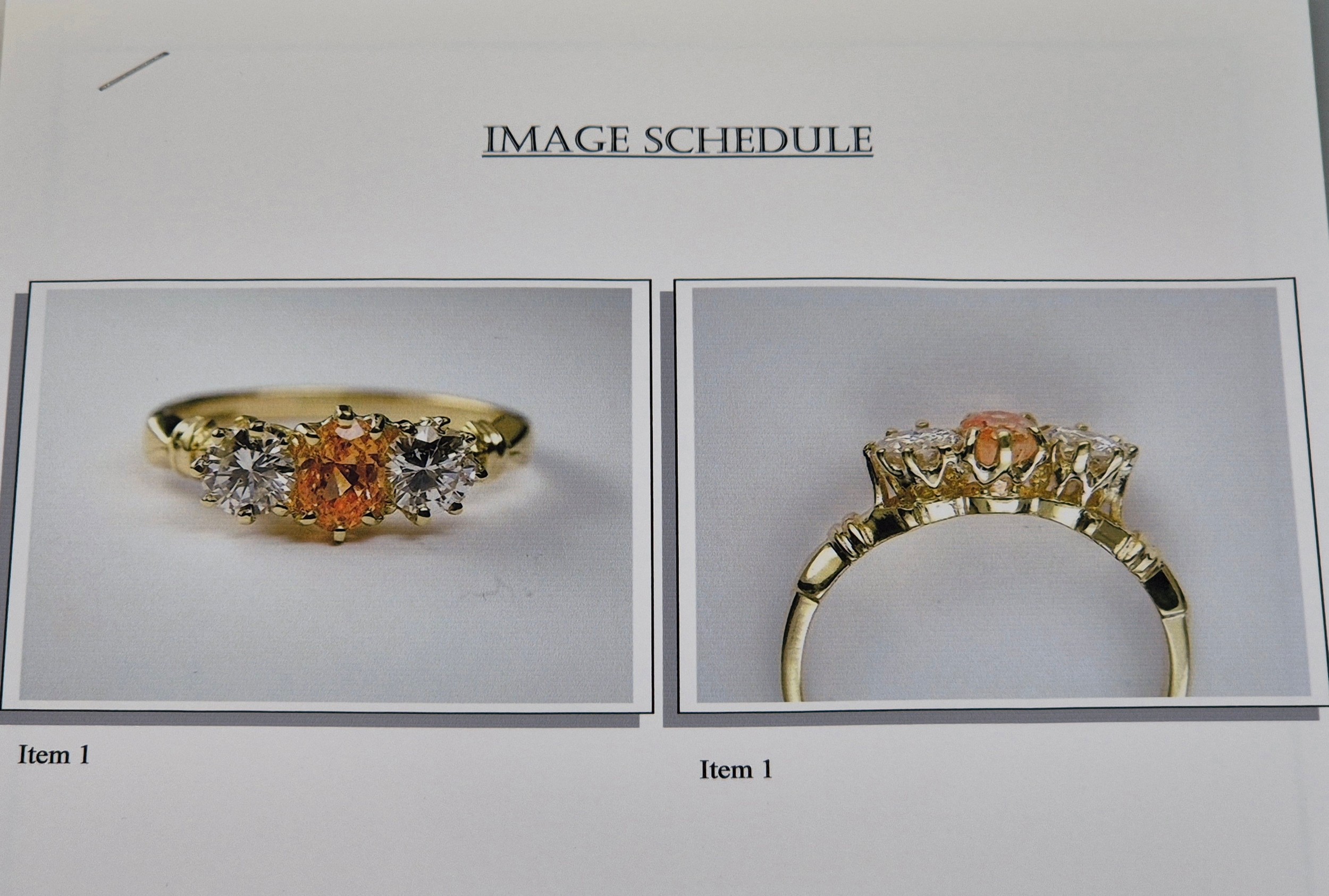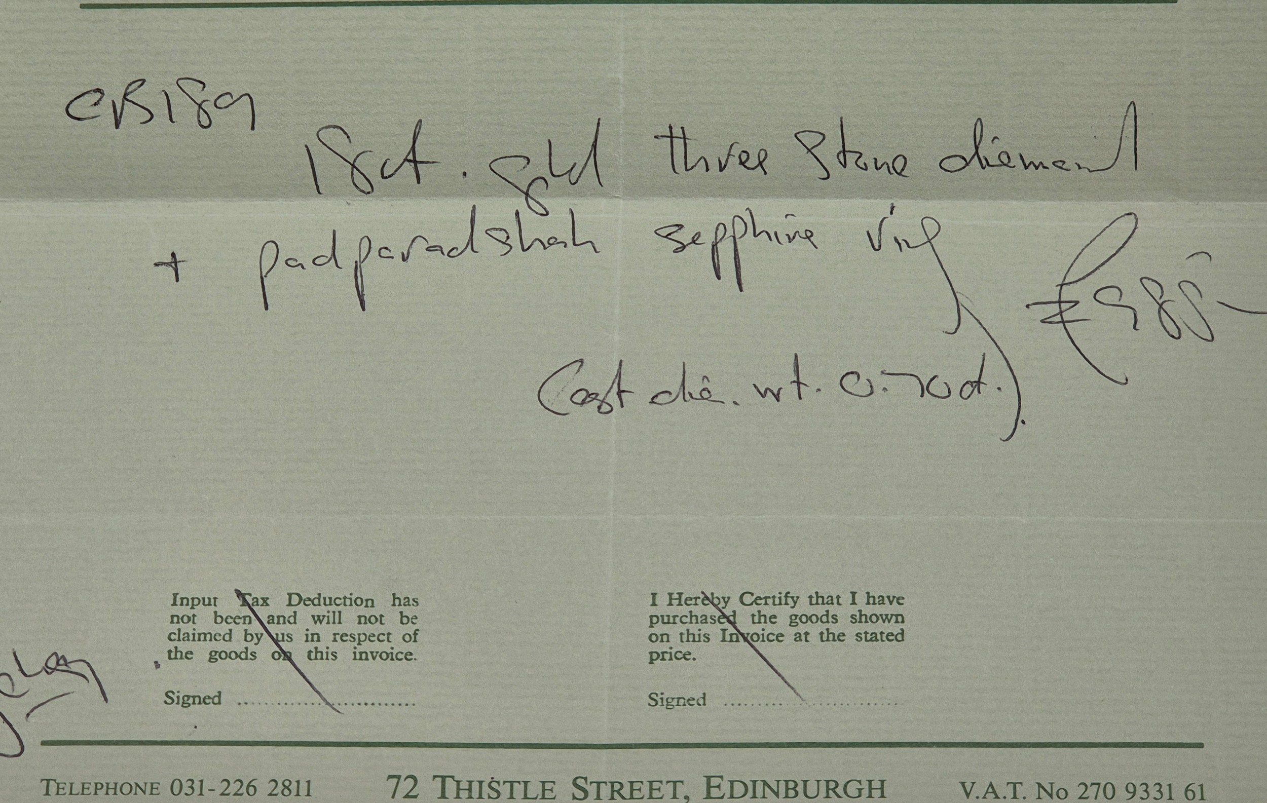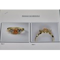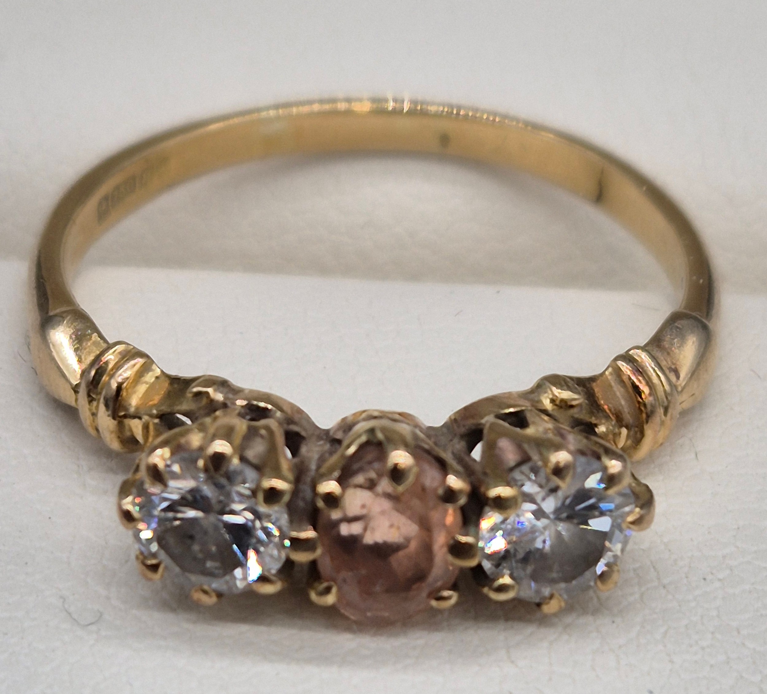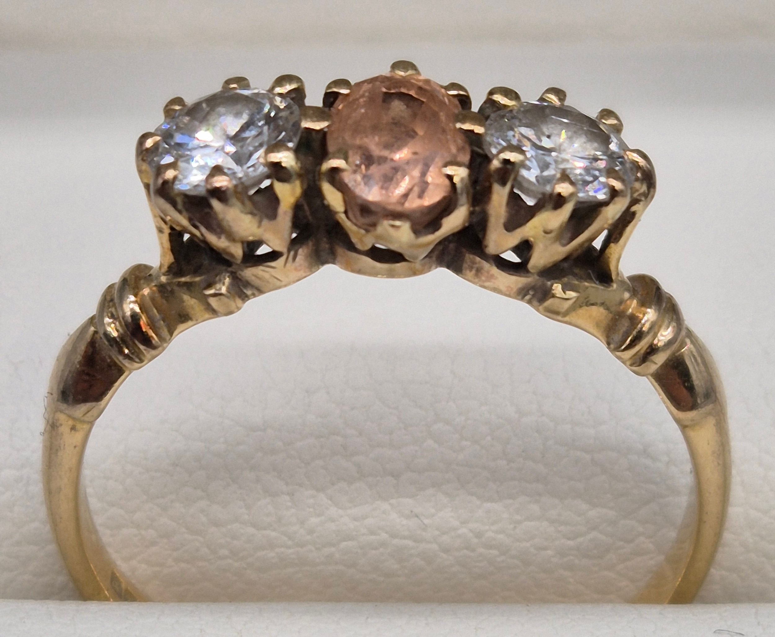 18ct yellow gold Padparadscha Sapphire and Diamond three stone ring. Central claw set, oval faceted sapphire. Diamonds- 0.72cts in total. Ring size R. 3.18Grams. Comes with original purchase receipt and valuation paperwork.
