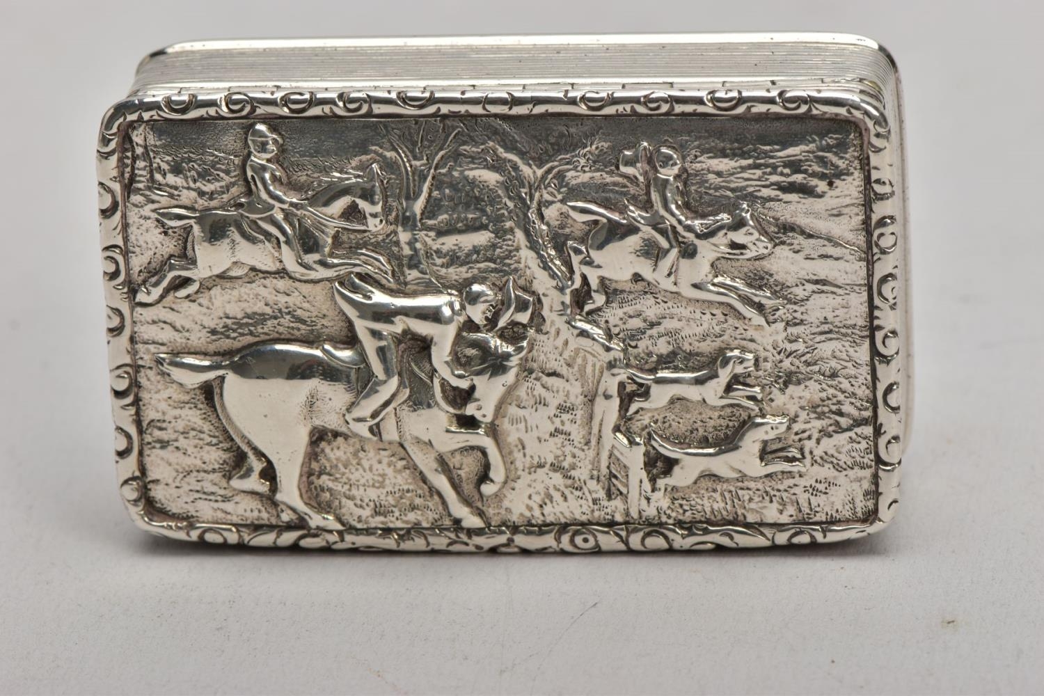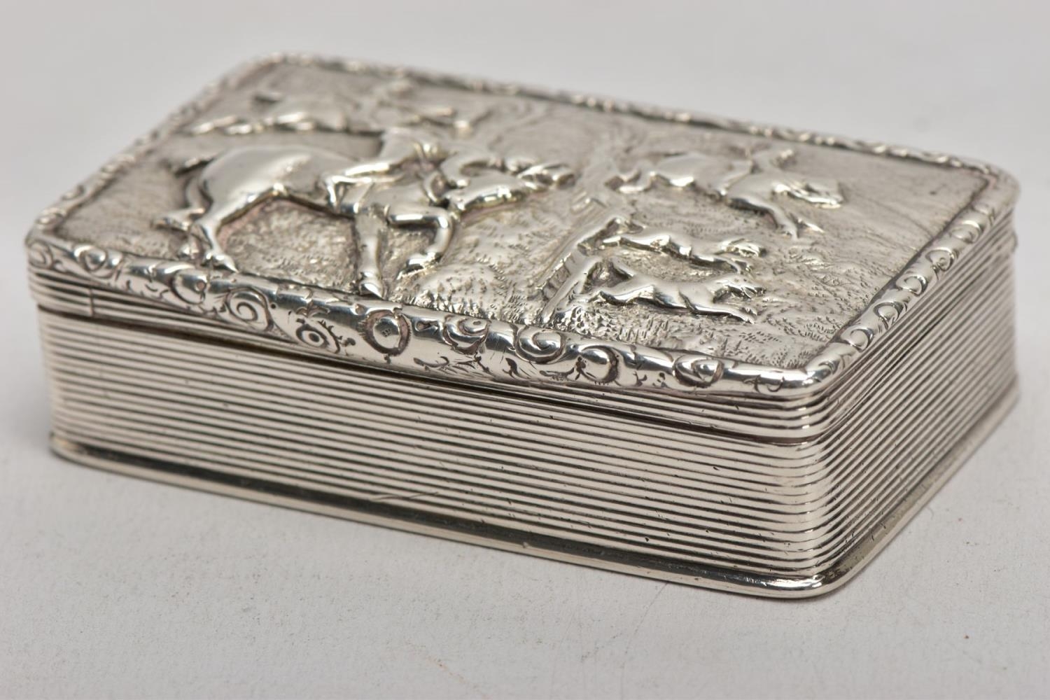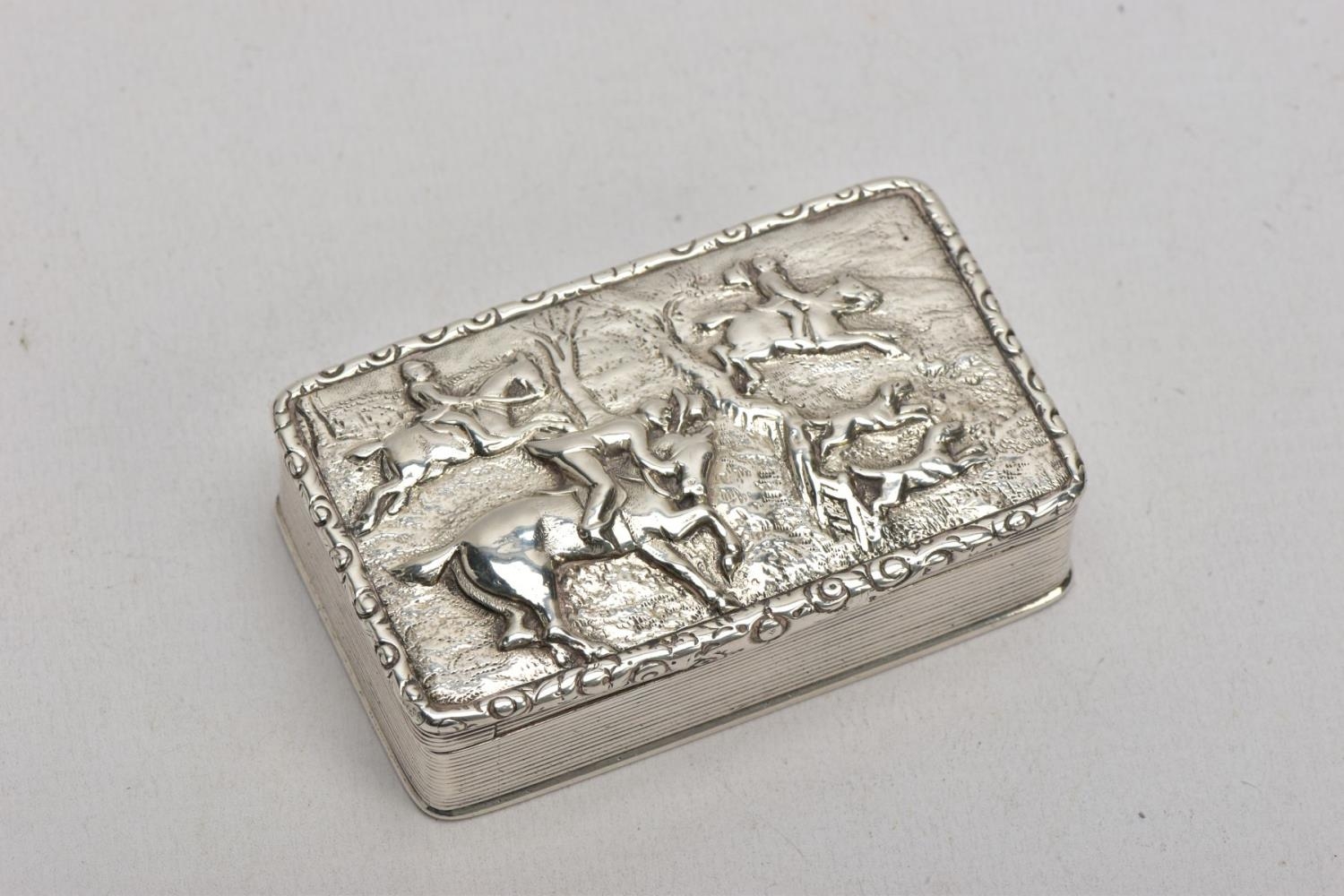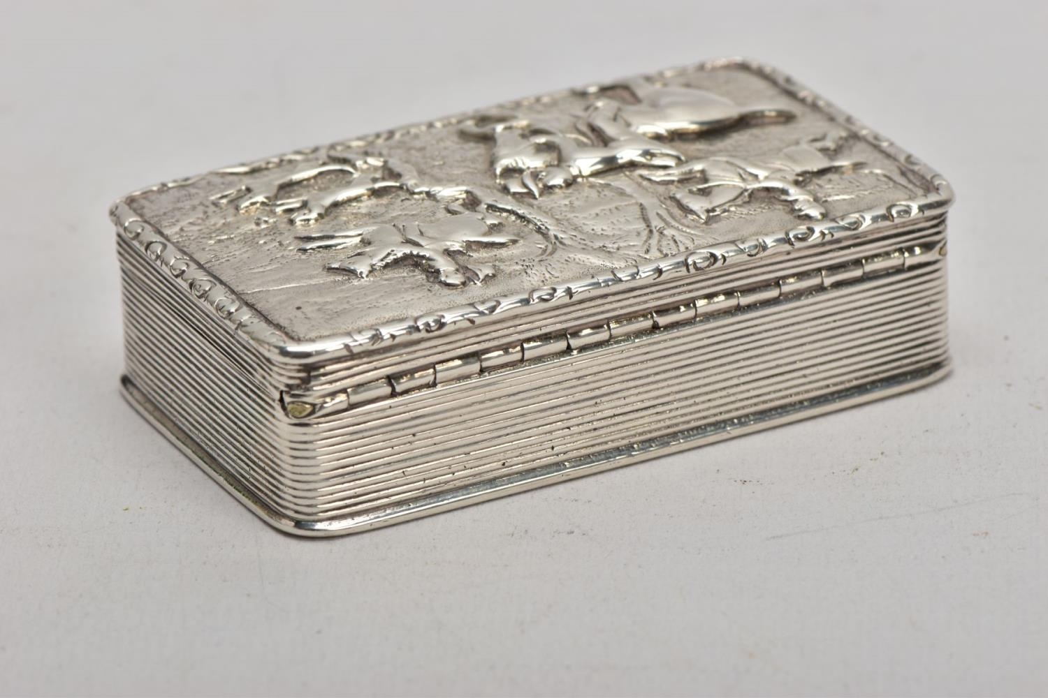 A SILVER TABLE SNUFF BOX, embossed fox hunting scene to the lid, engine turned design to the sides and base, gilt interior, hallmarked 'Edward Smith' Birmingham 1836, approximate dimensions 7.6cm x 4.7cm x 2.4cm, approximate gross weight 112.5 grams, 3.62ozt (condition report: general light wear, small split to the rim of the lid, very worn gilt interior, opens and closes with ease, some slight dinks and surface scratches to the sides, overall condition good)