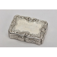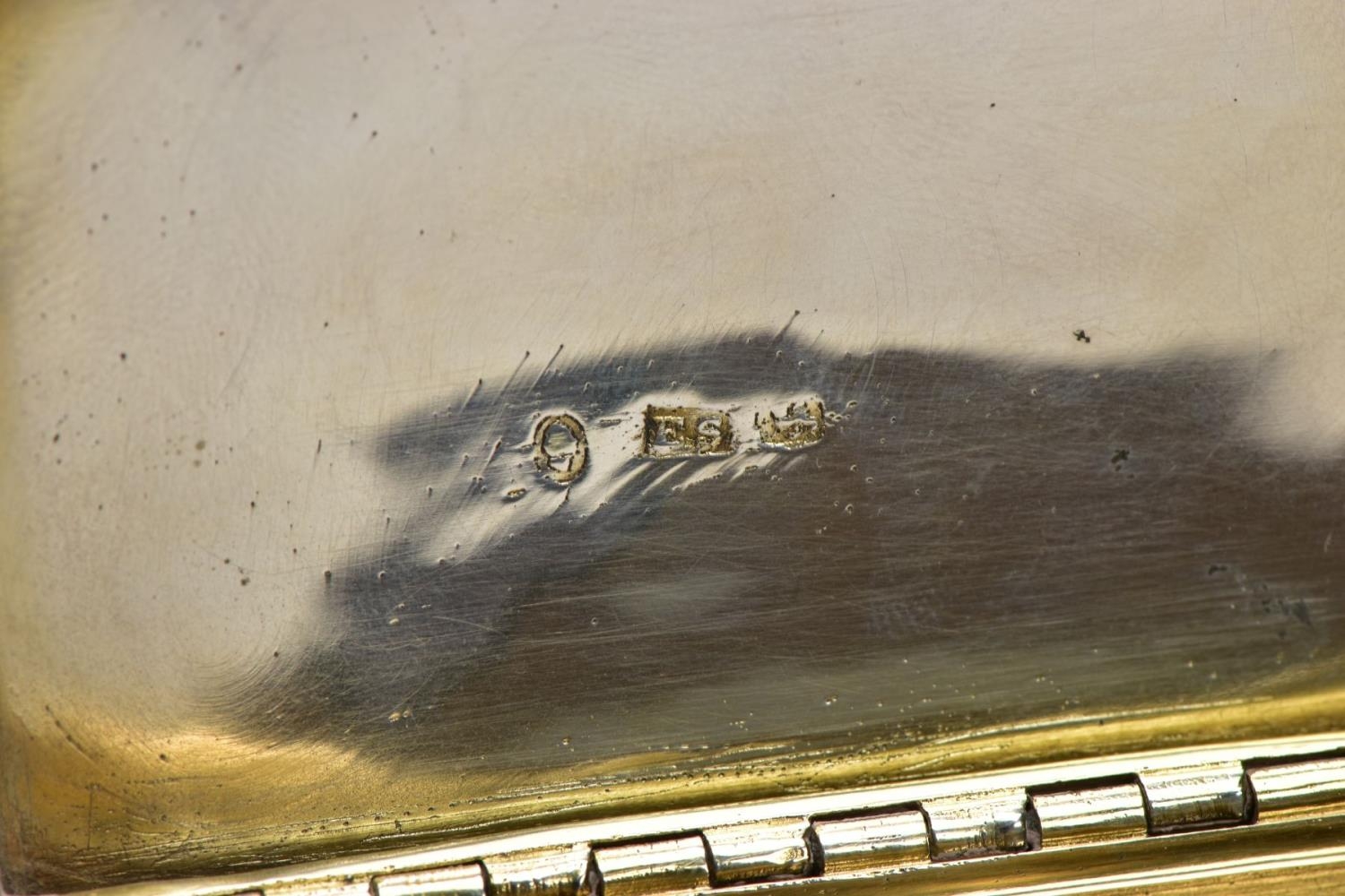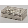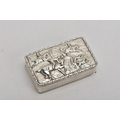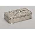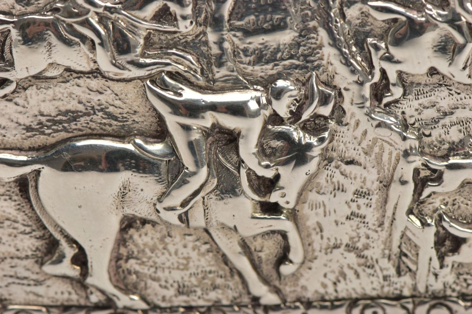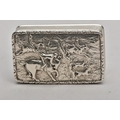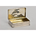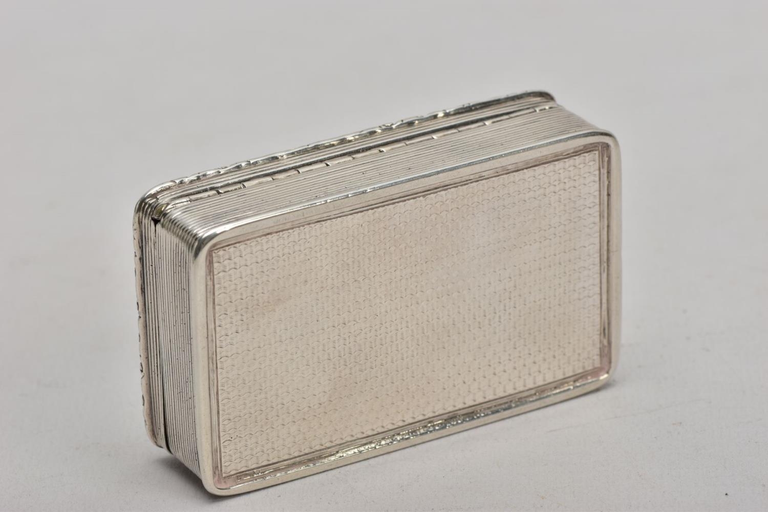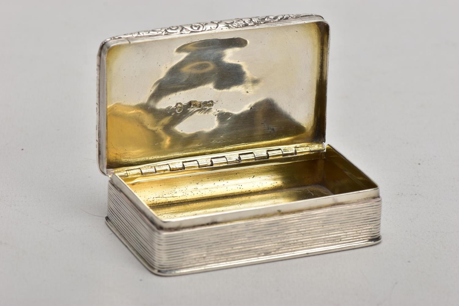 A SILVER TABLE SNUFF BOX, embossed fox hunting scene to the lid, engine turned design to the sides and base, gilt interior, hallmarked 'Edward Smith' Birmingham 1836, approximate dimensions 7.6cm x 4.7cm x 2.4cm, approximate gross weight 112.5 grams, 3.62ozt (condition report: general light wear, small split to the rim of the lid, very worn gilt interior, opens and closes with ease, some slight dinks and surface scratches to the sides, overall condition good)