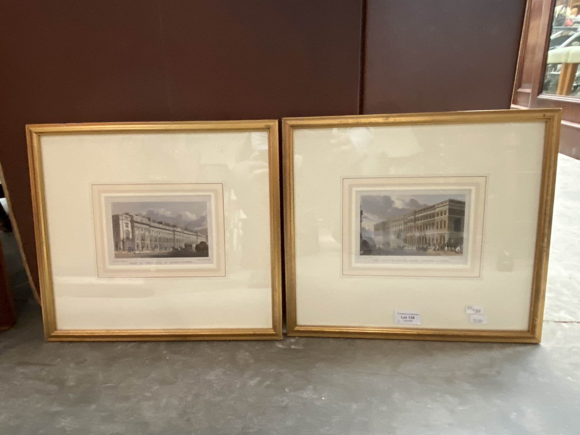 2 framed coloured etchings - 'The Custom House, From Thames Street' & 'Part Of West Side Of Regent Street', engraved by W. Watkins 33 x 38cm