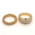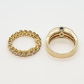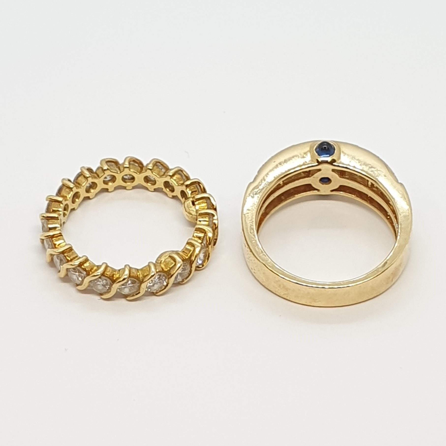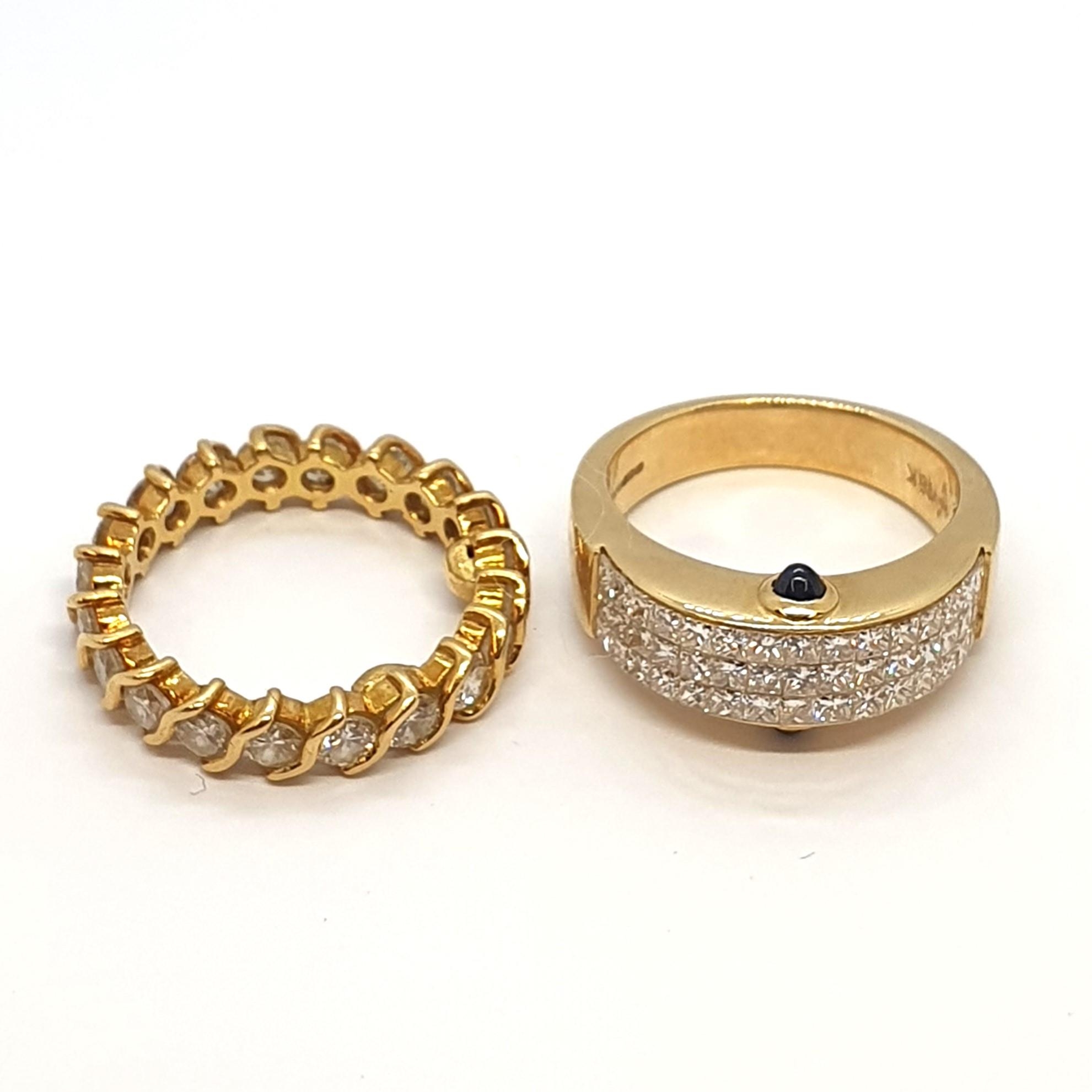 A half-hoop Diamond Dress Ring set three rows of princess-cut stones and a cabochon sapphire to the profile of the setting, ring size N, approx 7.8gms and a Diamond Eternity Ring crossover channel-set brilliant-cut stones in unmarked yellow metal, ring size J, approx 4gms