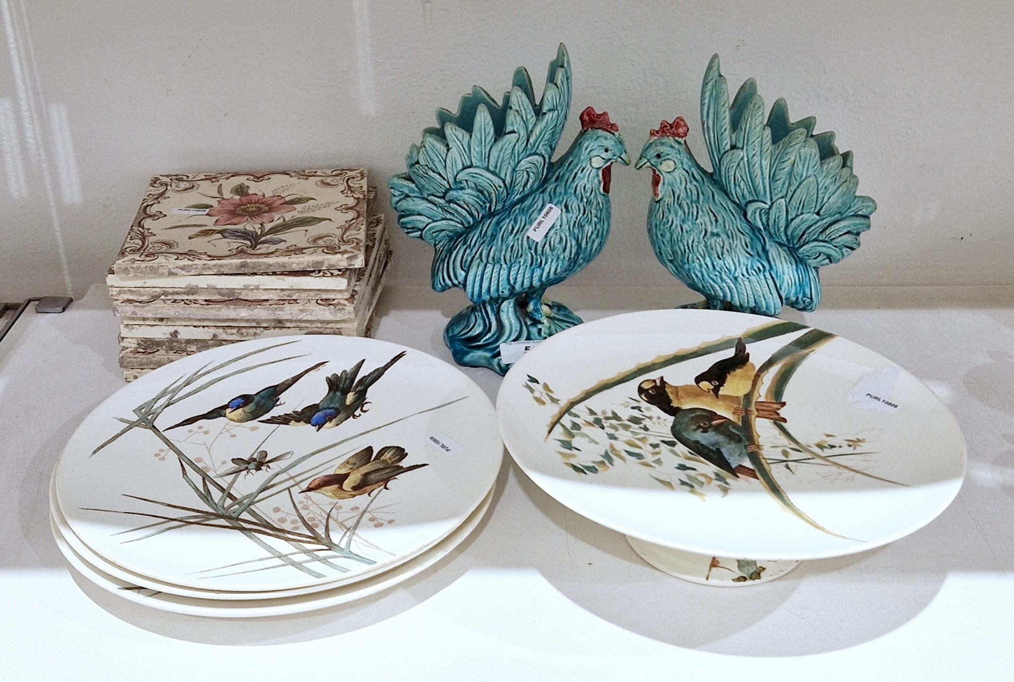 Pair of English majolica turquoise glazed models of 'Japanese Roosters', late 19th century, moulded marks, registration no. 375422 and a late 19th century Brown Westhead & Moore ornithological part dinner service comprising a tazza, three plates, printed and impressed marks and nine late 19th century English pottery tiles, transfer-printed and enamelled with flowers within rocaille borders in sepia