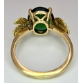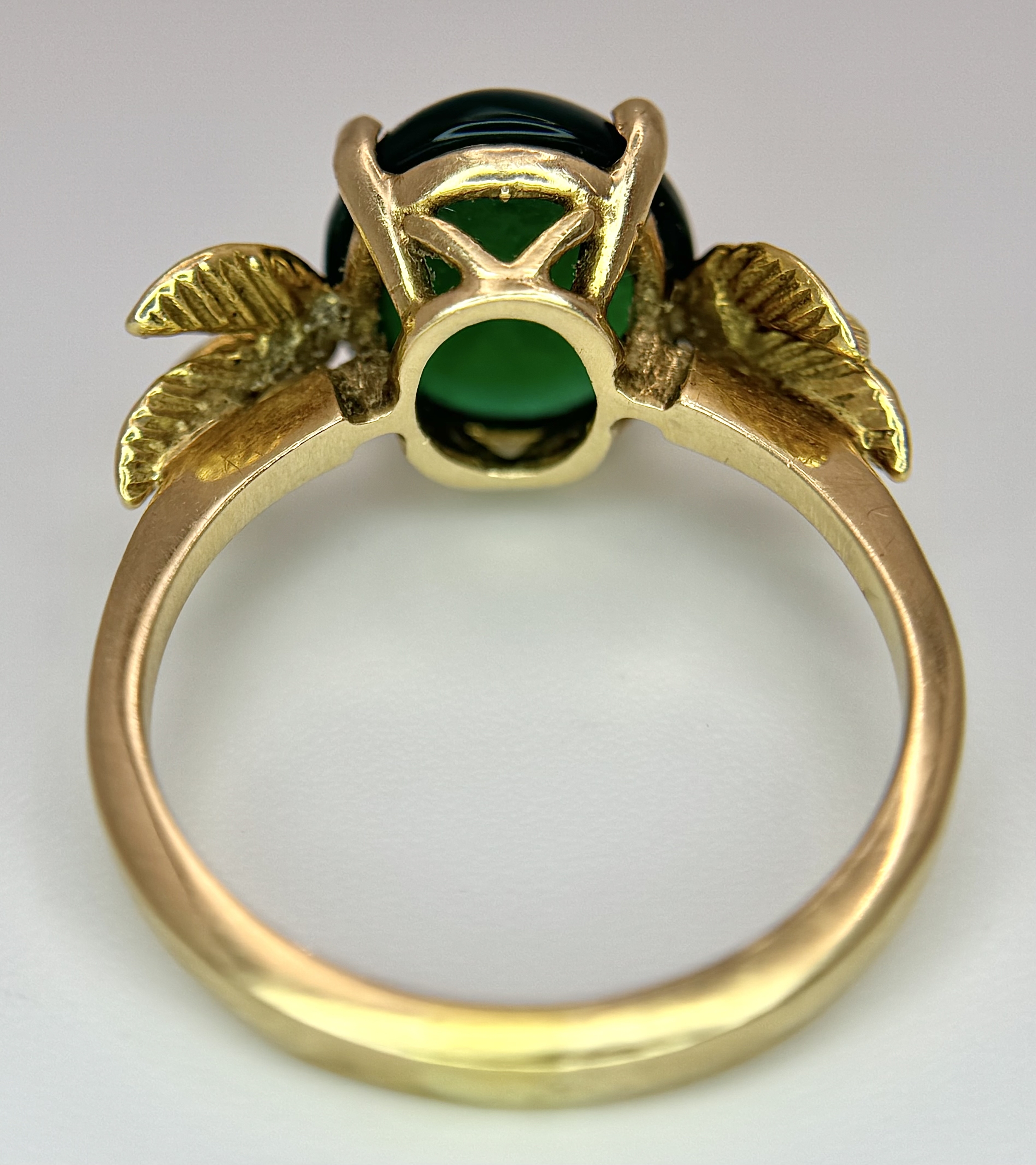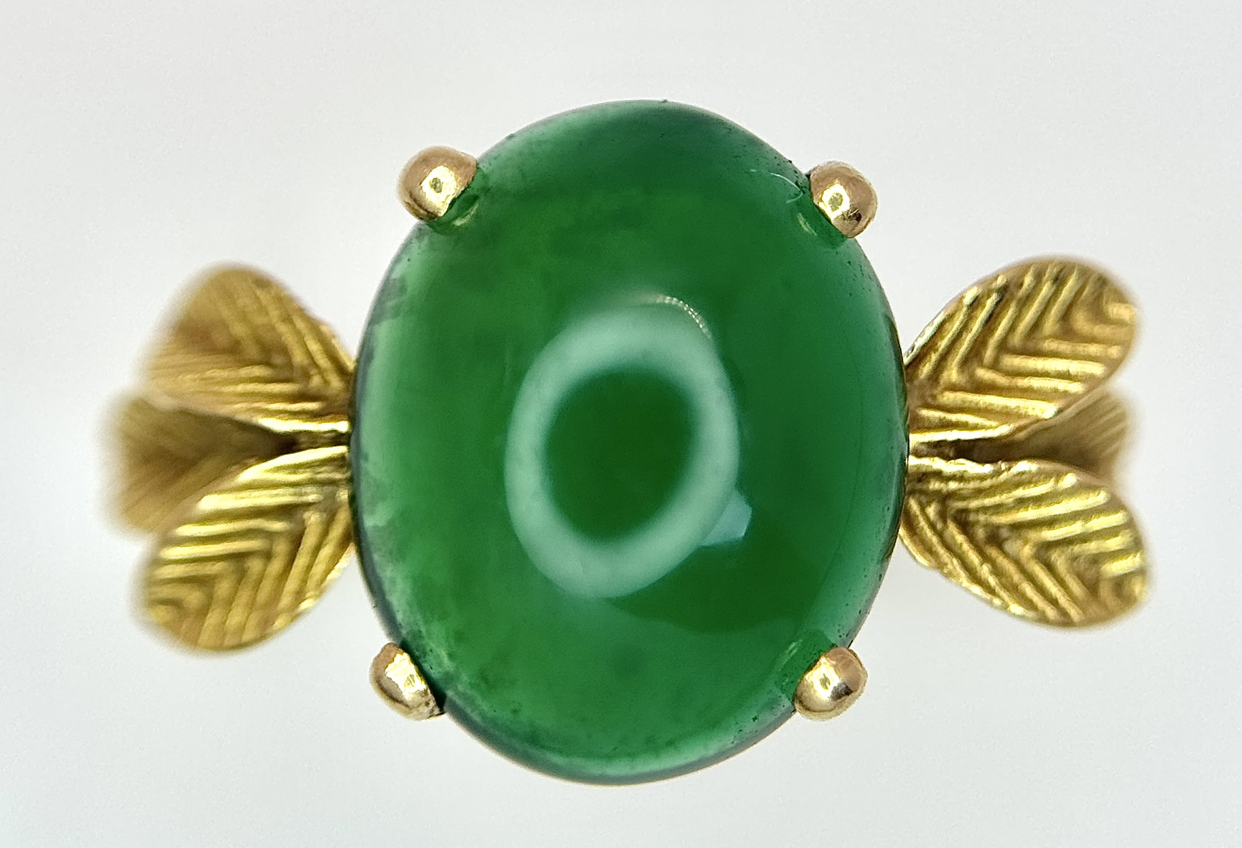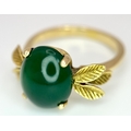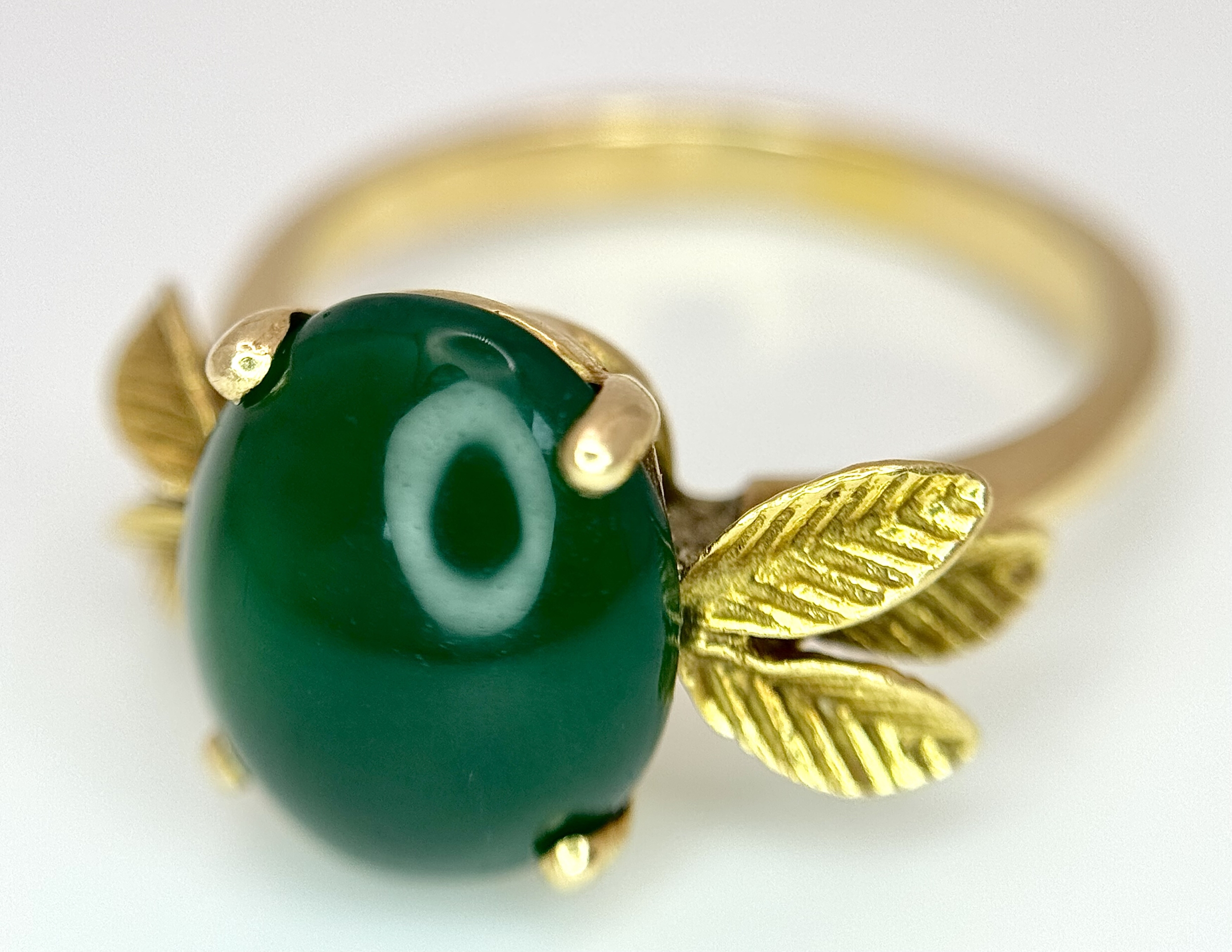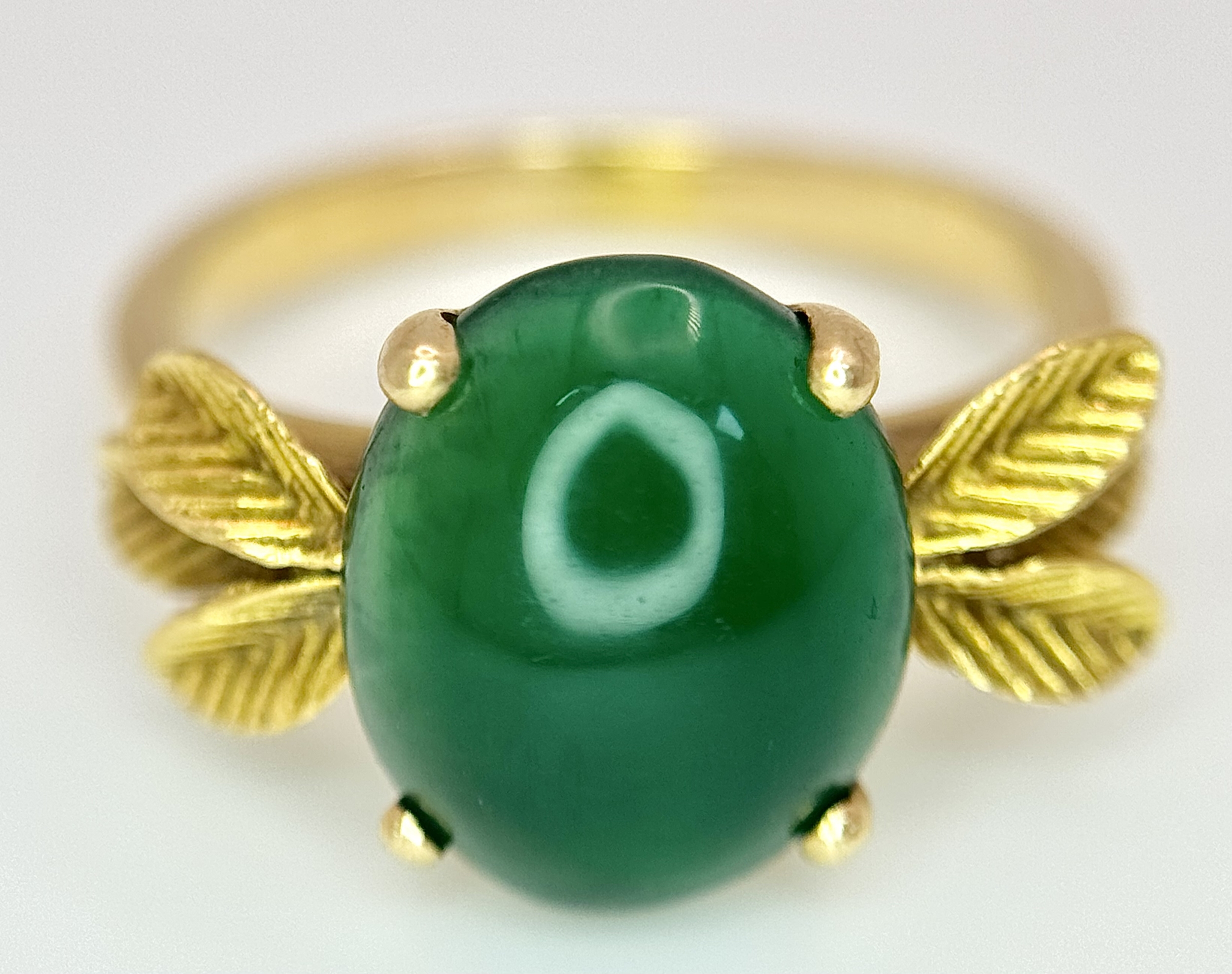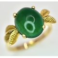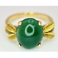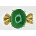 AN 18K GOLD DESIGNER RING WITH A CENTRAL JADE CABOCHON CLAW SET . 4.3gms size O