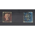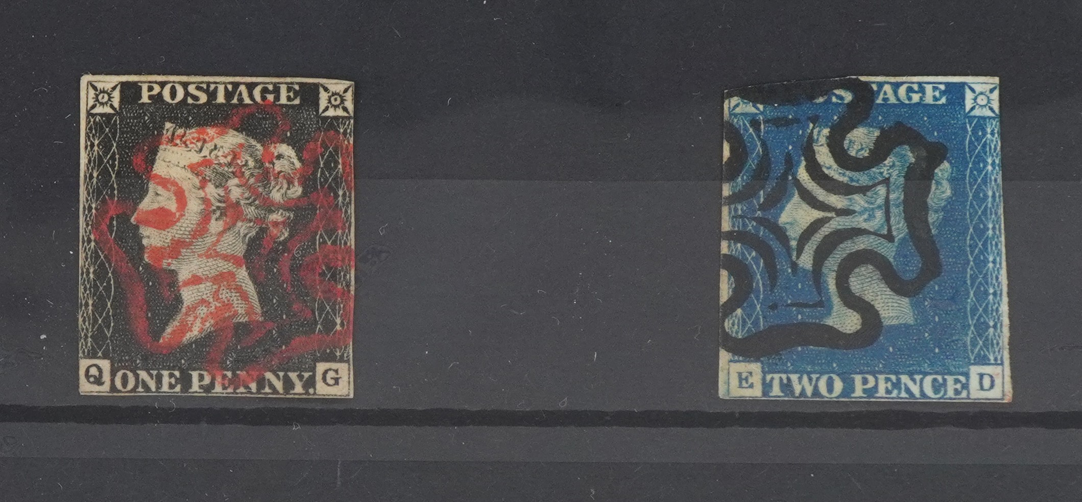 A Victorian 1840 Penny Black QG with red Maltese cross and an 1840 Two Penny Blue ED with a black Maltese cross.