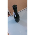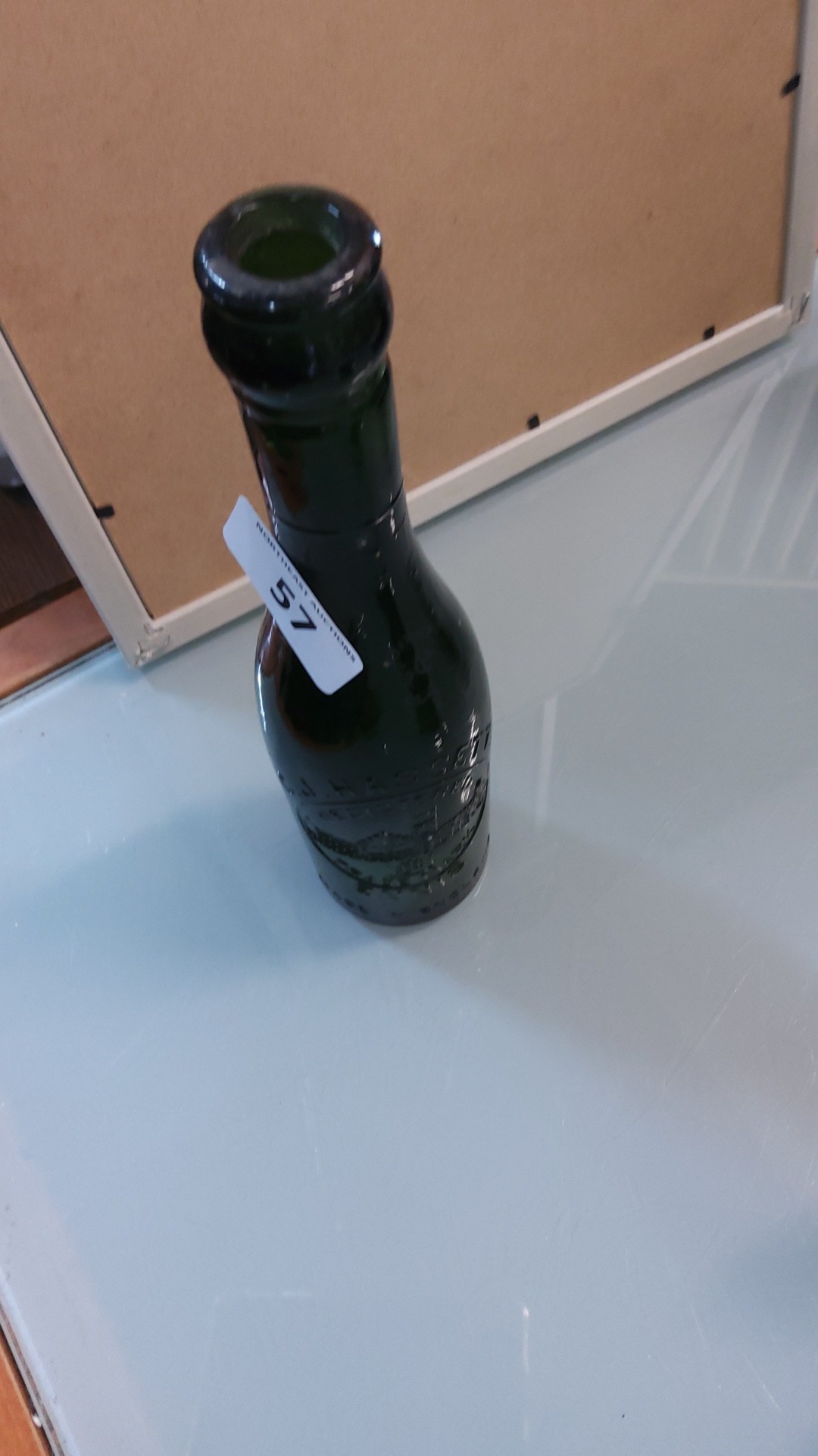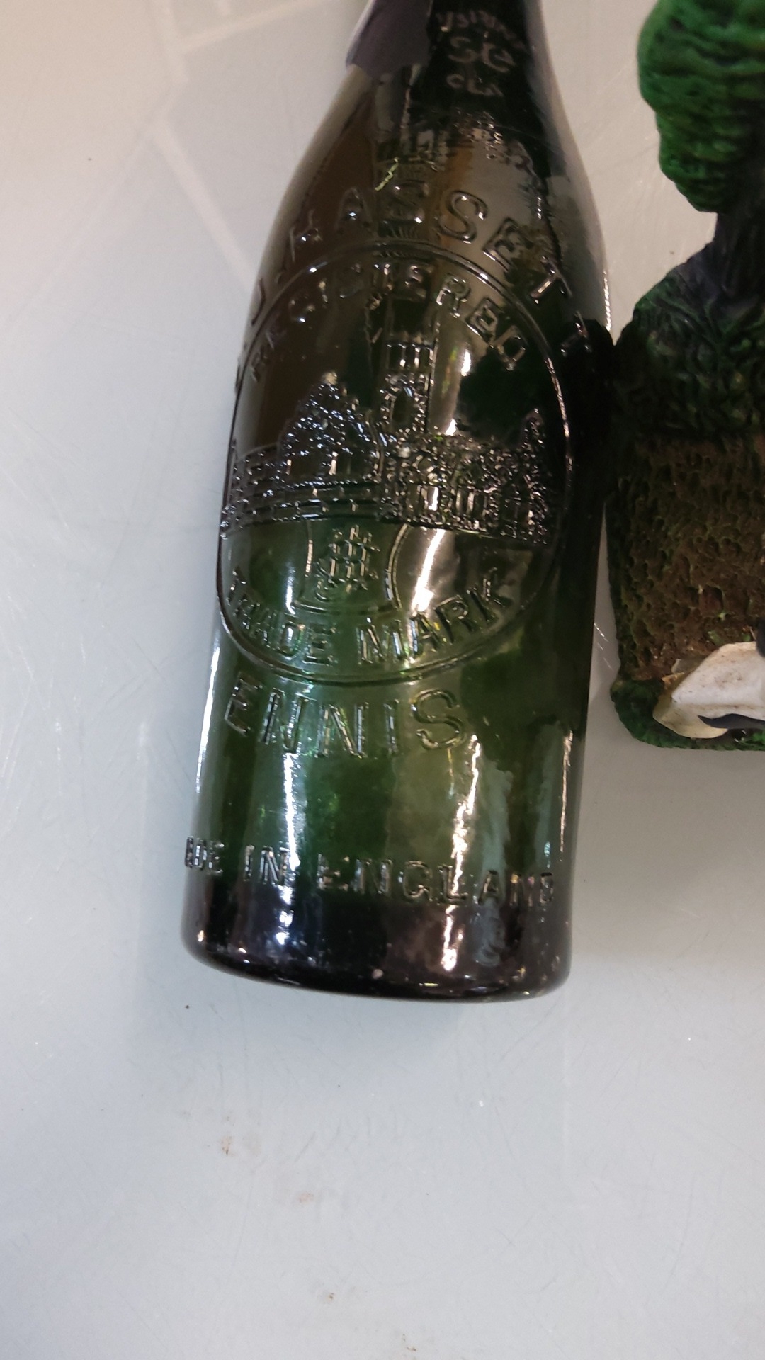 Dark green glass beer bottle with tapered neck, embossed castle vignette, “TRADE MARK ENNIS”
