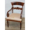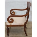 An antique Regency style carved armchair with decorative scroll arms, carved back and turned and carved legs, stuffed seat, 56cm wide x 91cm tall