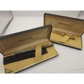 A Sheaffer fountain pen and ballpoint pen. (1) A Sheaffer white dot fountain pen with graphite style barrel and an inlaid nib marked 585 14K, original label to the pen 'SHEAFFER Medium', matched with a Sheaffer box labelled stainless steel - few signs of use. (2) A Sheaffer Targa white dot gold-plated ballpoint pen, with box and original label to the pen 'TARGA 1005 FINE' - few signs of use