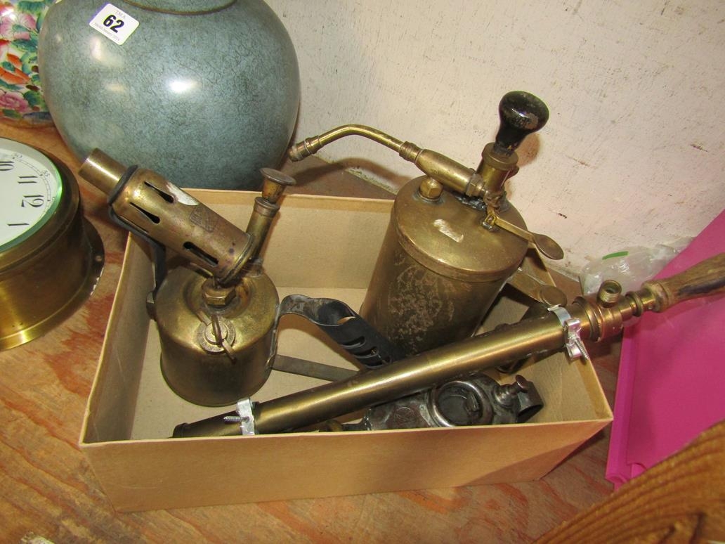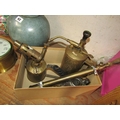 BOX OF BRASSWARE TO INCL BLOW LAMP
