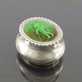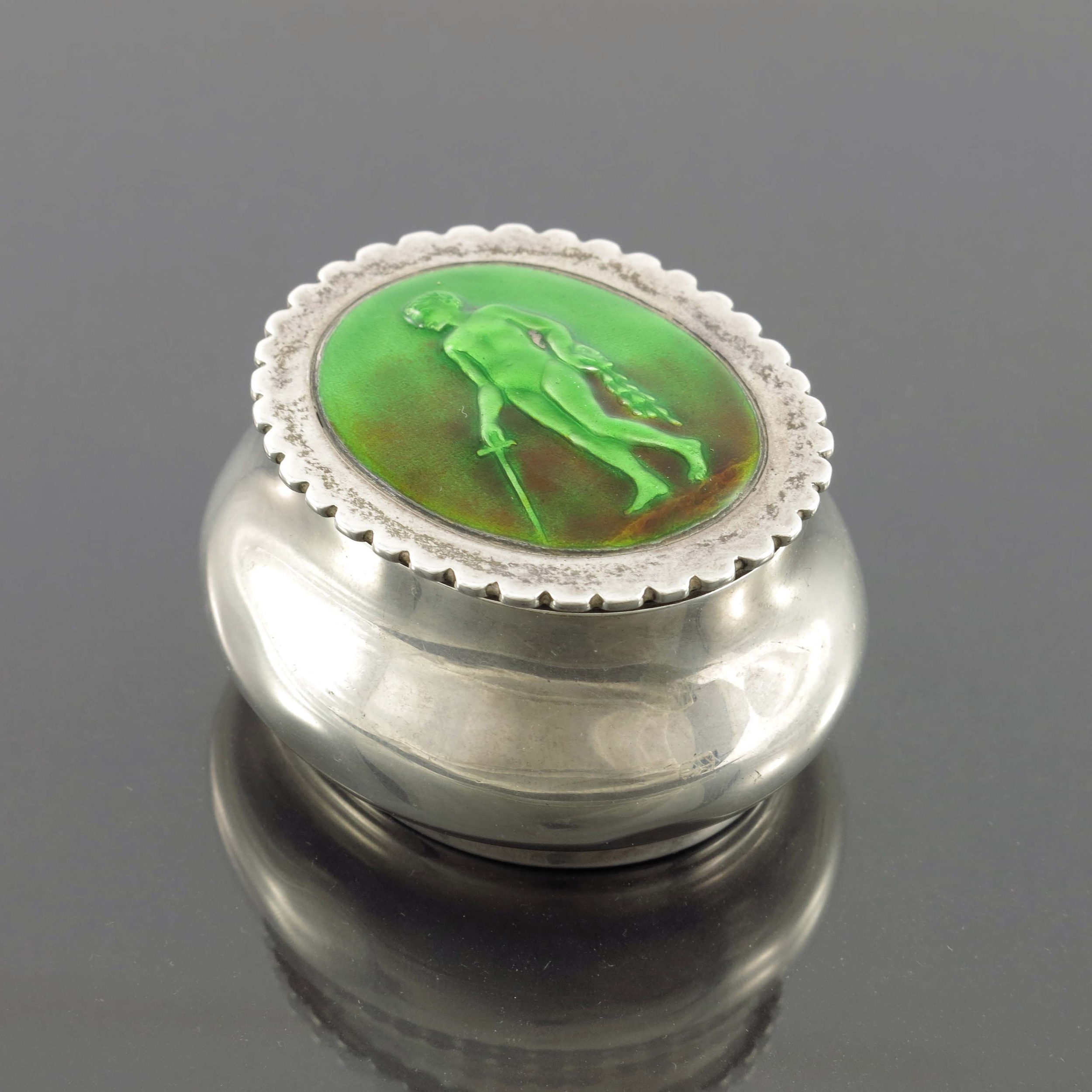 A Revivalist Arts and Crafts silver and enamelled box and cover, Child and Child, London 1898, oval section ovoid baluster form, the denticulated lid set with a relief enamel plaque of Perseus with the head of Medusa, in green and ochre, 5.5cm, 1.58ozt