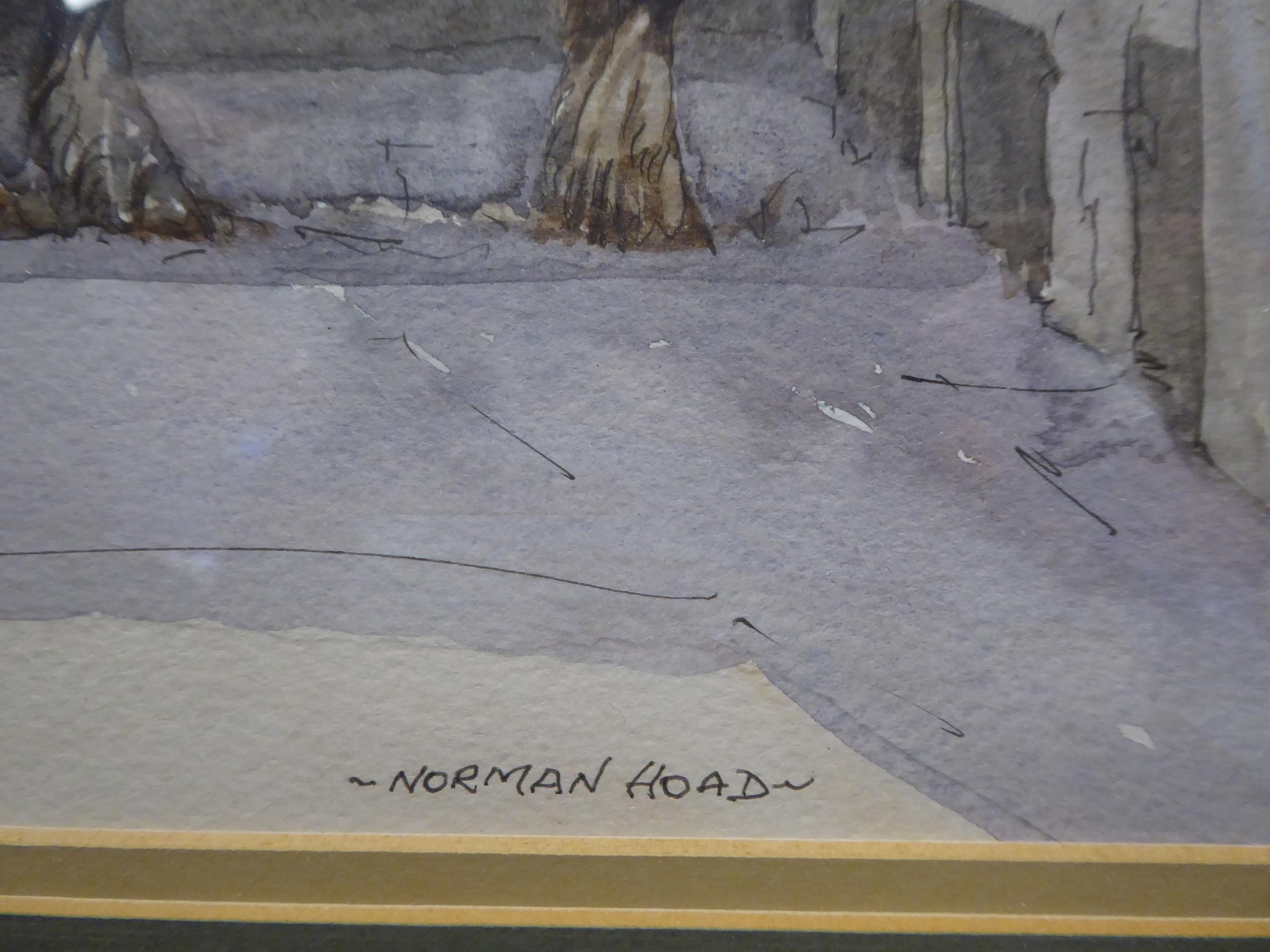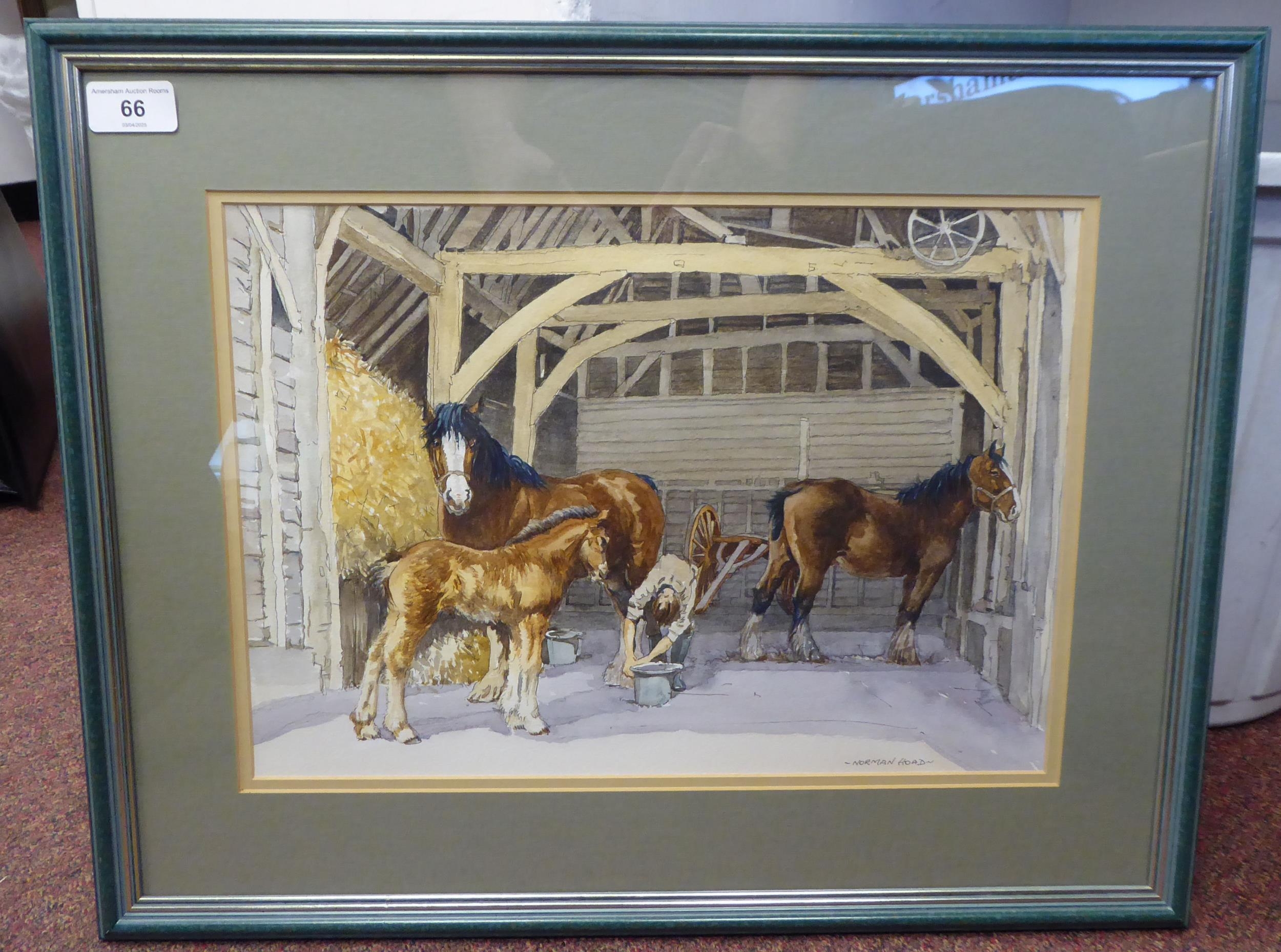 Norman Hoad - horses in a barn with a farrier watercolour bears a signature 11" x 15" framed