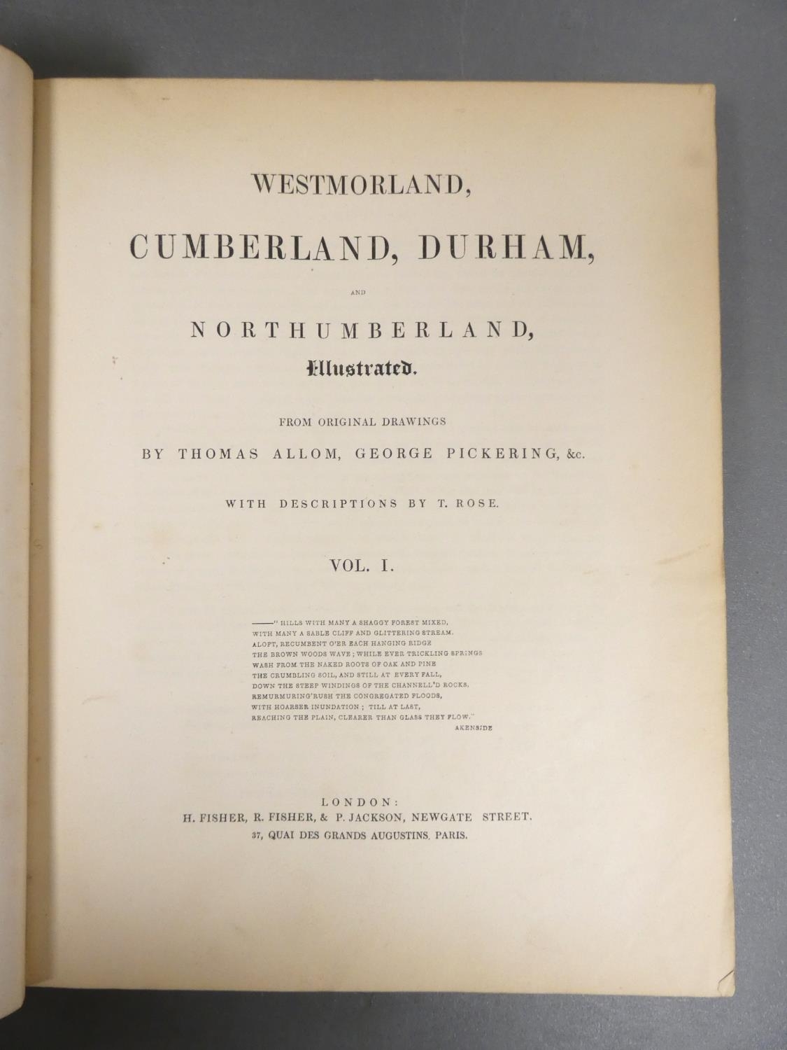 ALLOM T., PICKERING G. & ROSE T. Westmorland, Cumberland, Durham & Northumberland. Vol. 1. Many half page eng. plates. Quarto. Maroon morocco gilt. 1833 & 3 other vols. (4).