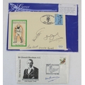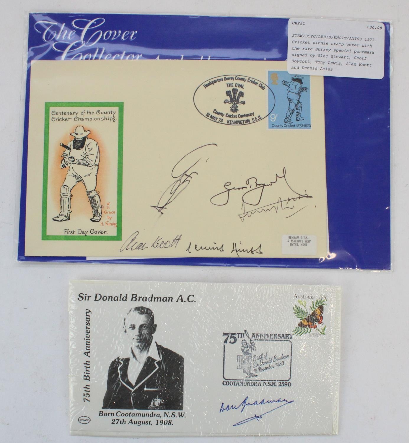 Sir Donald Bradman A.C. 75th birth anniversary signed stamp cover together with a CCC centenary FDC with Surrey postmark and signed by Stewart, Boycott, Lewis, Knott and Amiss