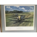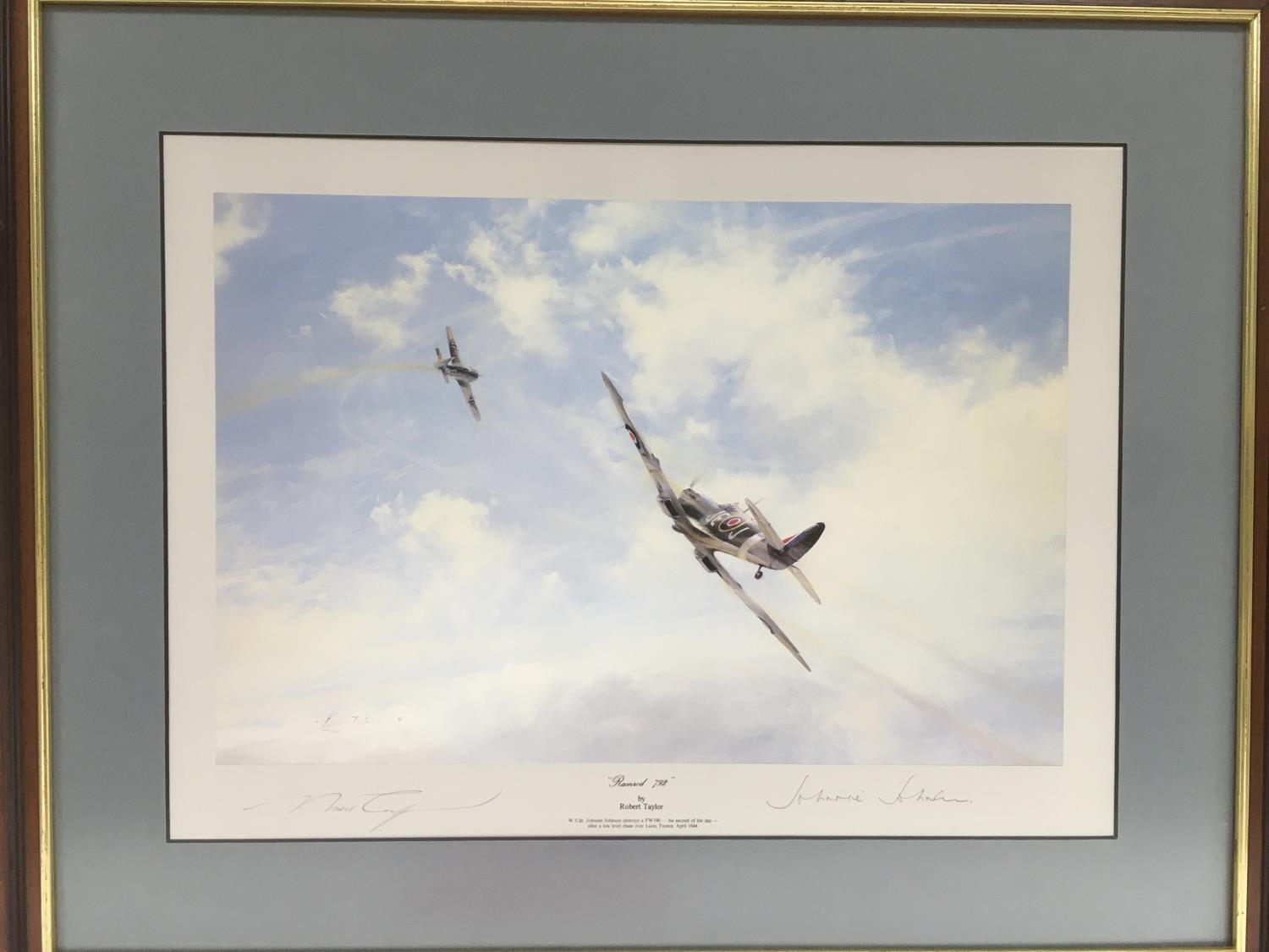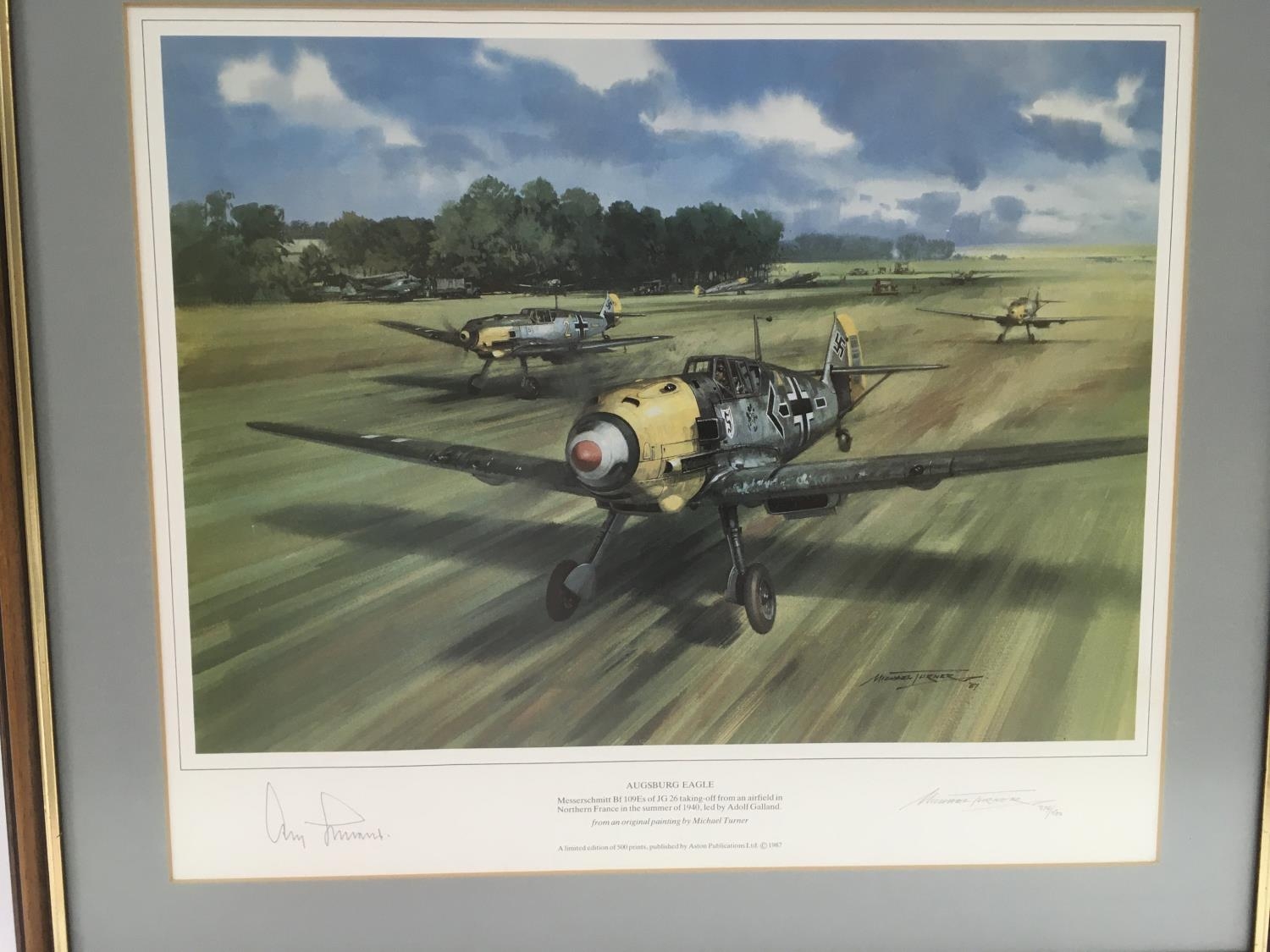 Two signed WW2 aircraft prints comprising Ramrod 792 by Robert Taylor and signed by Wing Commander Johnnie Johnson plus Augsburg Eagle by Michael Turner signed by Adolf Galland.