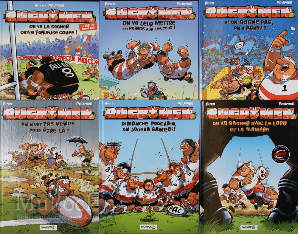 French Asterix-Style Rugbymen Cartoon Books (6): In mint condition, the five editions of these colourful cross-channel capers plus a best-of omnibus volume. Typical French design flair, v enjoyable