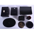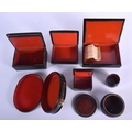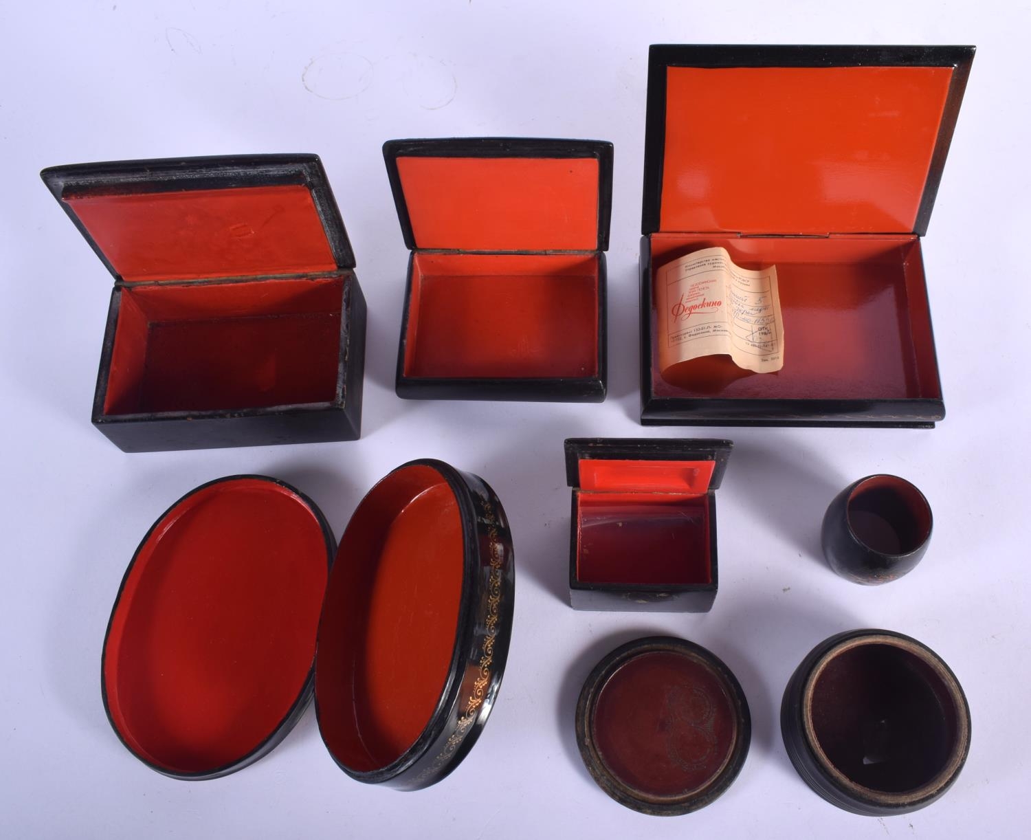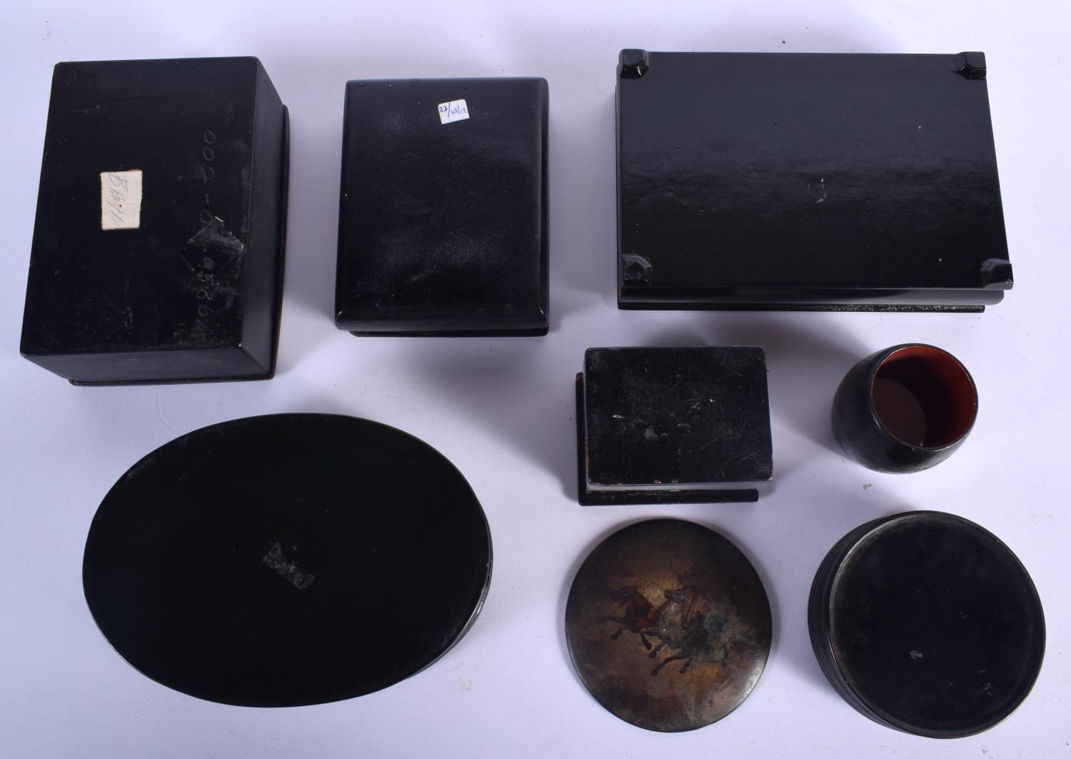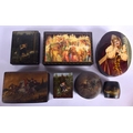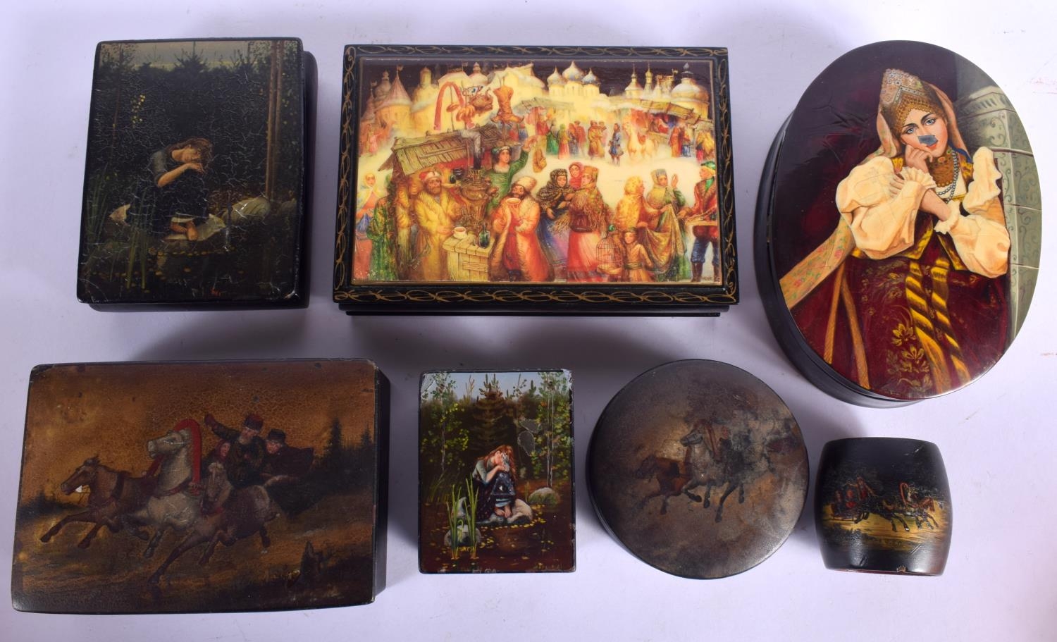 FIVE 19TH CENTURY RUSSIAN BLACK LACQUER PAPER MACHE BOXES decorated with various scenes, together with another 1980s box & a napkin ring. Largest 15 cm cm x 12 cm. (7)