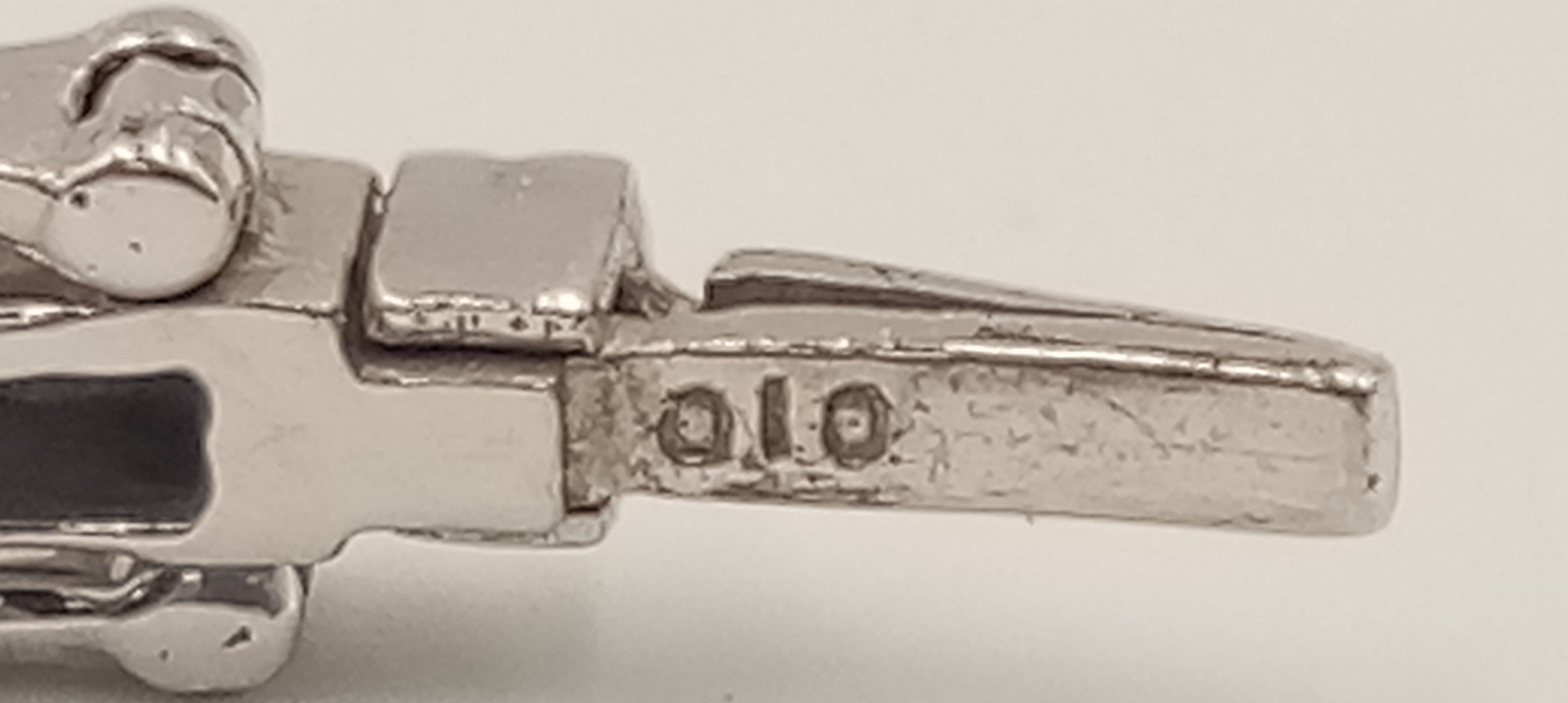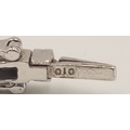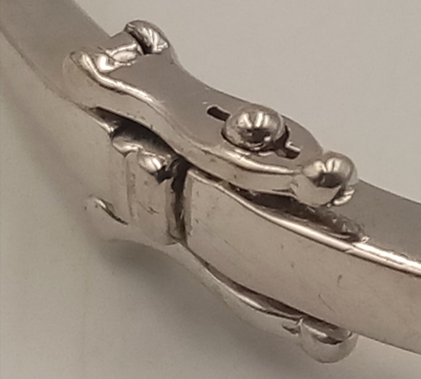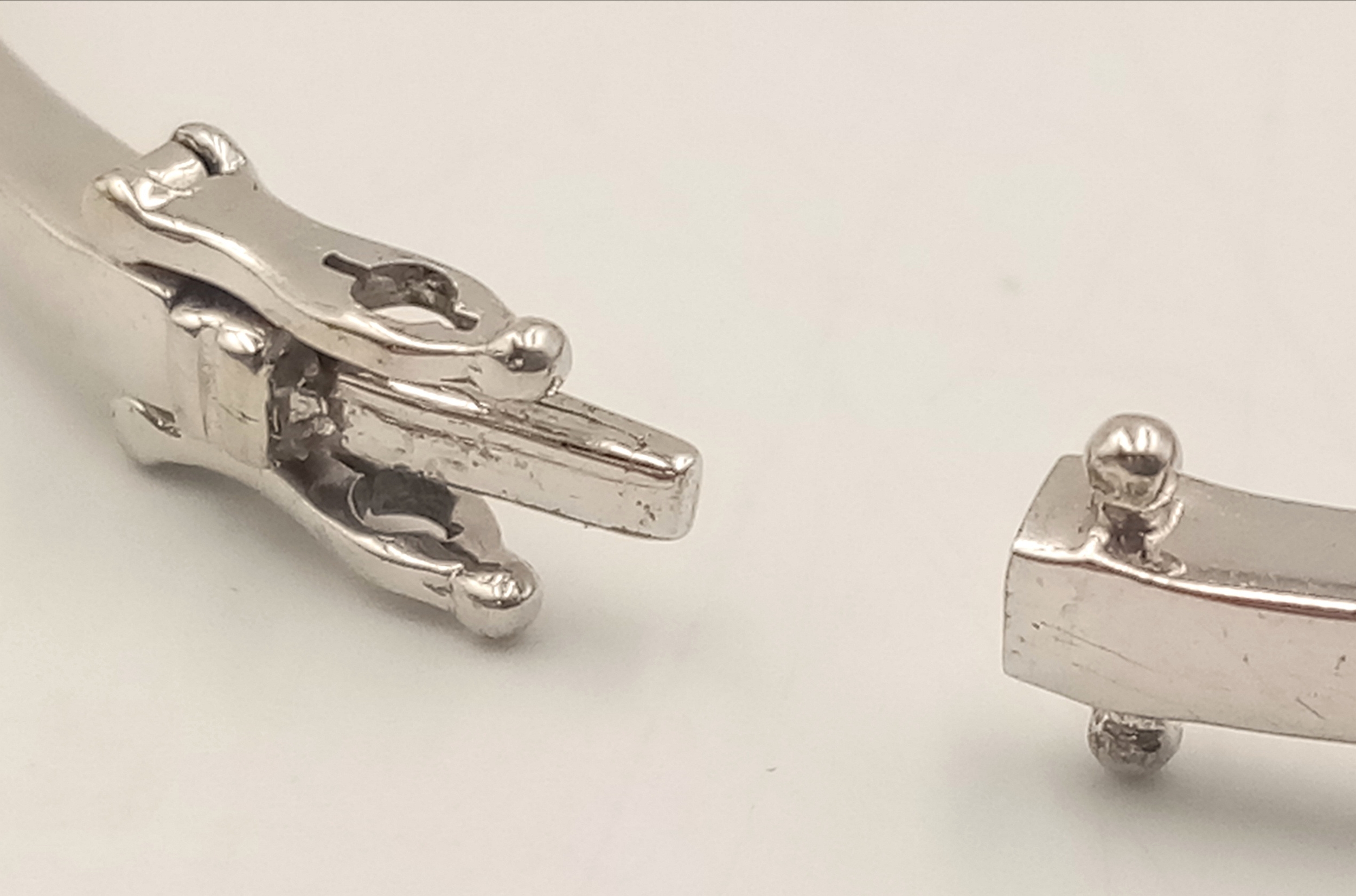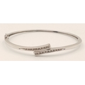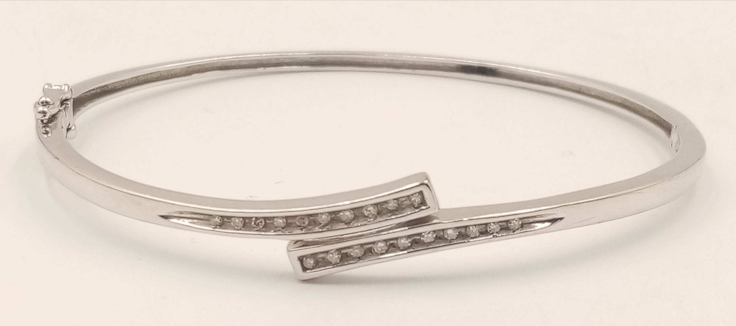 A 9K WHITE GOLD DIAMOND SET HINGED BANGLE WITH 2 SAFETY CATCHES . 7.7gms