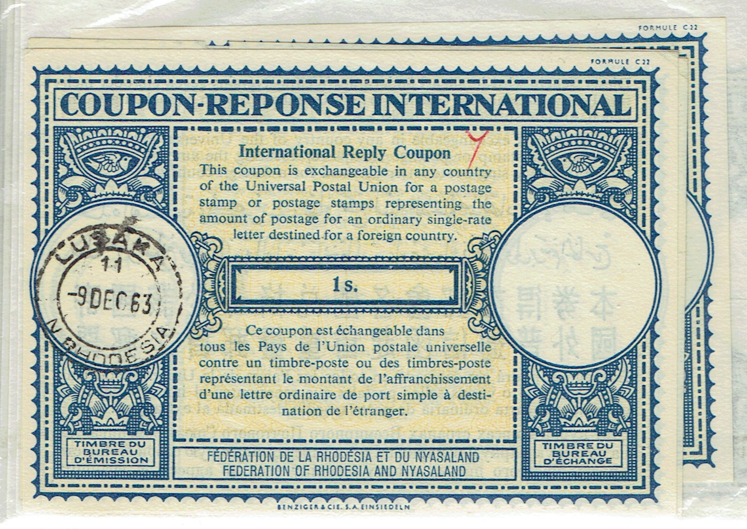 REVENUES & CINDERELLA - Imperial Reply Coupon small collection of 1960s-70s designs from British Africa countries noted N. Rhodesia 1953 8d KITWE, Rhodesia & Nyasaland 1963 surcharged BLANTYRE (2), 1964 1s SALISBURY (3), LUSAKA (2), 1973 surcharged 3 times HIGHLANDS (2), 1970s UPU design Rhodesia UMVUKWES, Zambia 16ng KITWE / LUSAKA AIRPORT (11), 14ng KITWE (2), UPU C22 design 31ng, surcharged, 16ng (4), mainly fine. (34).