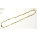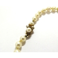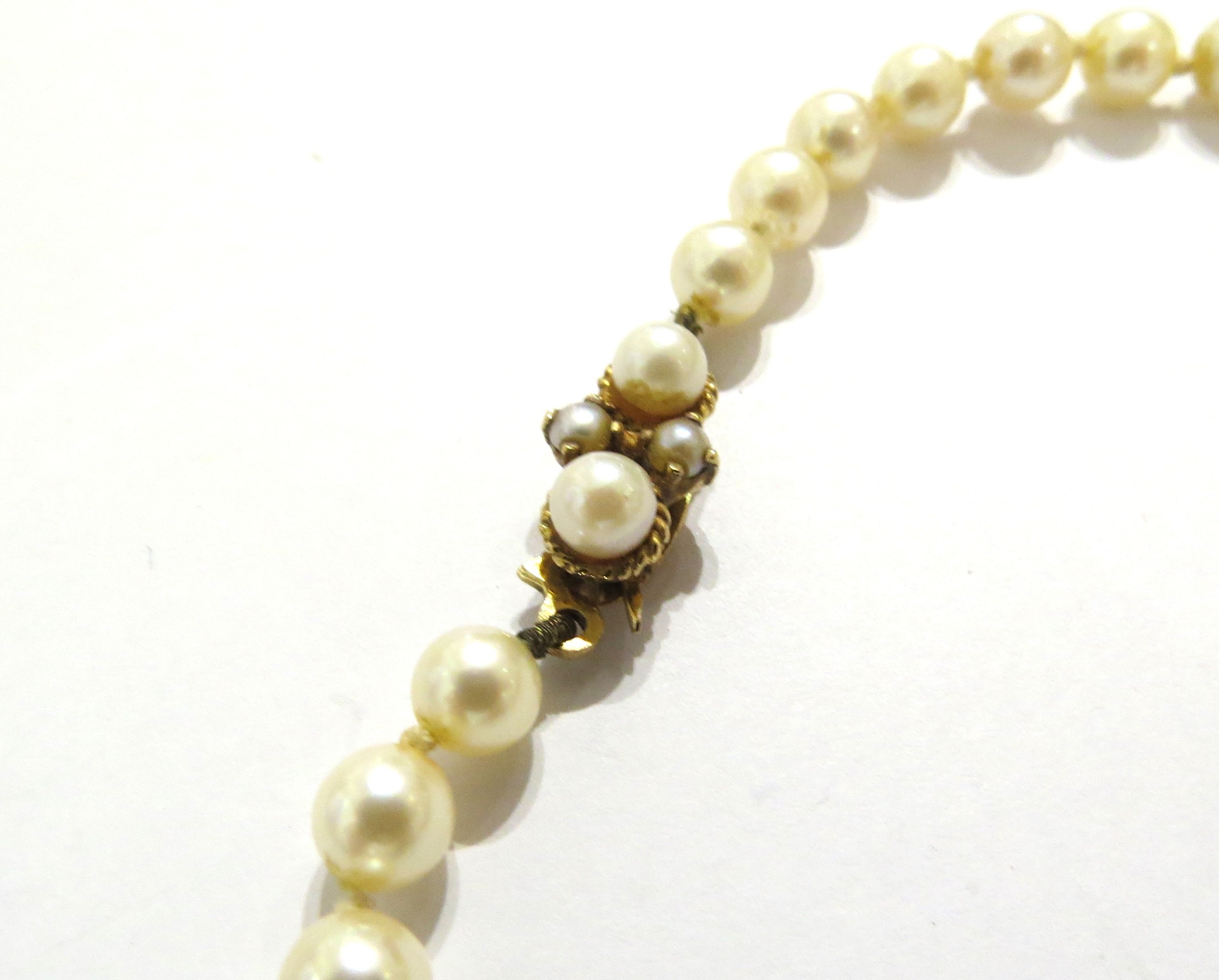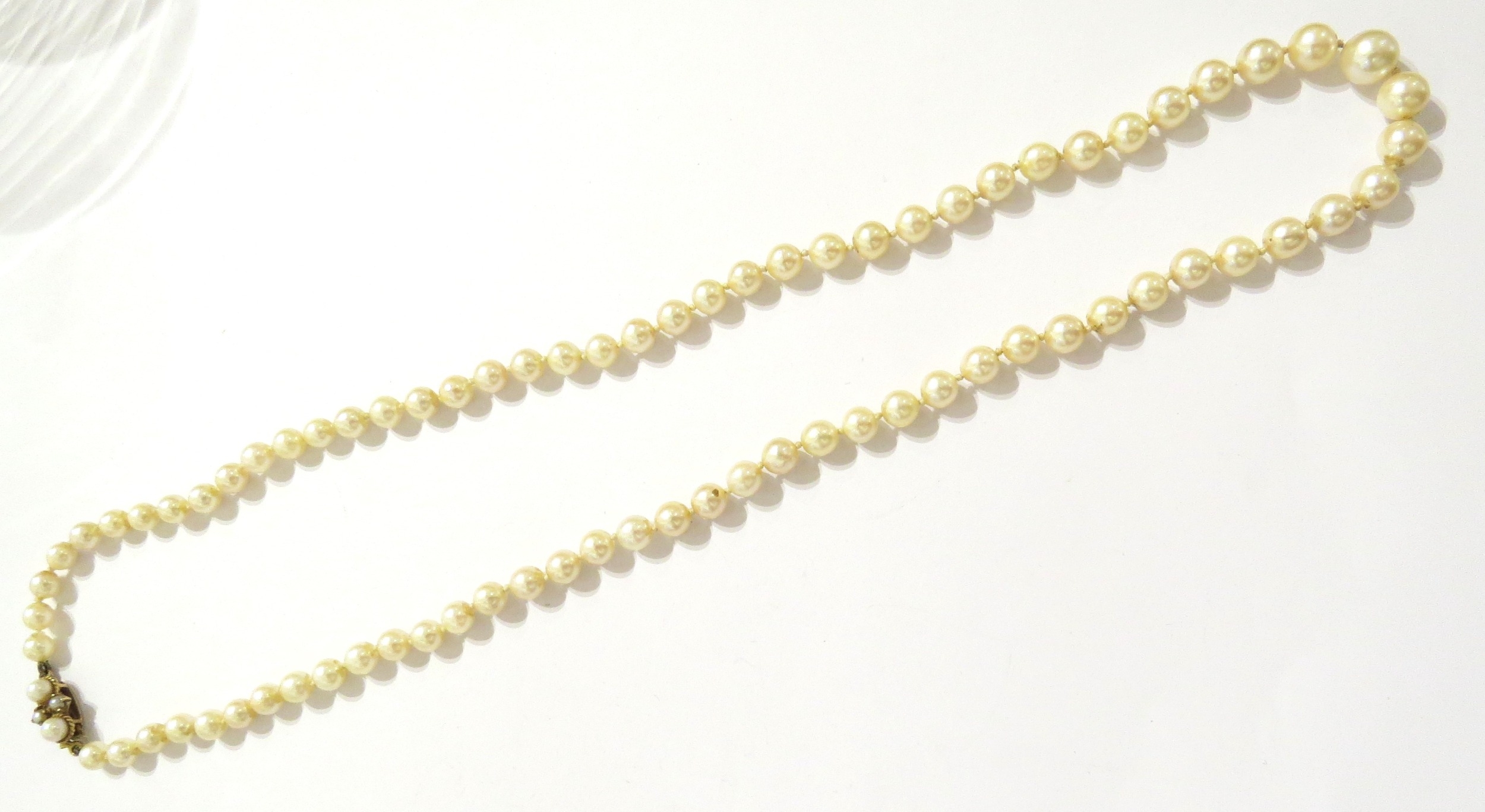 A single strand graduated pearl necklace with 9ct gold pearl set clasp, 56cm long