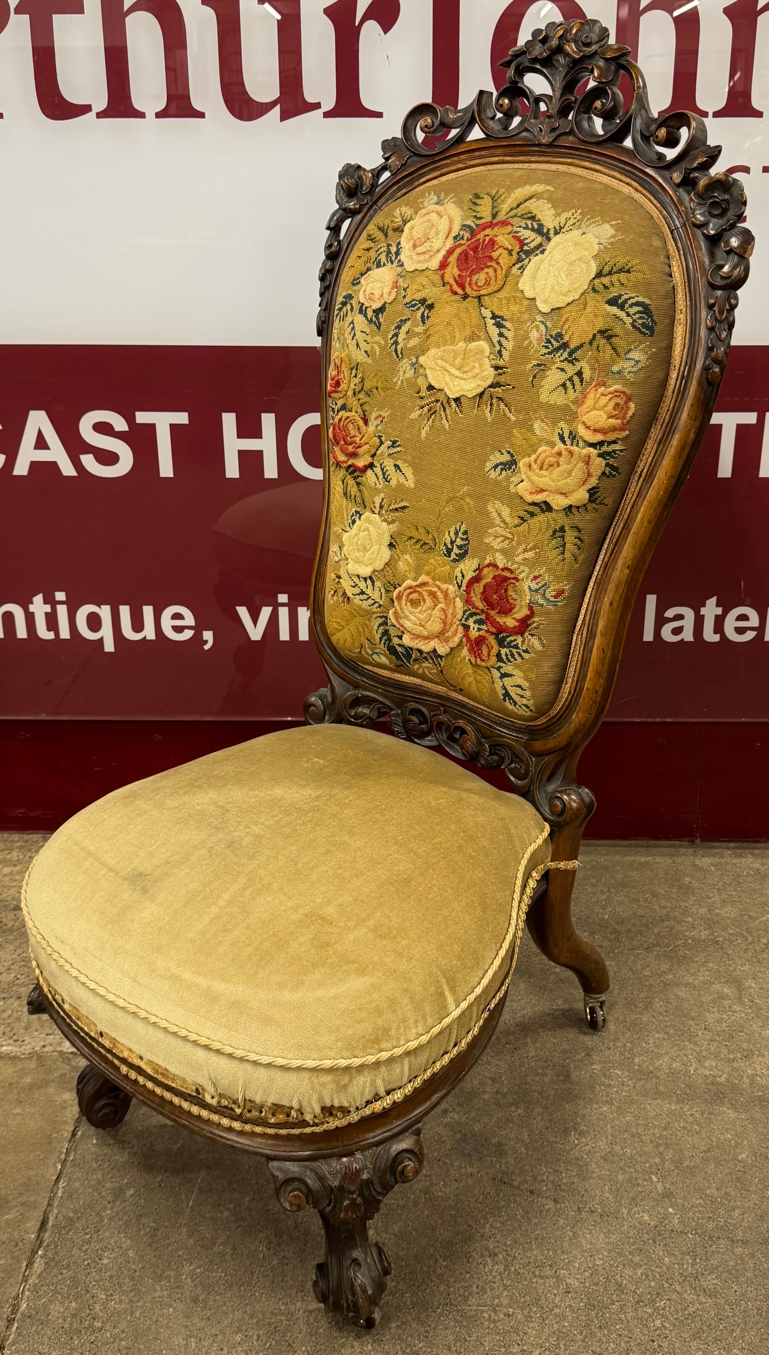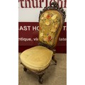 A Victorian carved mahogany embroidered fabric upholstered lady's chair