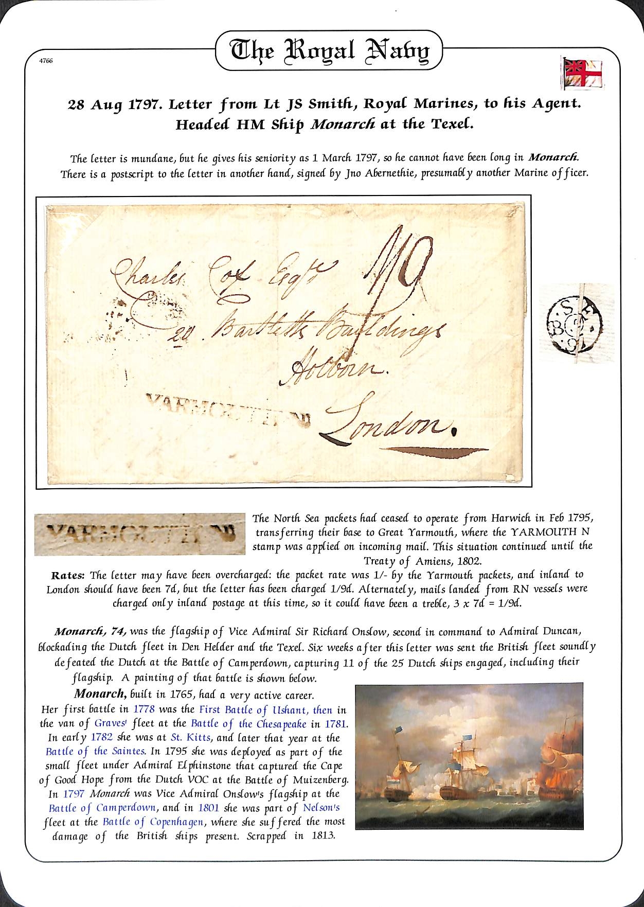 1797 (Aug 28) Entire letter from Lt. J.S Smith of the Royal Marines on H.M.S "Monarch" at the Texel, posted at Yarmouth, Norfolk to London charged 1/9. The "Monarch" was the flagship of Admiral Sir Richard Onslow, then blockading the Dutch Fleet in the Texel; on October 11th the British defeated the Dutch at the Battle of Camperdown.