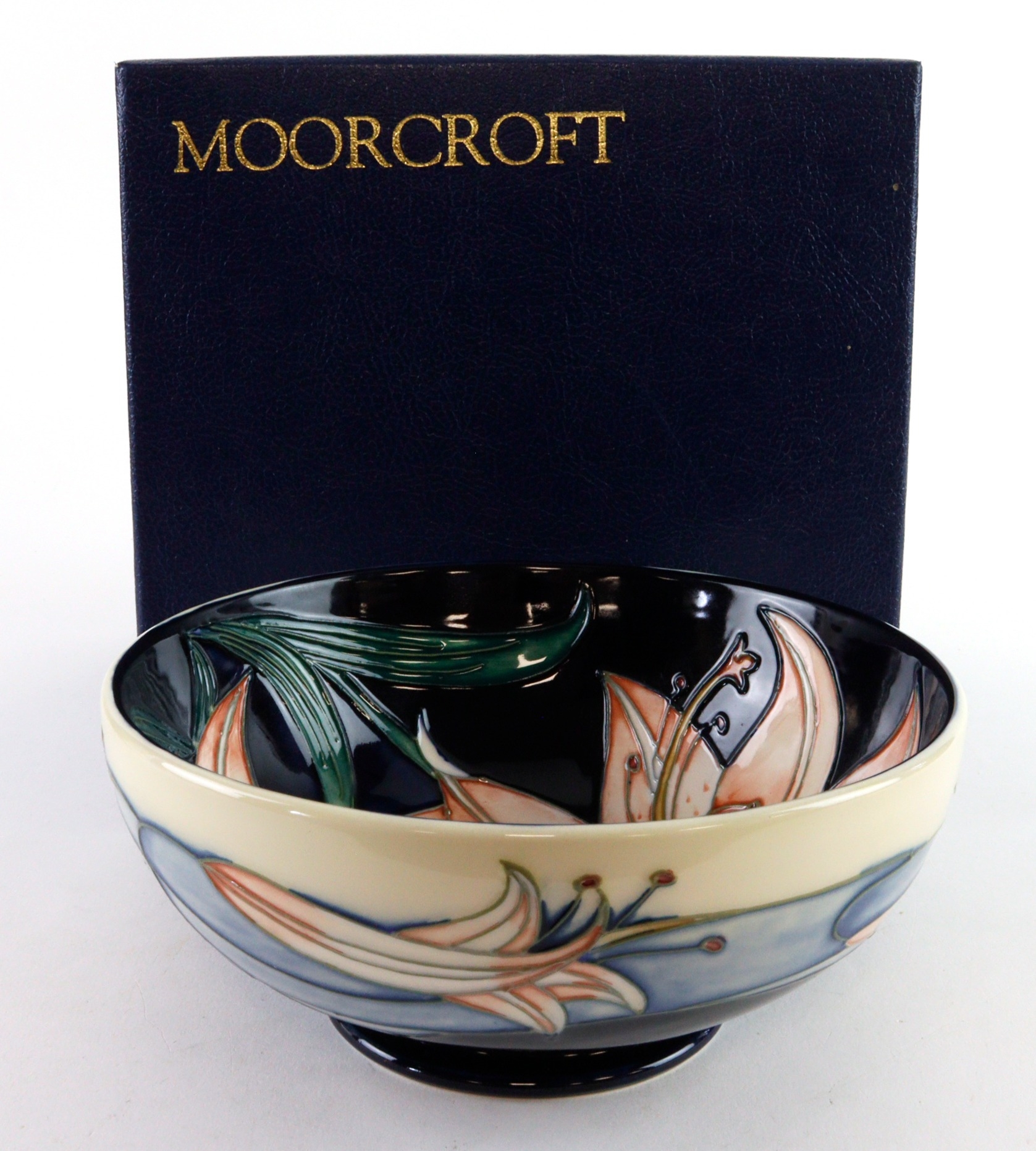 Moorcroft 'Pink Damask' pattern bowl (no. 308), designed by Philip Gibson, dated 2004, makers marks to base, diameter 16.5cm approx., contained in a Moorcroft box