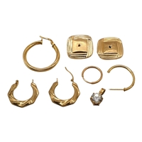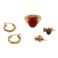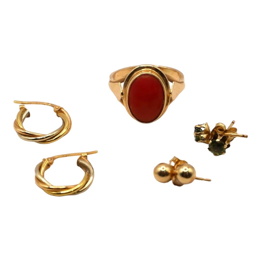 A VINTAGE POLISH 14CT GOLD AND RED CORAL RING, TOGETHER WITH TWO PAIRS OF 14CT GOLD STUD EARRINGS AND PAIR OF 18CT AND GOLD HOOP EARRINGS