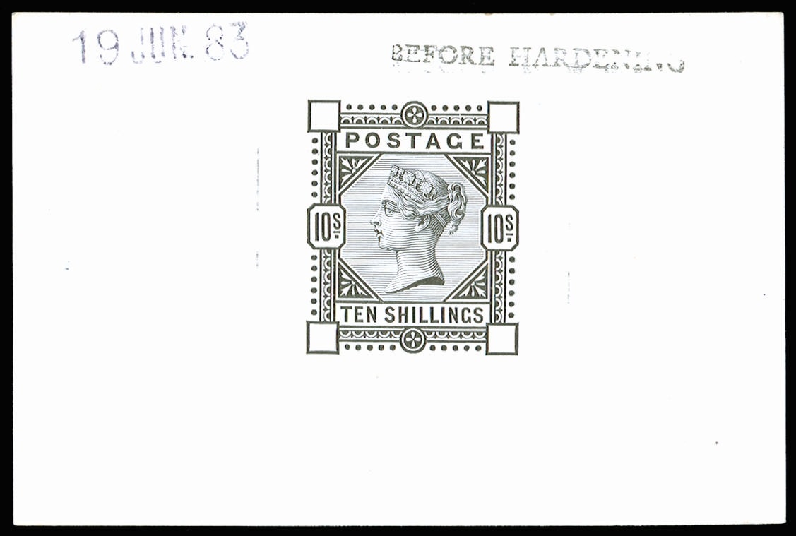 1883 10s Die proof. Very fine and fresh example printed by DLR in black on white glazed card (92 x 60mm) endorsed "BEFORE HARDENING" and dated "19 JUN. 83". Scarce.