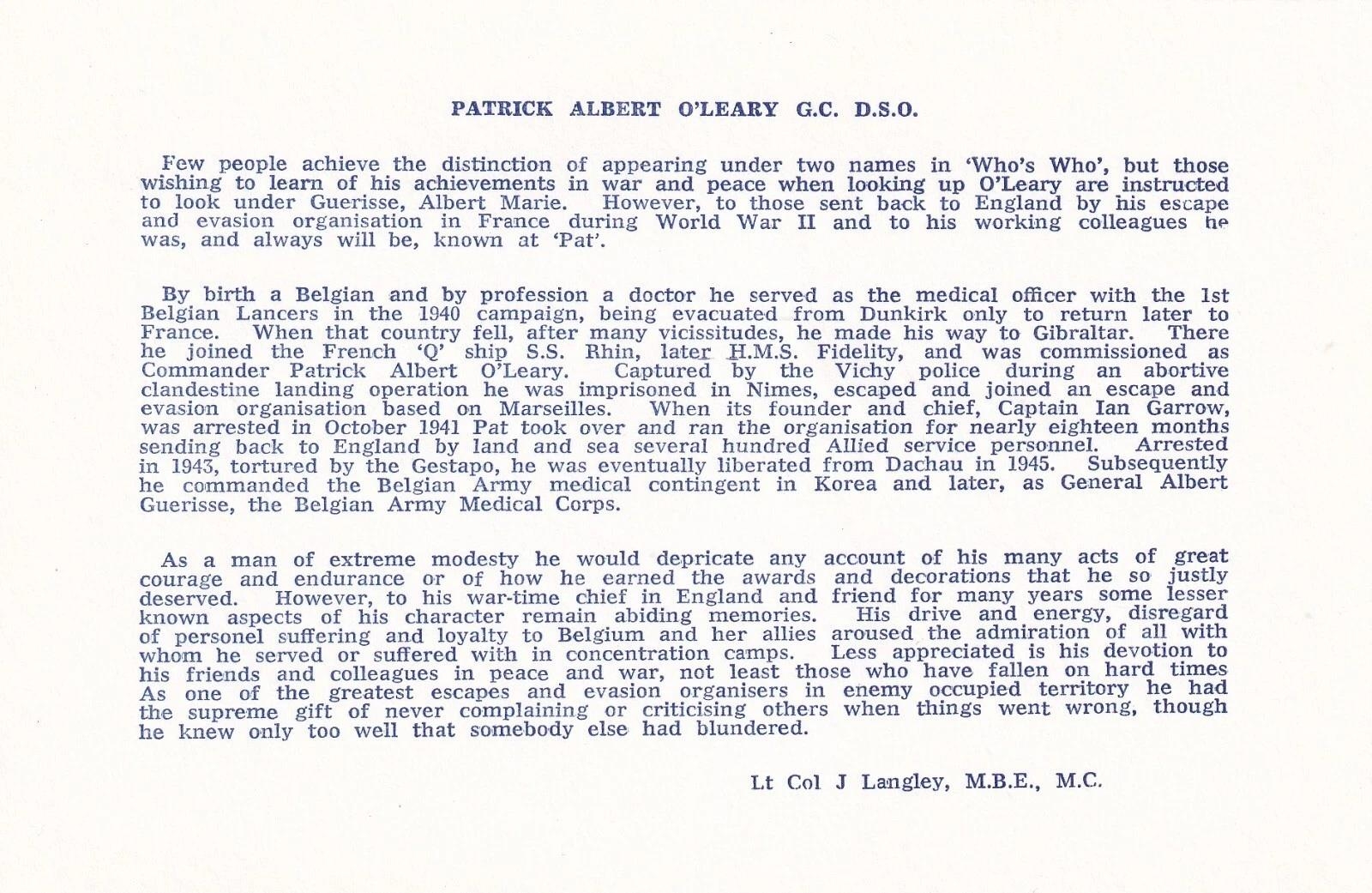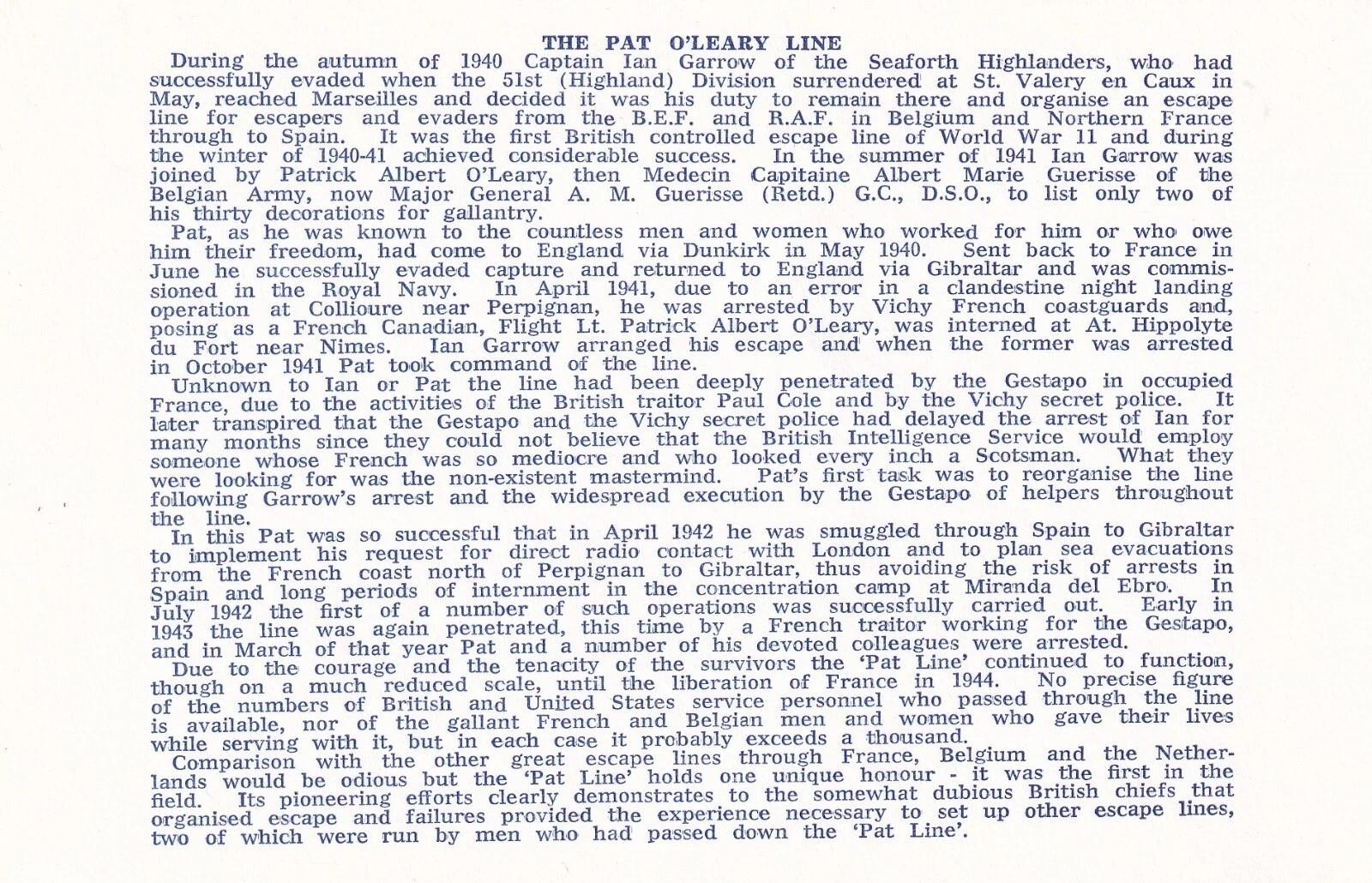 ES22d The Pat O'Leary Line. Signed by Pat O'Leary George Cross DSO. 10 7 1979 Toulouse The Pat O'Leary Line. Personally Signed by Pat O'Leary George Cross DSO. Major-General Albert-Marie Edmond Guérisse, GC DSO, Under the cover name of Pat O'Leary, a name borrowed from a peace-time Canadian friend, he ran one of the biggest and best of the escape and evasion lines of World War II. Certified Copy 126 of 352 Good condition. All autographs come with a Certificate of Authenticity. We combine postage on multiple winning lots and can ship worldwide. UK postage from £5.99, EU from £7.99, Rest of World from £9.99