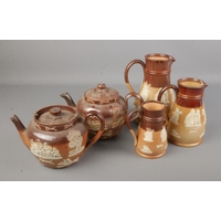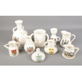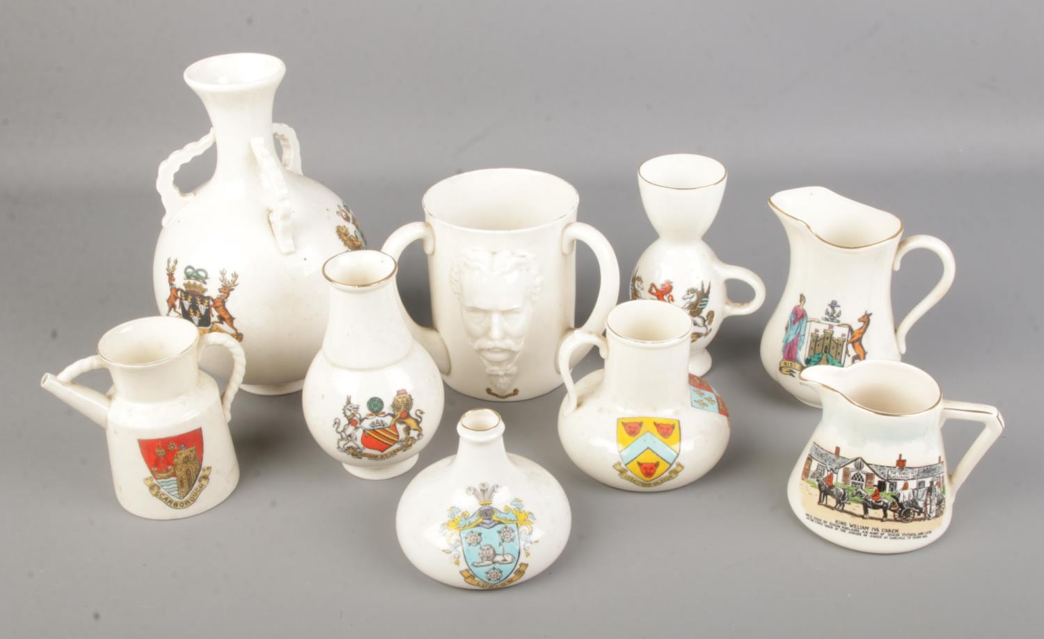A collection of larger Goss crested ware pieces including triple handled tankard, various jugs and vases