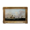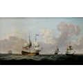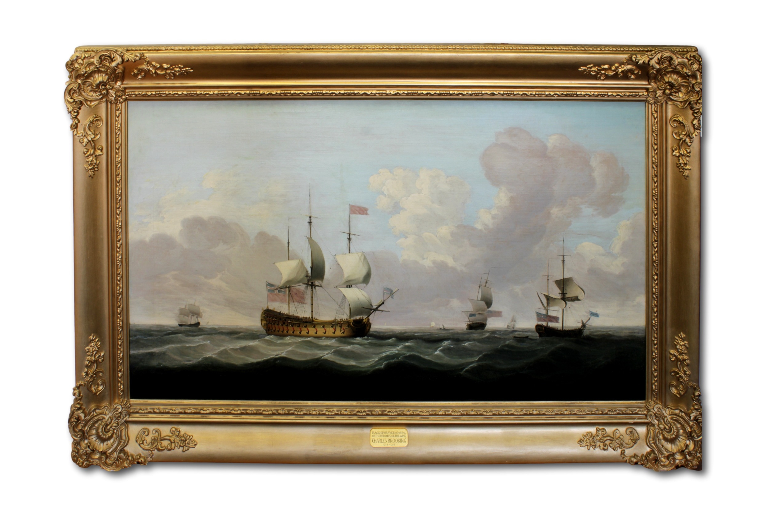 Circle of Charles Brooking (British, 1723-1759), A Flagship wearing a flag of the Vice Admiral of the Red, before the windOil on canvas, 70cm x 125cm* This painting was originally one of a pair, owned by the financier Harold Fortington, who leased the island of Jethou between 1934 and 1949, taking over the lease from the author Sir Compton MacKenzie. It is believed that some of the contents were acquired with the property. The house on Jethou was commandeered by the German occupying forces during the Second World War and used as an officer's club, until fuel shortages made this impractical, at which time some of the contents were moved to Guernsey. The pair to this picture, subject unknown, is believed to have been seized by the German occupiers during this period. After liberation, some of these contents were moved back to the island by the Fortington's daughter, the late Mrs Nadia Moulton-Barrett.