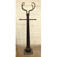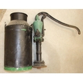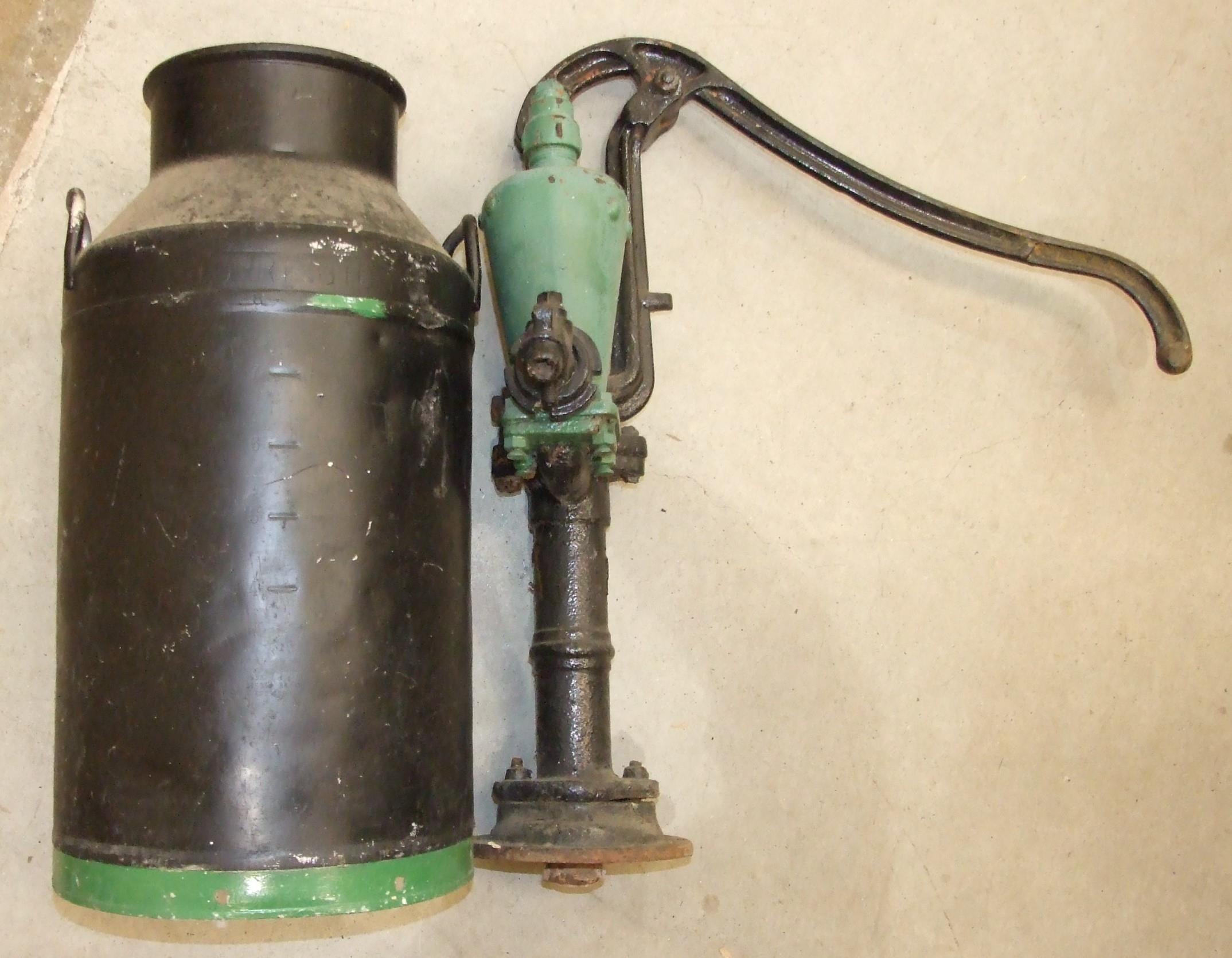 A cast iron mechanical water pump and a painted metal milk churn marked Torrington, (2).