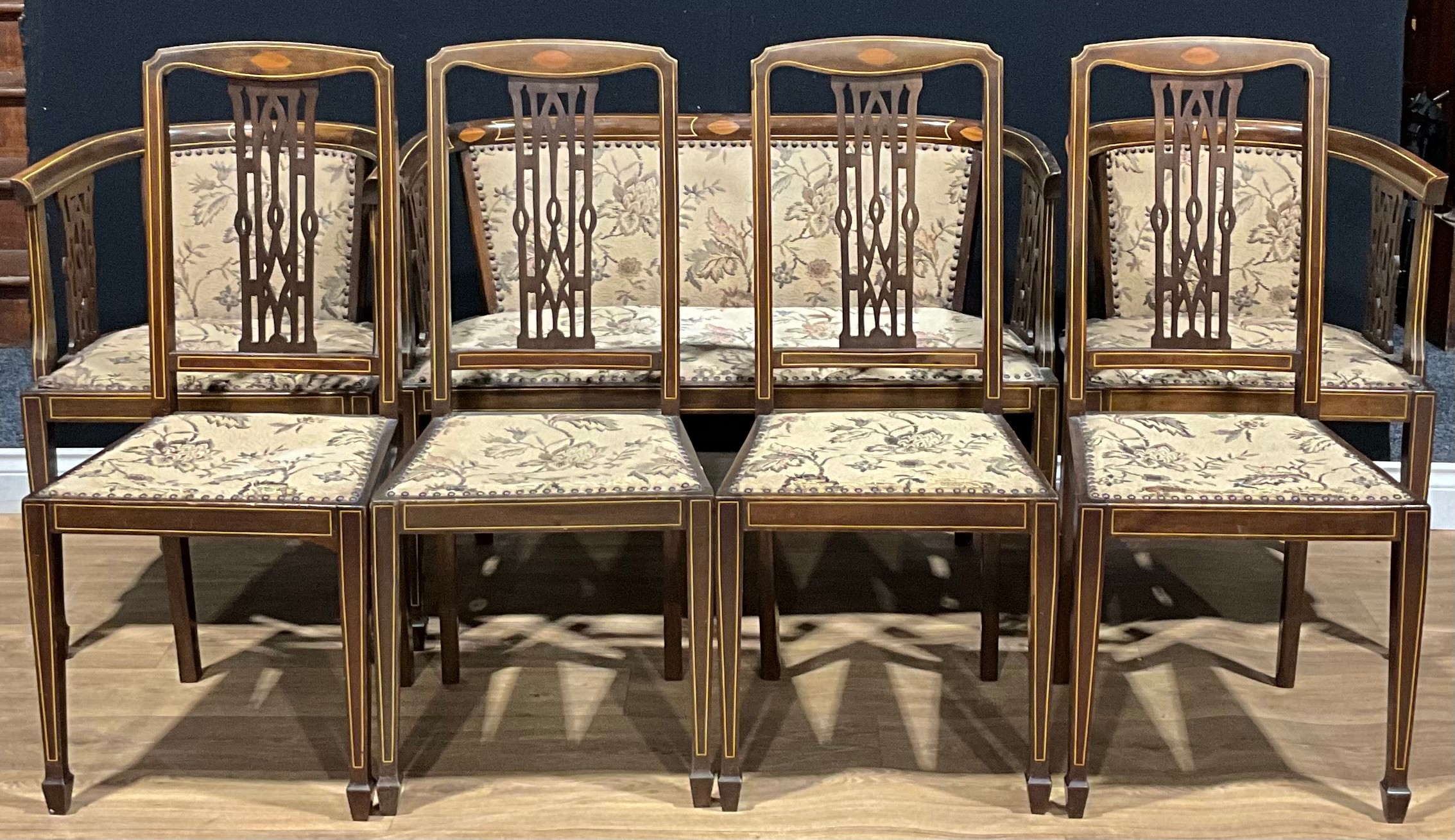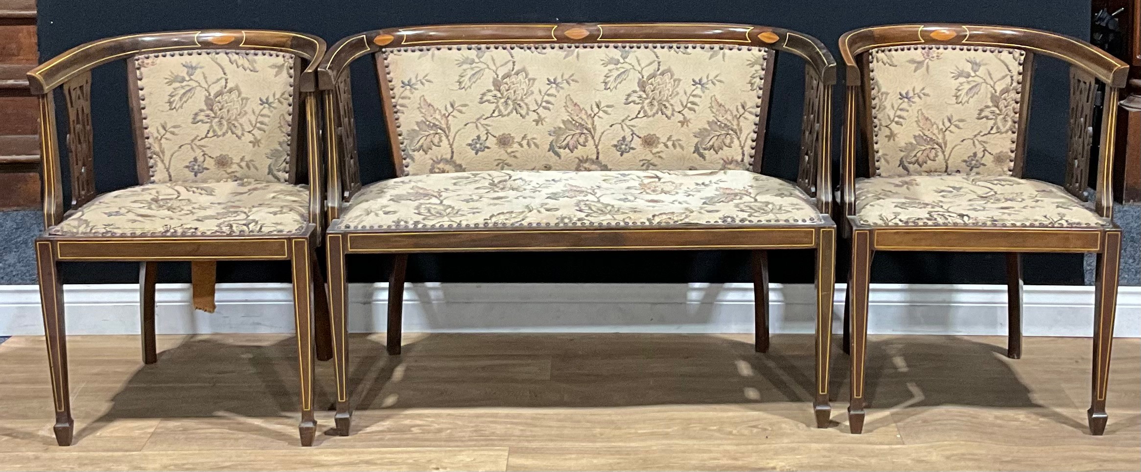 An Edwardian ivorine strung seven-piece salon suite, comprising sofa, a pair of elbow chairs and four side chairs, the sofa 75cm high, 102cm wide (7)
