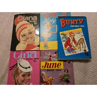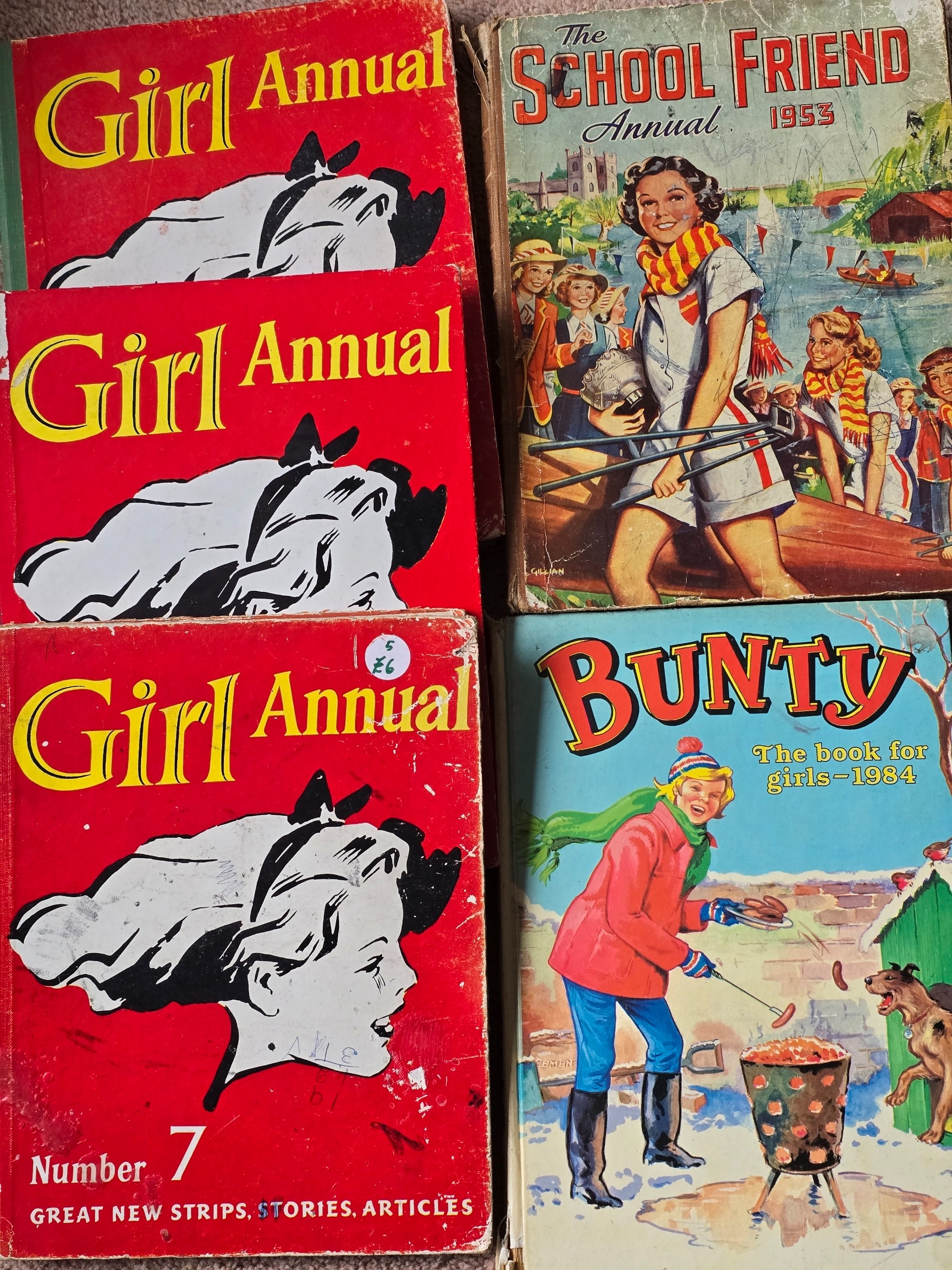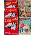Five Girls comic Annuals: - "Girl" Annual x 3 - numbers 5, 6 and 7 from the 1950's. Wonderful social history of nearly 70 yrs ago. Used, but VGC apart from number 7 which has some lower spine and cover damage. Plus 1953 edition of the "School Friend" Annual, albeit not great condition and scribbled on. Plus "Bunty" 1984 annual. Some lower spine damage, name inside and price removed, otherwise good condition. (5)