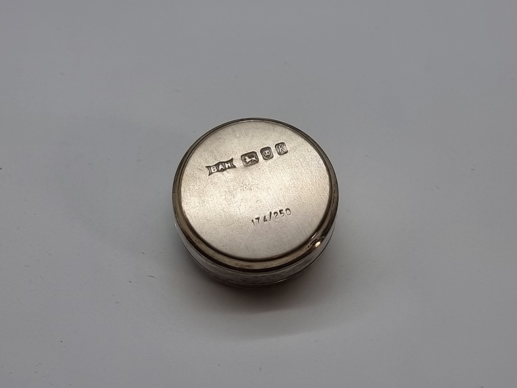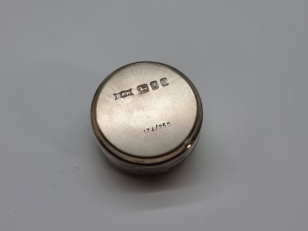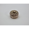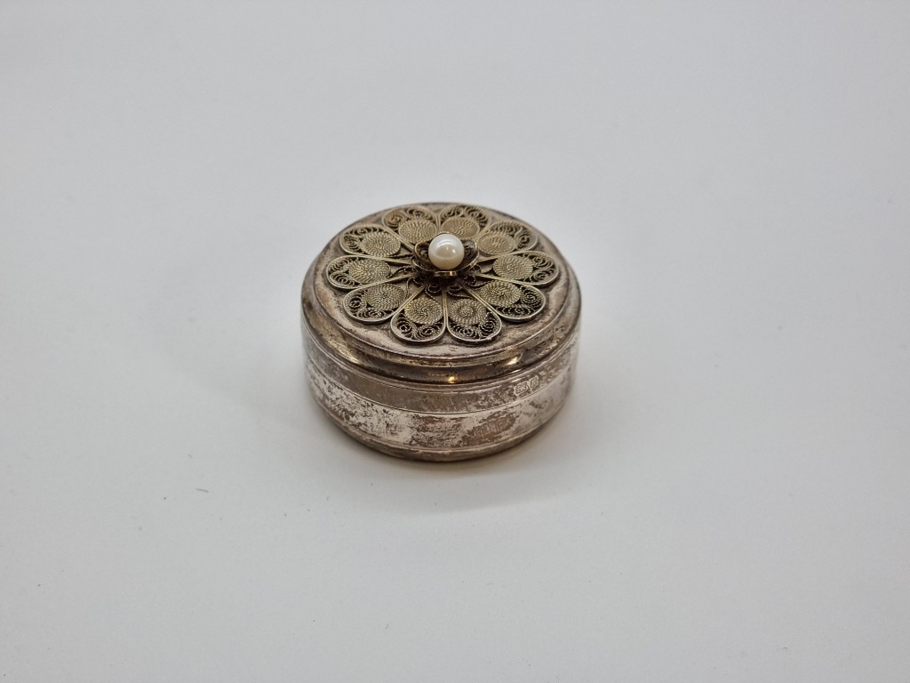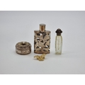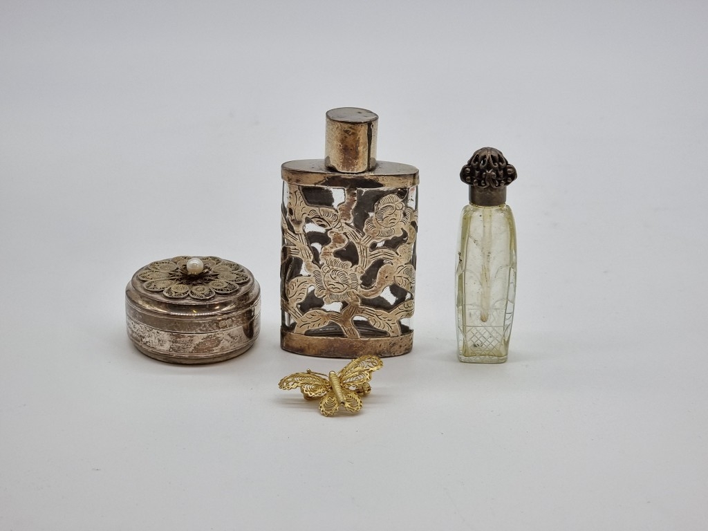 A Sterling silver mounted clear glass scent bottle and stopper, (chip to threaded collar), 7.6cm high; together with a vintage 'Chant Des Iles' scent bottle, 6.8cm high; a small silver box and cover, 4.2cm diameter, 36g; and a gilt metal filigree butterfly brooch, 3.2cm wide. (4)