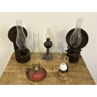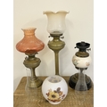 Two brass oil lamps, the tallest approx. 18 1/2" together with a ceramic reservoir example, a shade and two glass chimneys