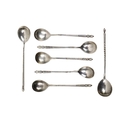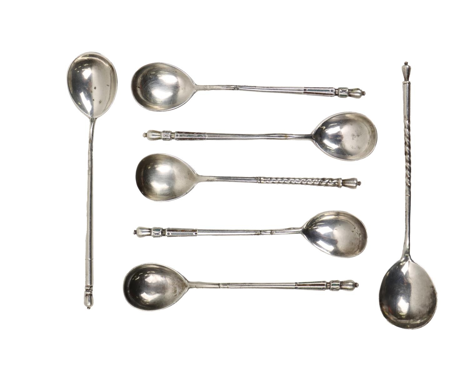A group of 7 rare 20th Century Russian (Moscow) silver Spoons, of variant designs, with turned and twist handles and finial tops, the bowl of etched design, hallmarked, approx. 3.2 ounces (total). (7)