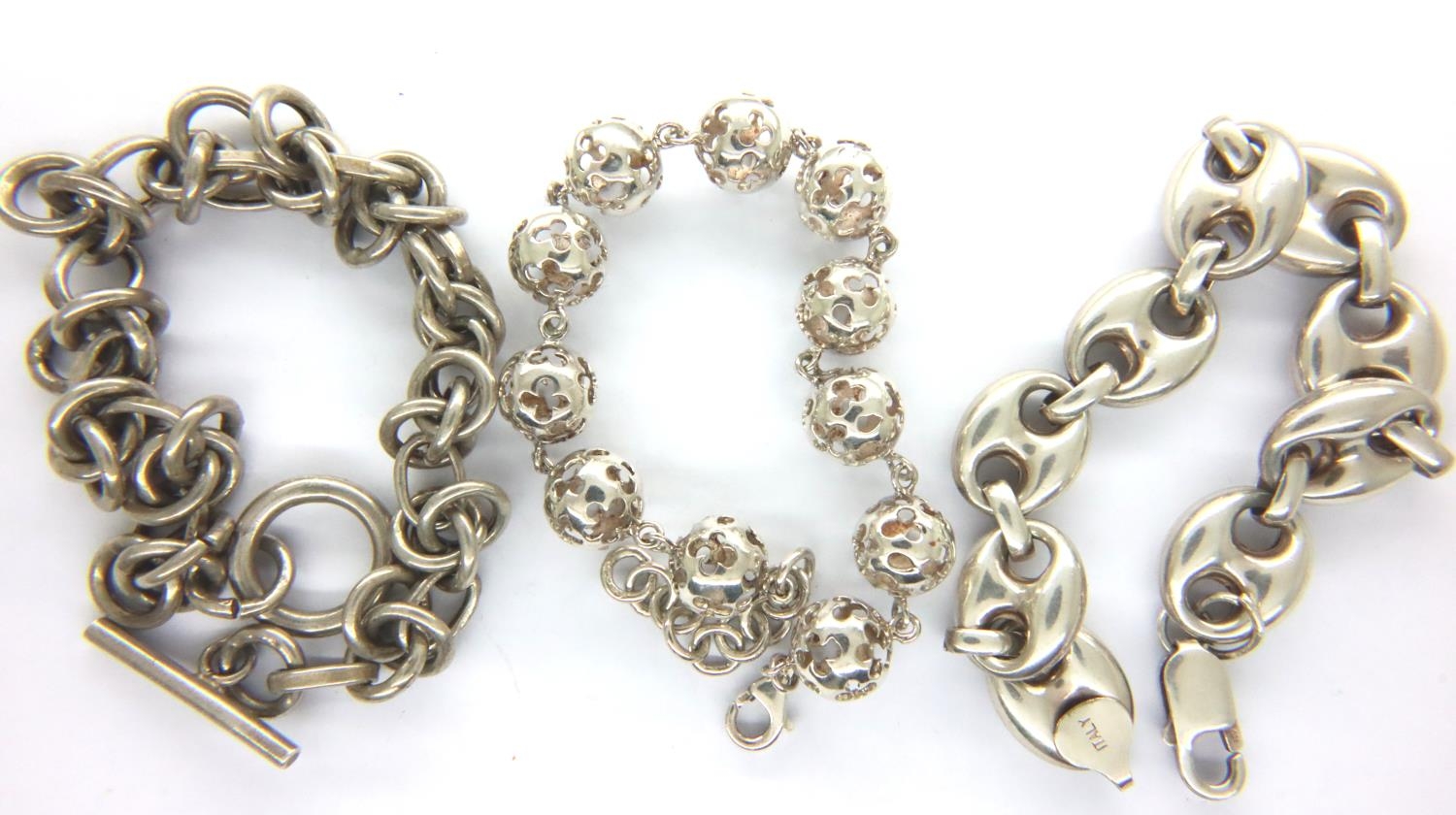 Three 925 silver bracelets of various designs to include a heavy link chain example, largest L: 22 cm, combined 61g. P&P Group 1 (£14+VAT for the first lot and £1+VAT for subsequent lots)
