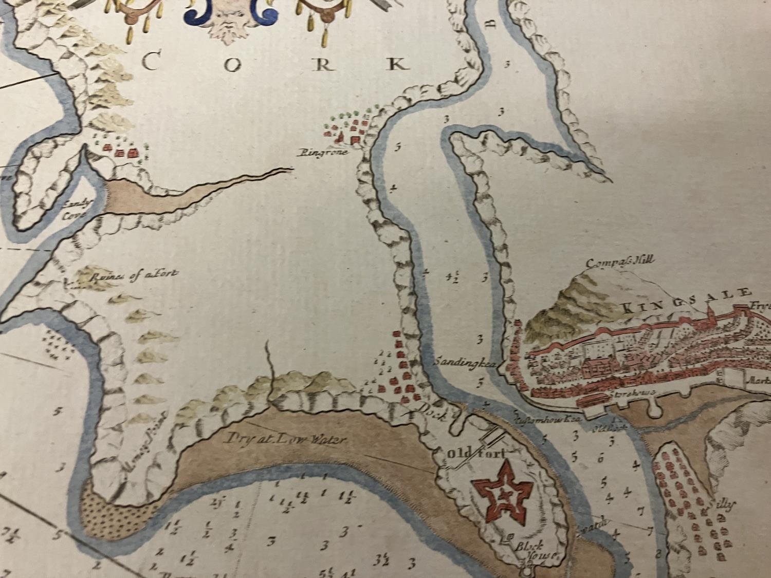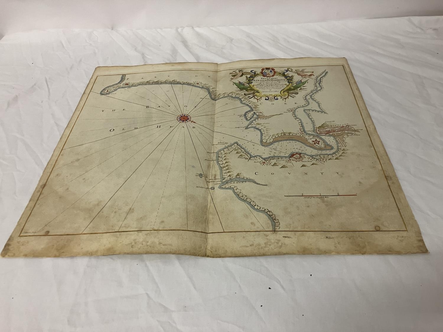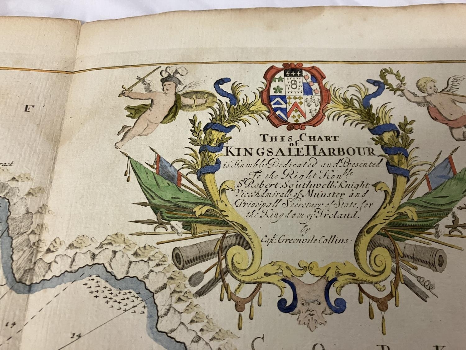 An antique chart of Kingsale Harbour dedicated and presented to Sir Robert Southwell by Cpt. Greenvile Collins. 52cm x 60cm.
