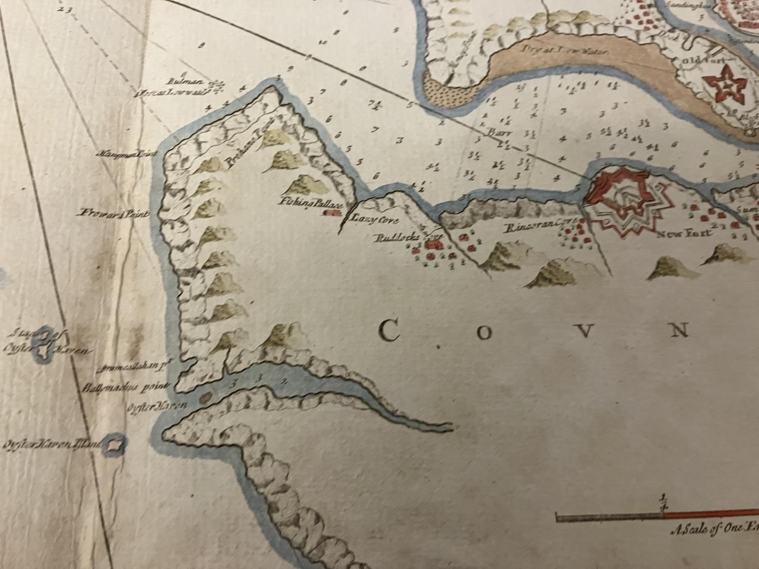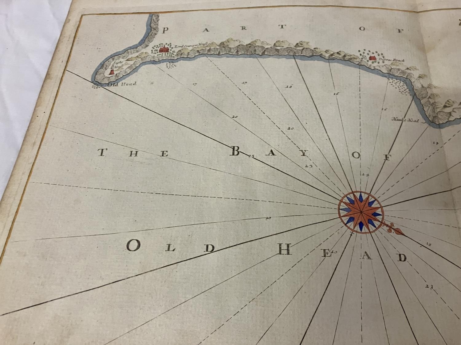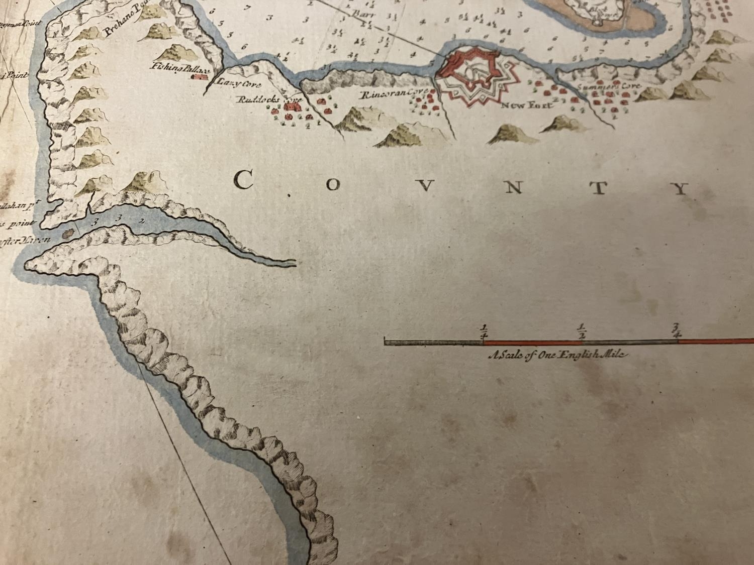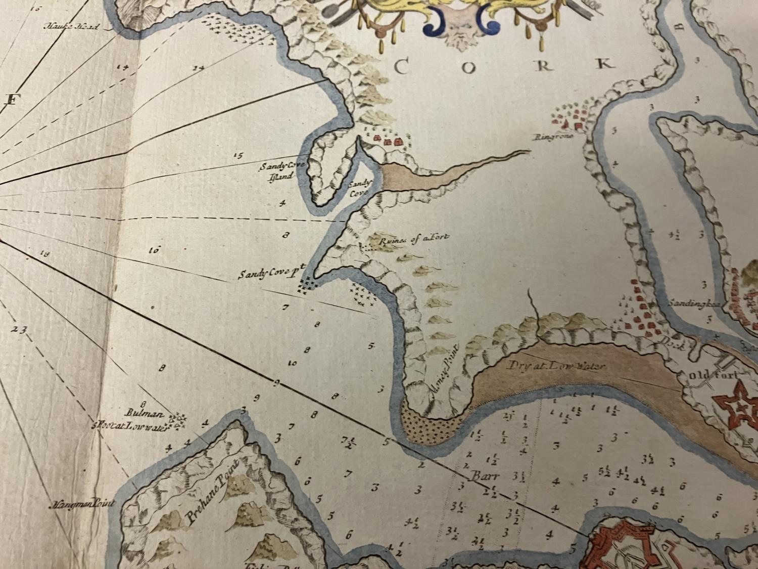An antique chart of Kingsale Harbour dedicated and presented to Sir Robert Southwell by Cpt. Greenvile Collins. 52cm x 60cm.